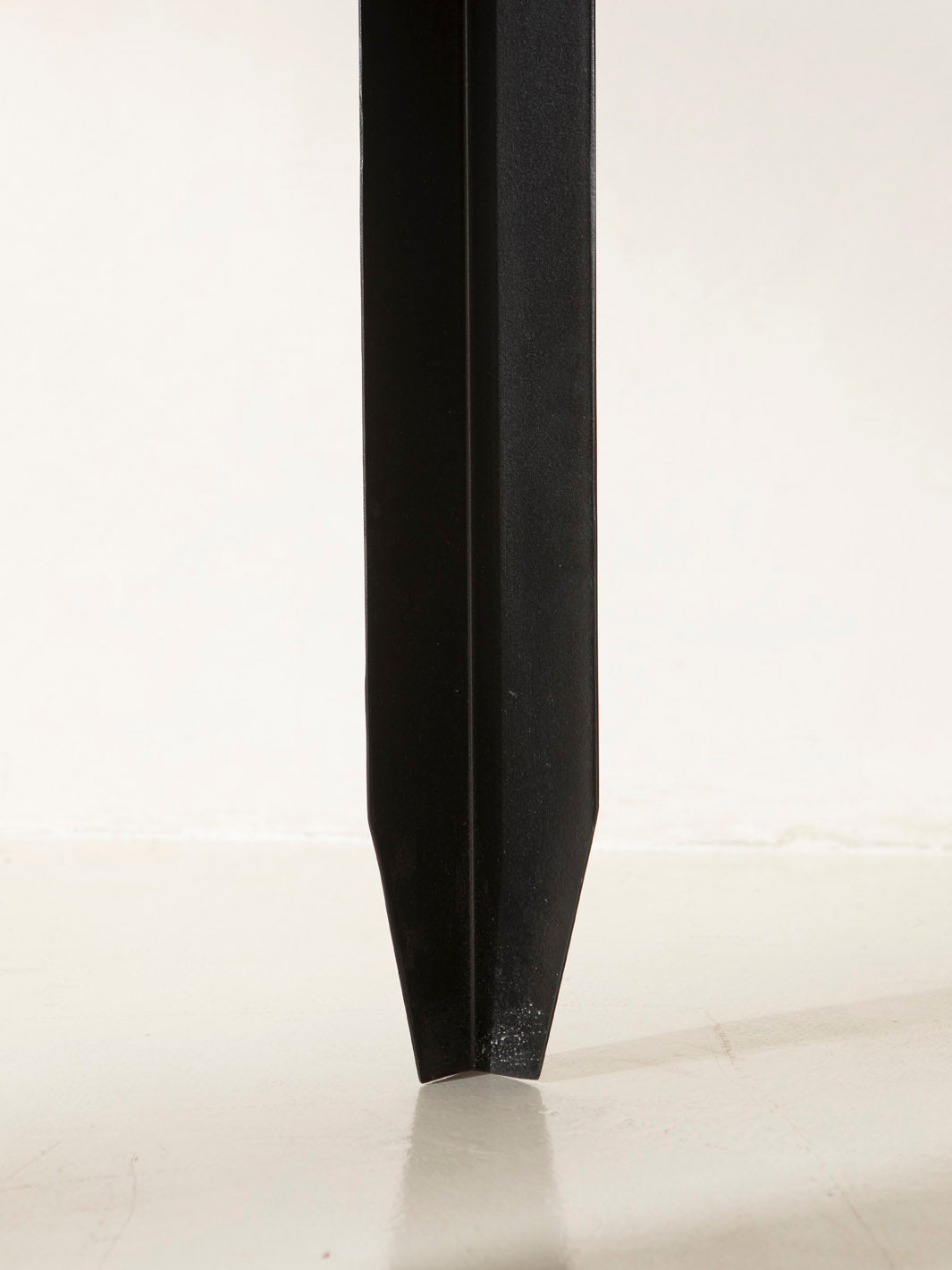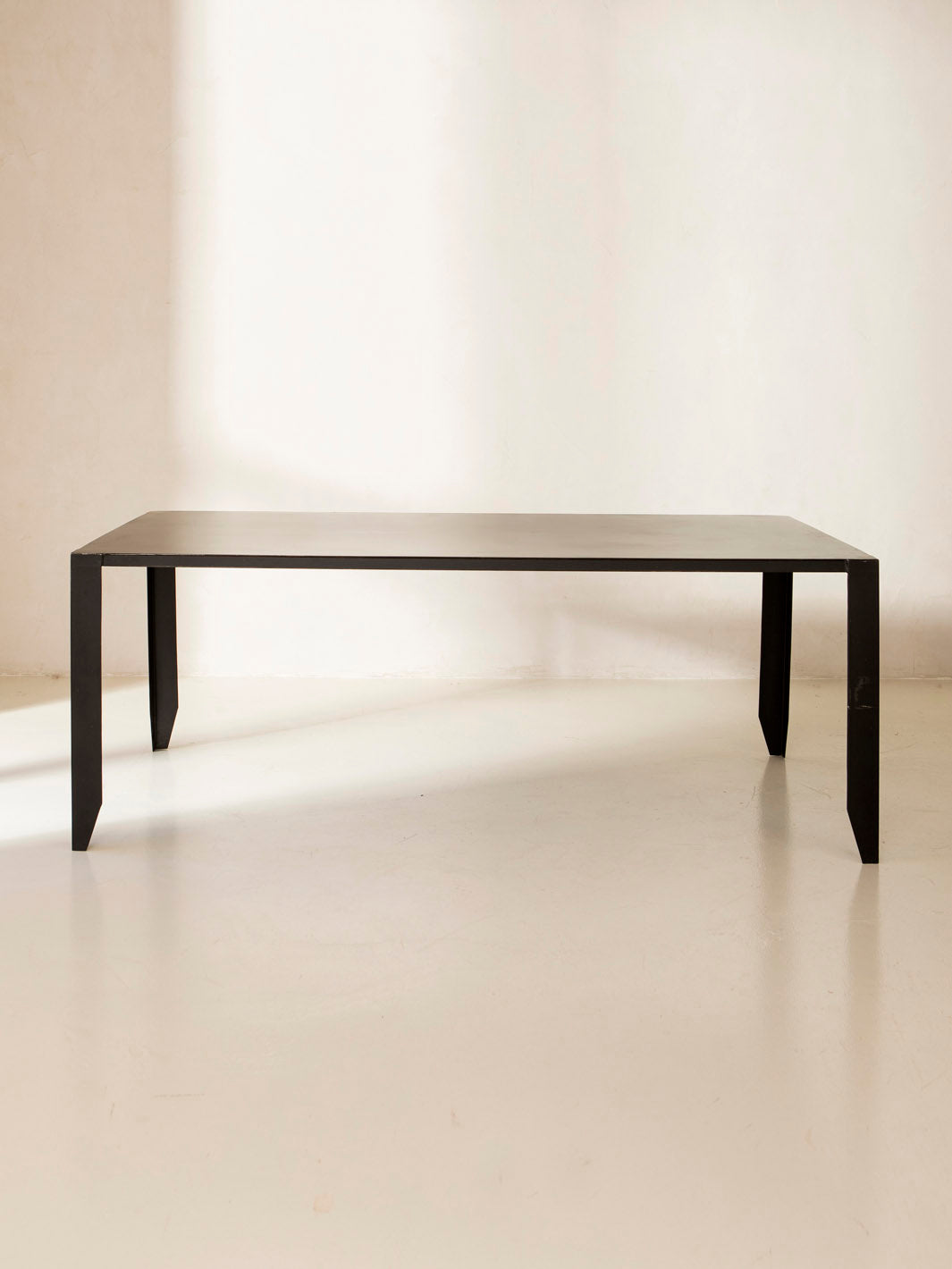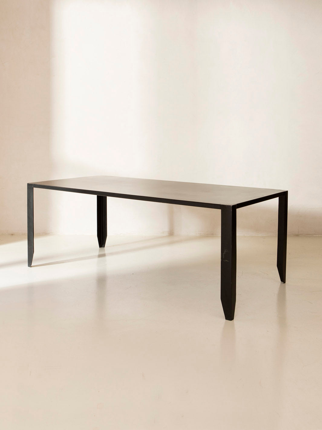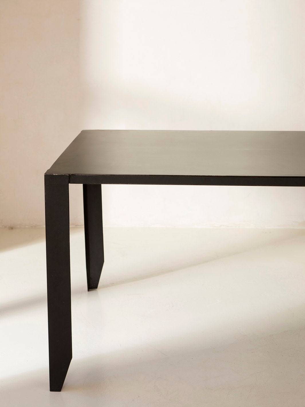 Mesa de comedor negra trabajada en metal con escultórico pie geométrico.