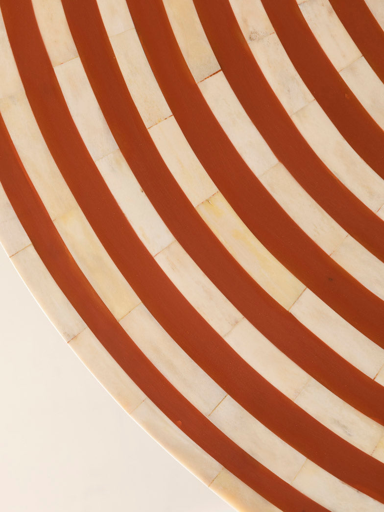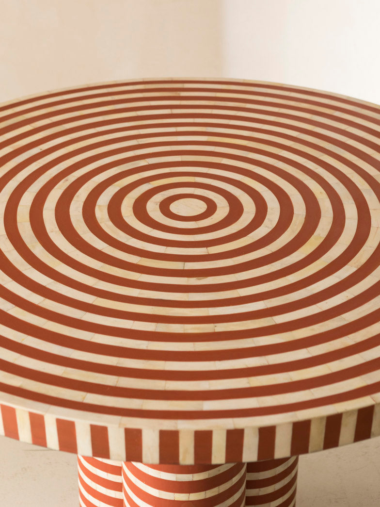Mesa artesanal marroquí trabajada sobre una base madera de olivo, revestida con una minuciosa técnica de marquetería de hueso y resina, sobre un imponente pie tríptico.