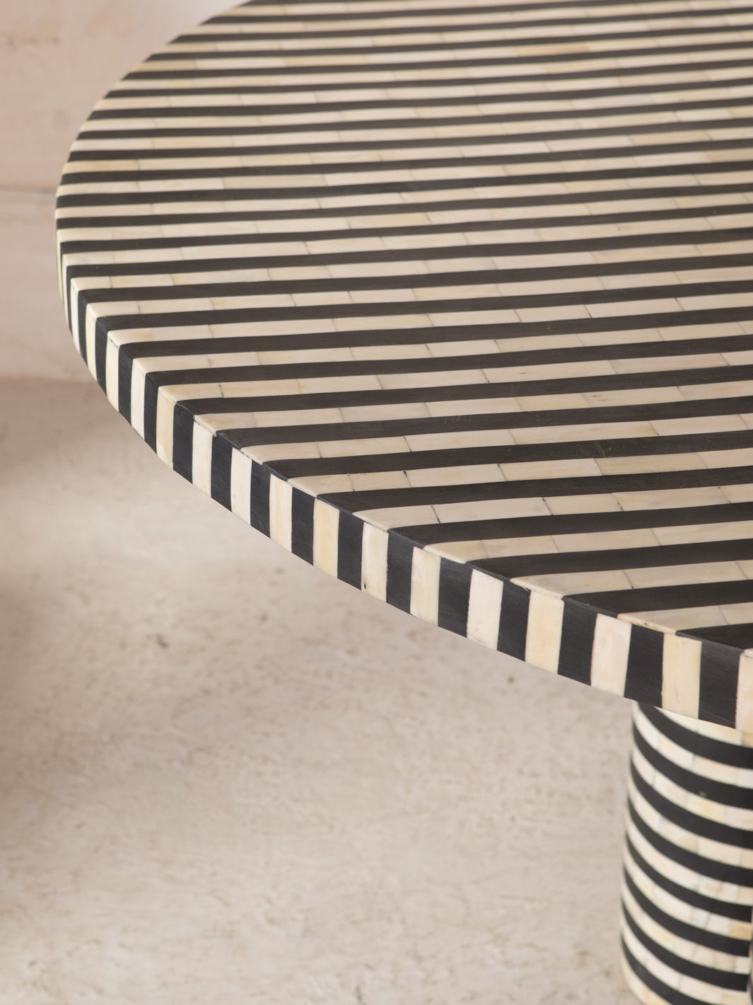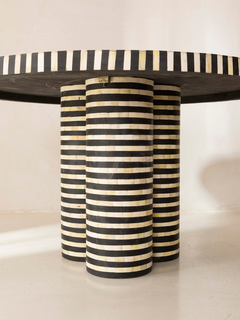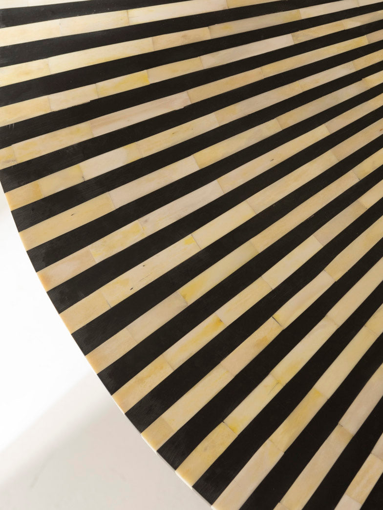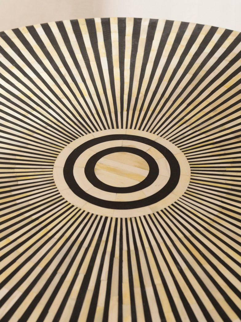 Mesa artesanal africana trabajada sobre una base madera de olivo, revestida con una minuciosa técnica de marquetería de hueso y resina, sobre un imponente pie tríptico.