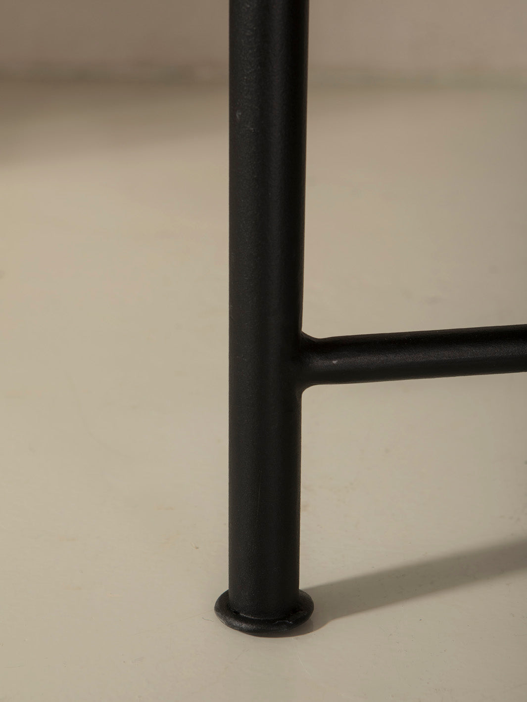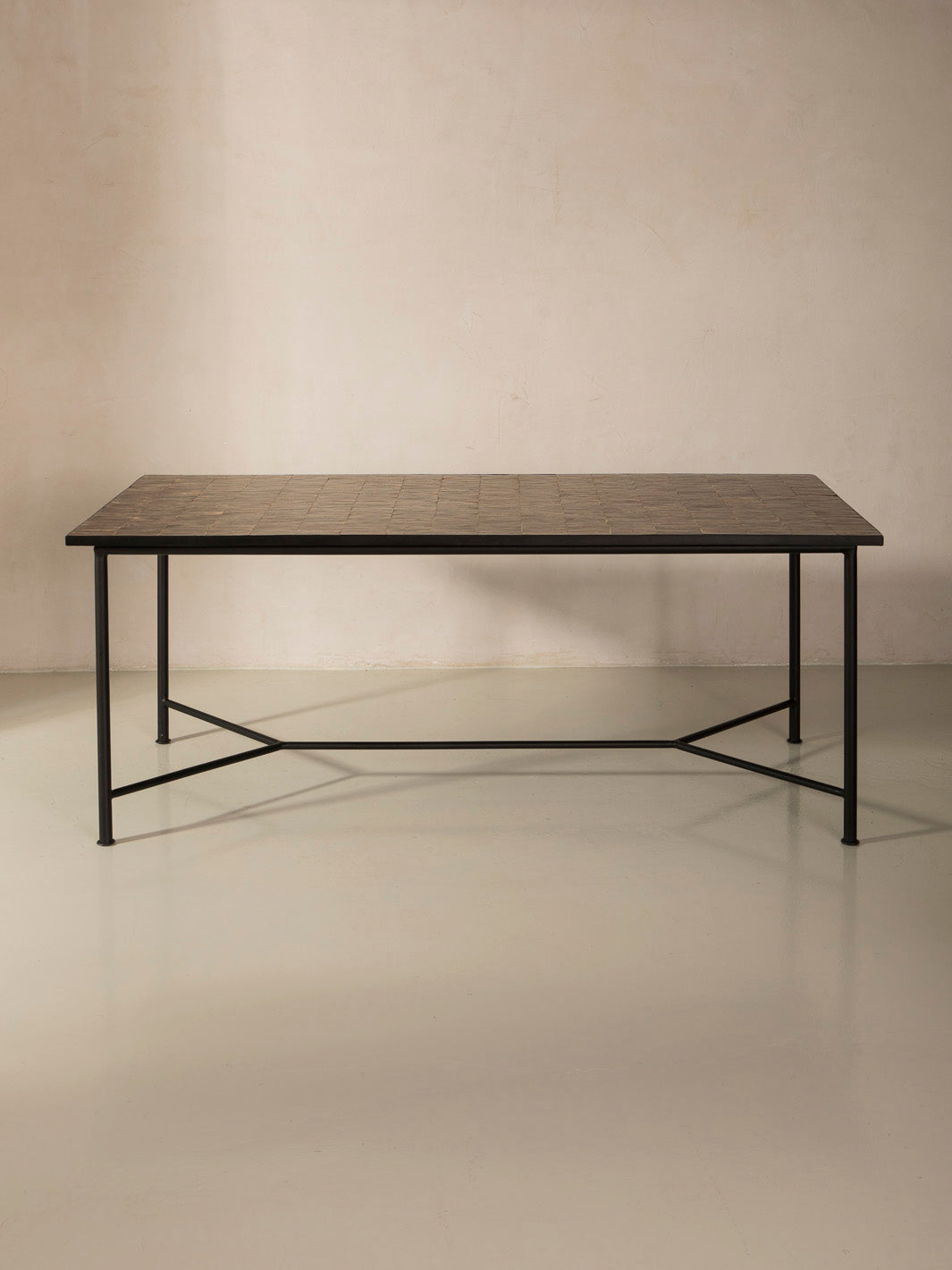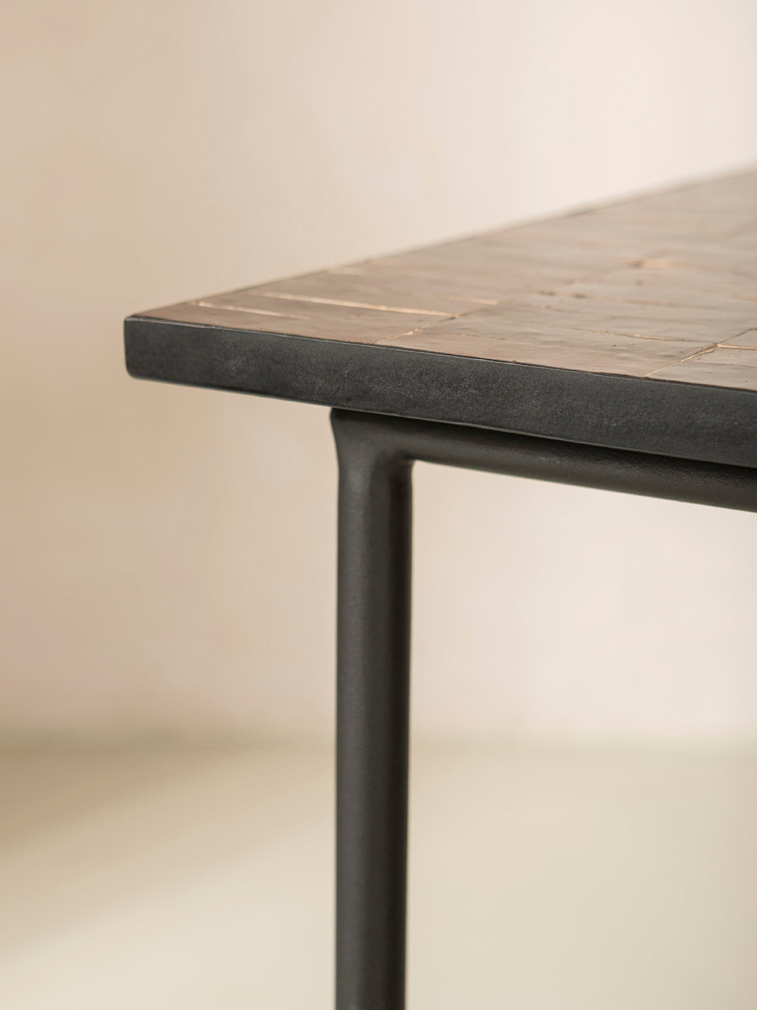 La base de hierro forjado de líneas depuradas y estructura ligera aporta una sensación de ligereza y contraste, enmarcando la riqueza del zellige con una estética sobria y atemporal.