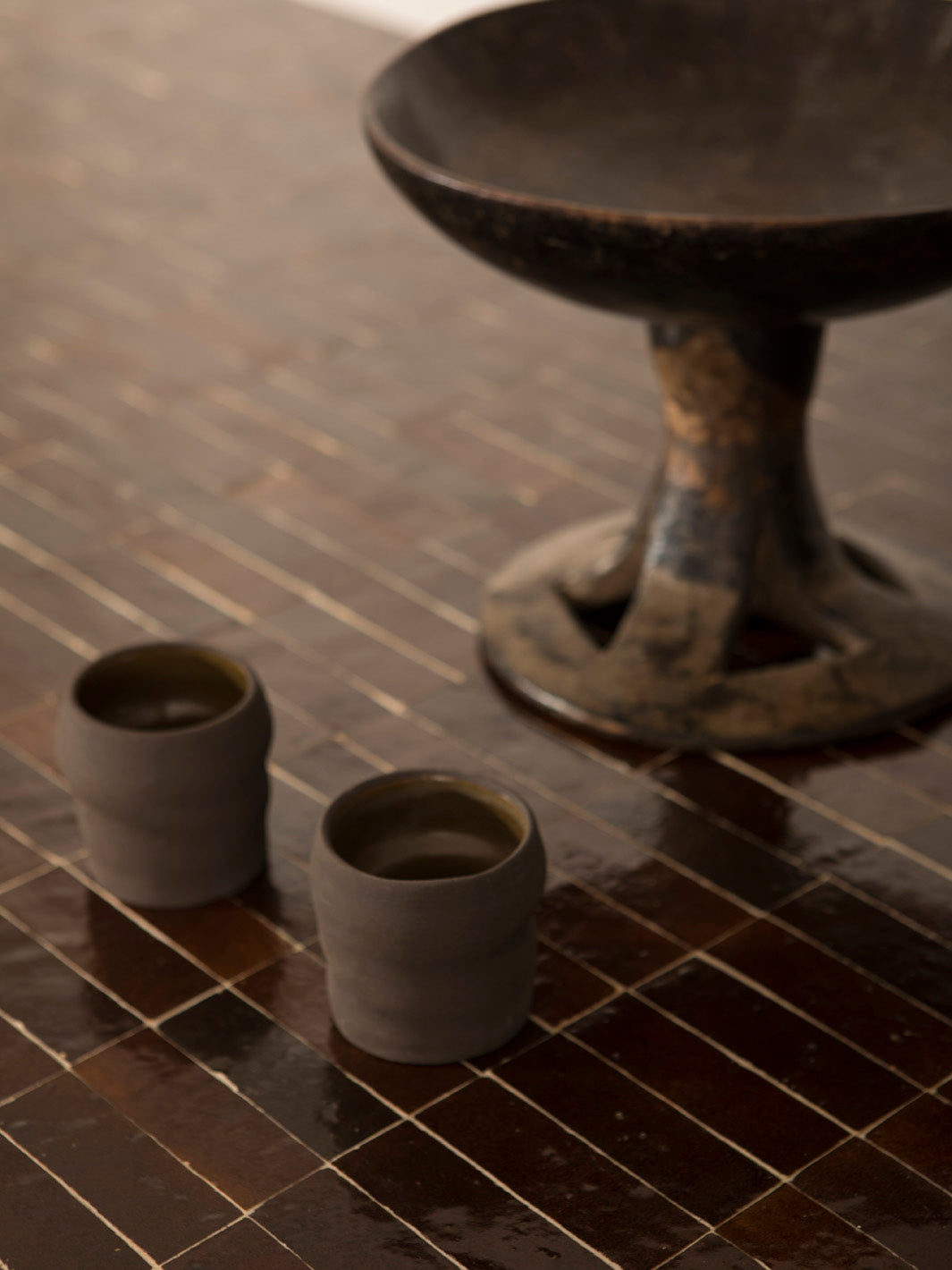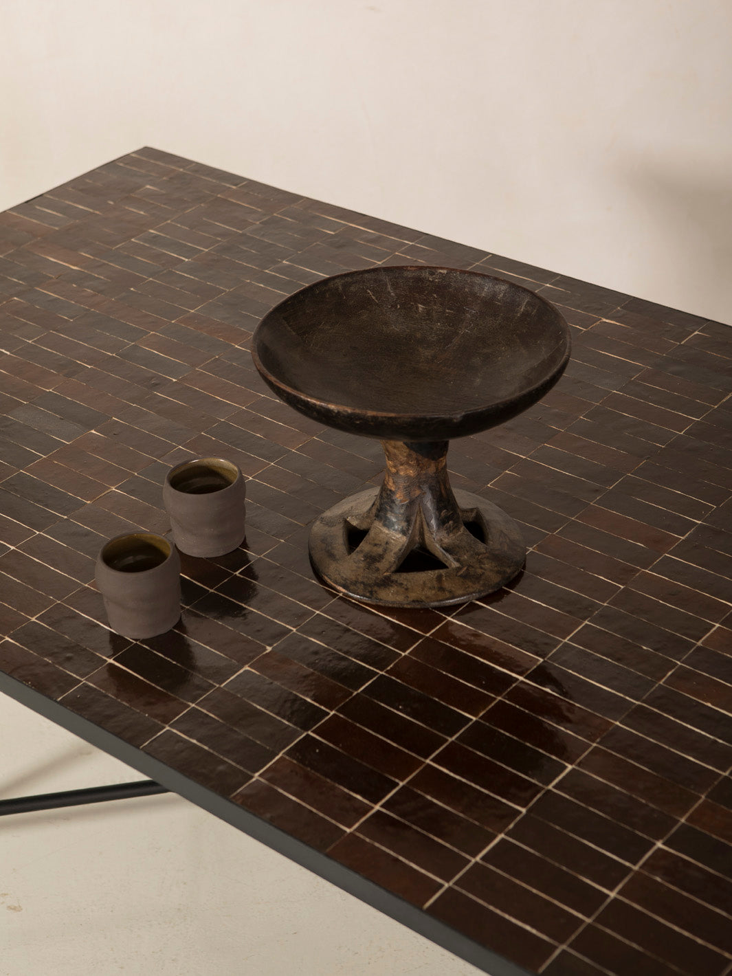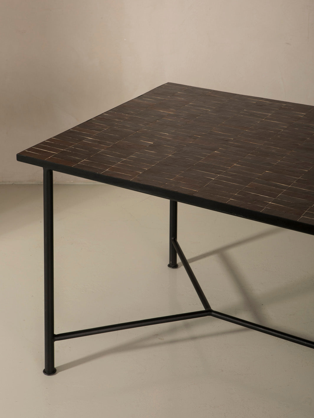 Una pieza que encarna la elegancia imperfecta del trabajo manual y el equilibrio entre tradición y diseño contemporáneo. El sobre de esta mesa está compuesto por teselas de zellige elaboradas a mano, una a una, con arcilla natural, esmaltadas y cortadas con precisión artesanal. El resultado es una superficie vibrante, llena de matices, donde la luz se refleja de forma sutil y cambiante.