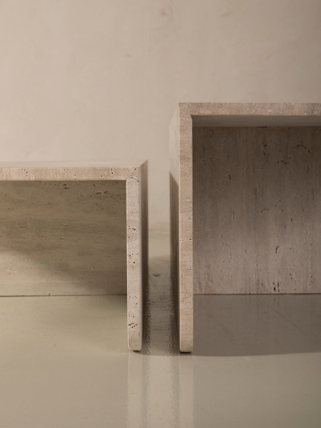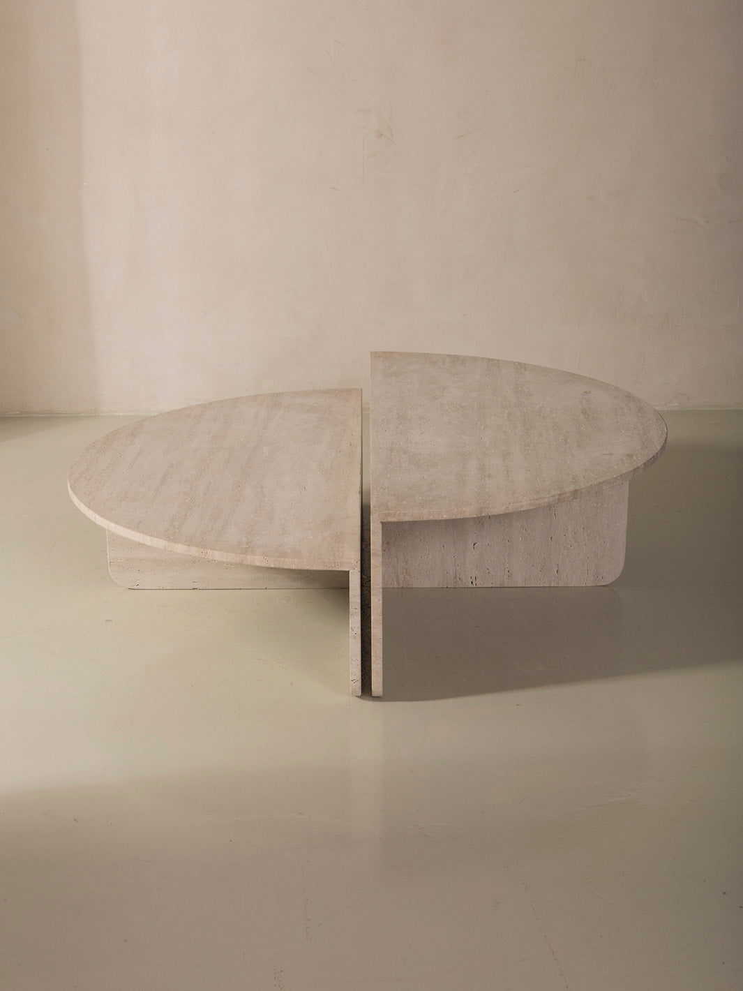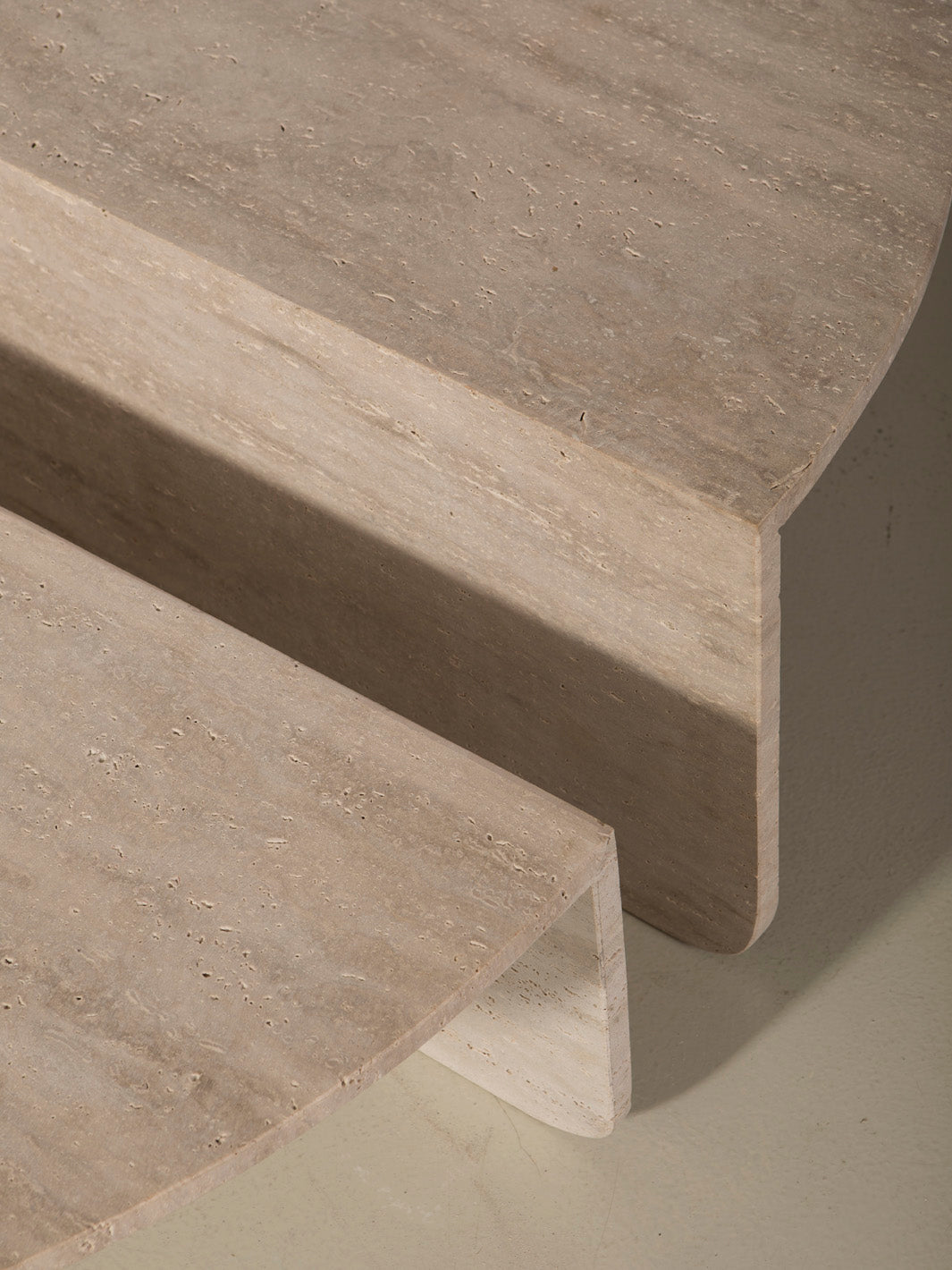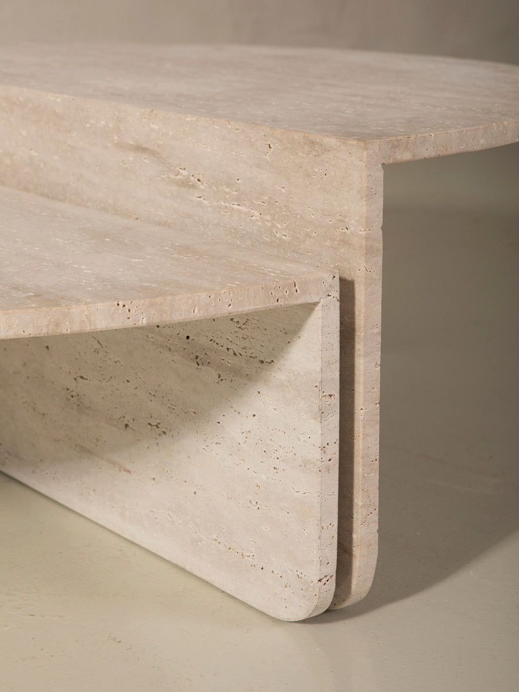 Esta mesa auxiliar de travertino, elaborada artesanalmente, es una auténtica pieza escultórica que fusiona funcionalidad y arte. Su diseño geométrico y simétrico resalta la belleza natural de la piedra, con vetas y texturas únicas que hacen de cada unidad una obra irrepetible. La solidez del travertino se combina con una estética minimalista y elegante. Ideal como punto focal en un espacio, esta mesa es una declaración de estilo y saber hacer artesanal.