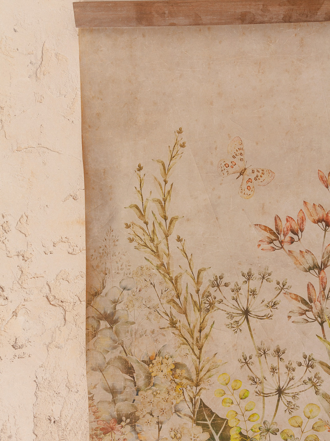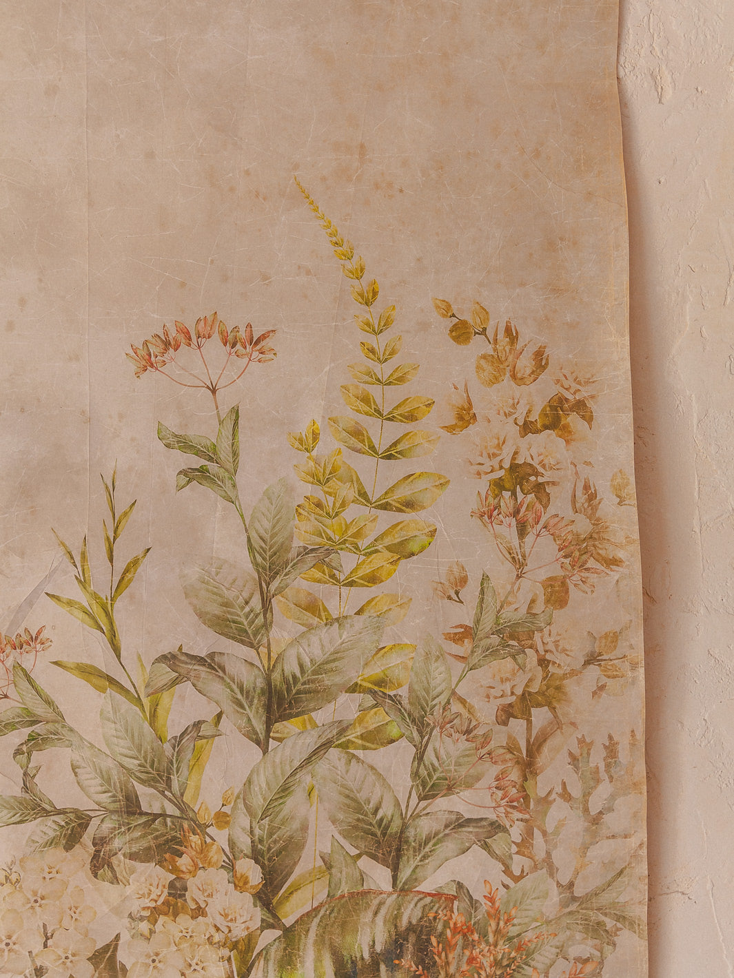 Mural estampado sobre un delicado papel reciclado efecto pergamino. El papel ha sido tratado para darle un aspecto envejecido y una delicada textura formando pliegues y rugosidad. Se trata de una edición limitada. Viene con bastidor de madera para poder colgar.