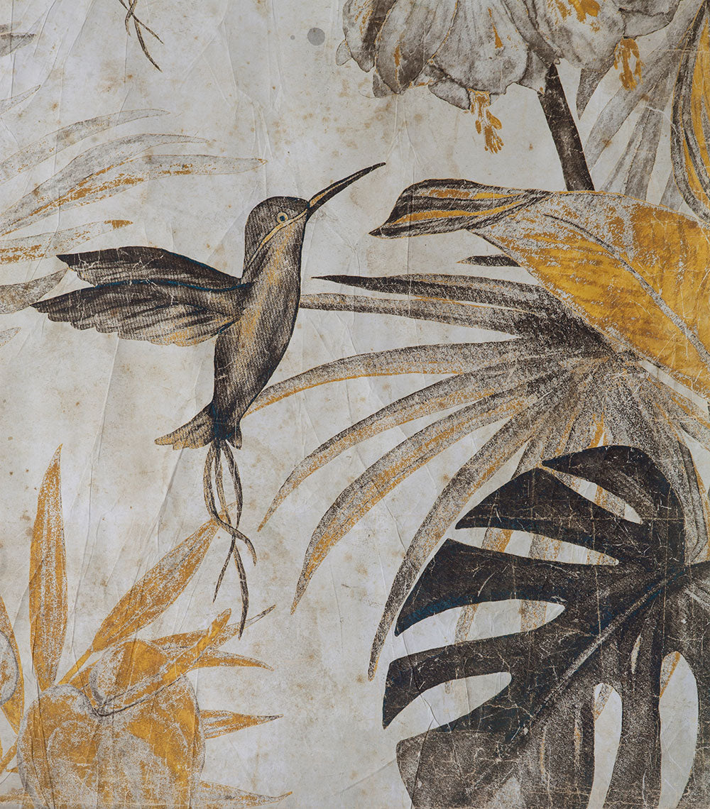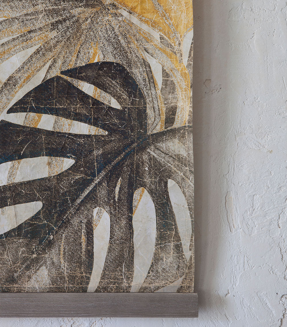Mural estampado sobre un delicado papel reciclado efecto pergamino. El papel ha sido tratado para darle un aspecto envejecido y una delicada textura formando pliegues y rugosidad. Se trata de una edición limitada. Viene con bastidor de madera para poder colgar.