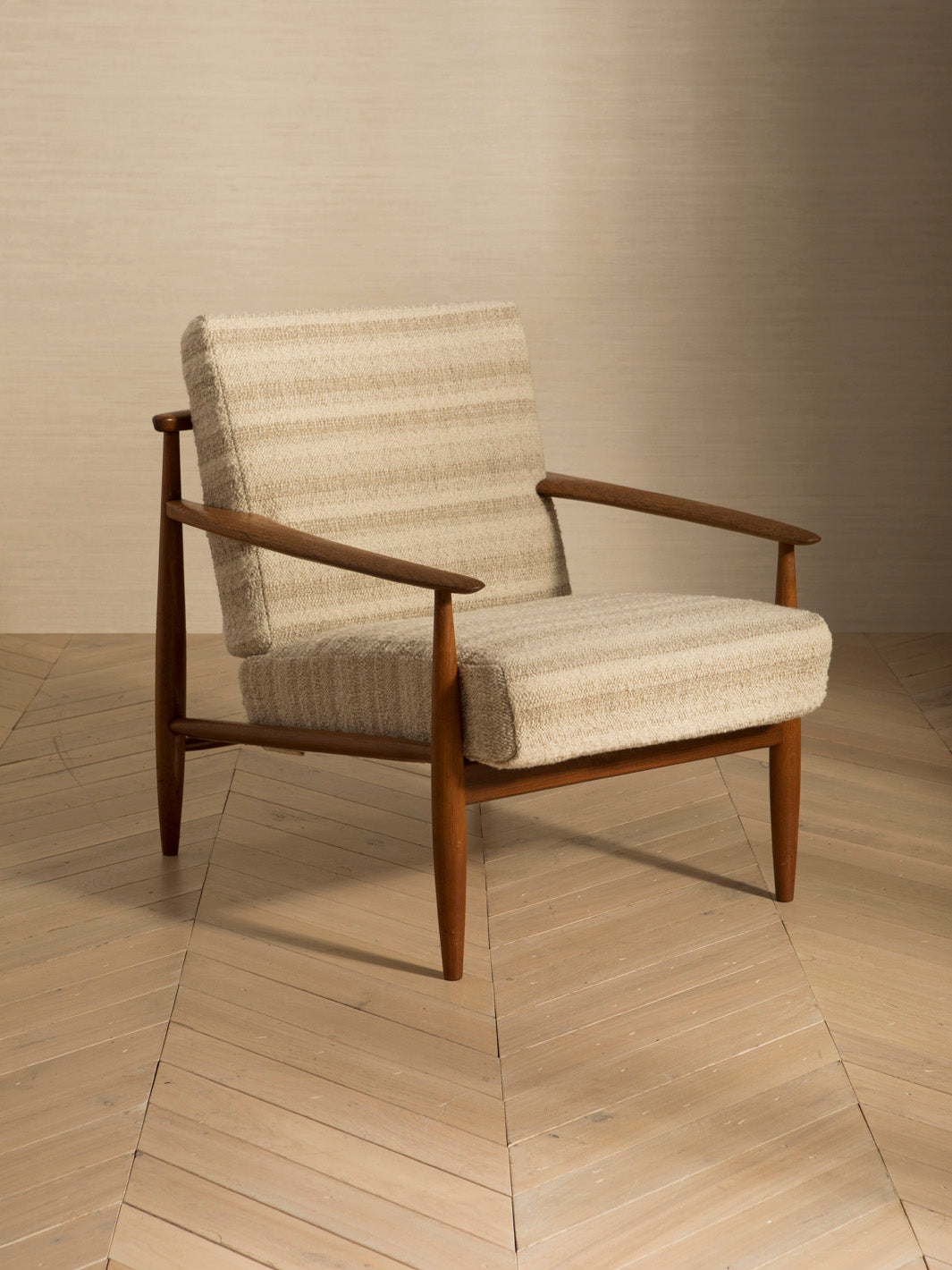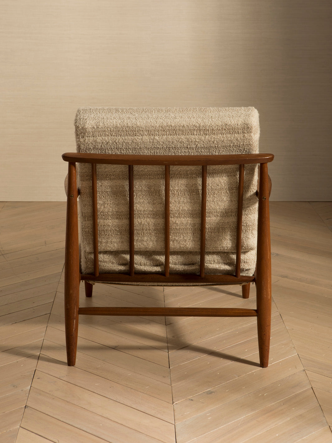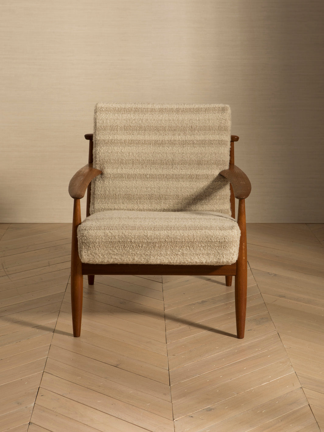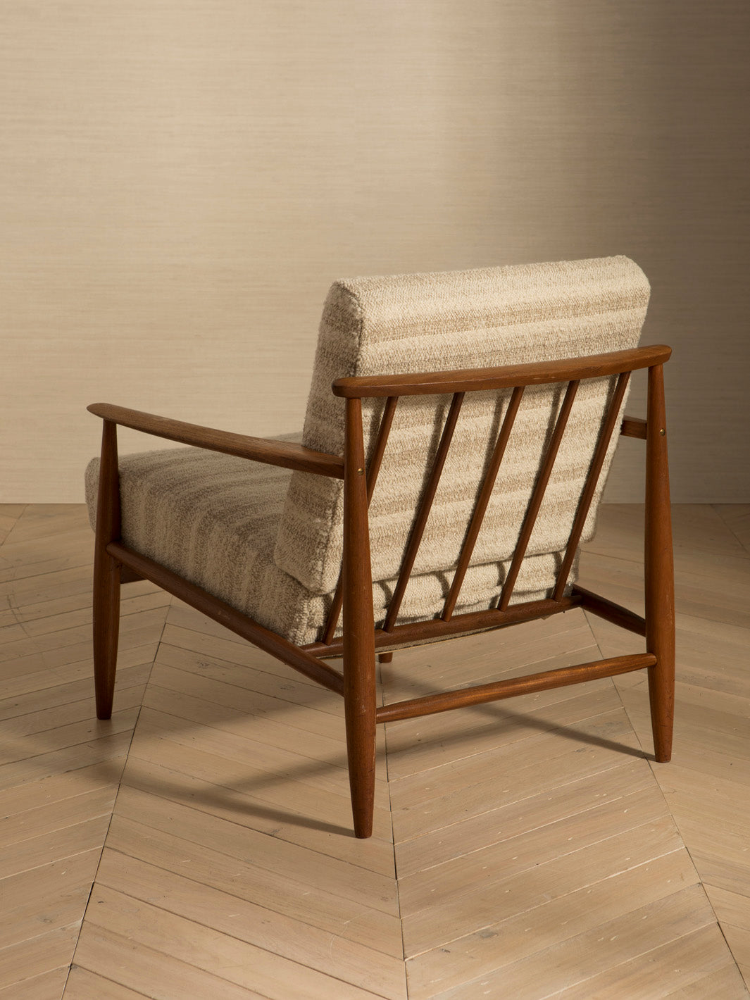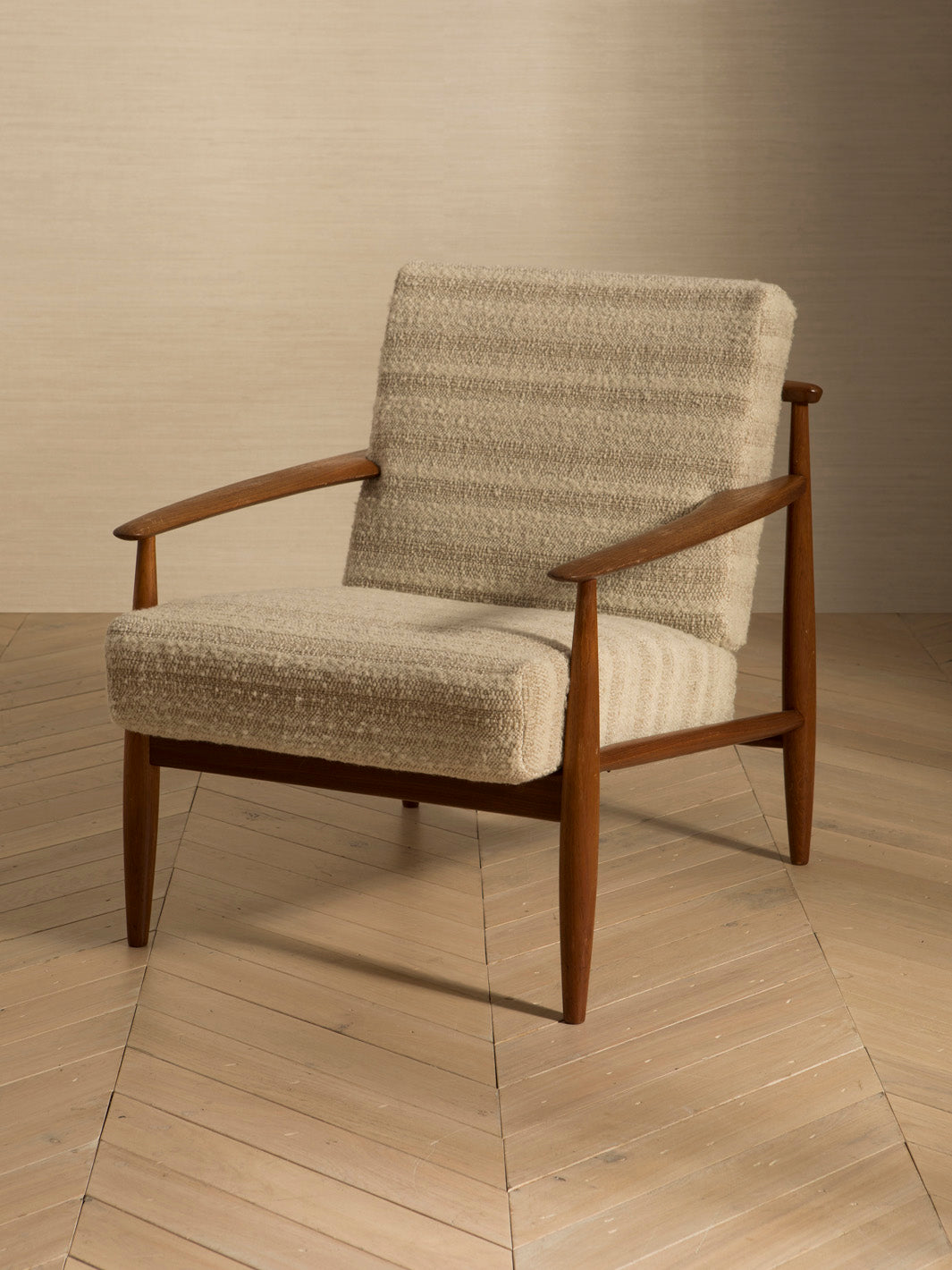 Fabricadas en teca maciza, con su característico tono cálido y veta rica, sus estructuras revelan un trabajo de carpintería fino y funcional. Los brazos suavemente curvados y las patas torneadas aportan una presencia ligera pero sólida, típica del diseño danés más puro. Tapicería de lana y algodón.