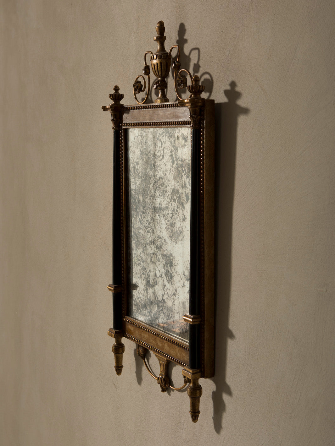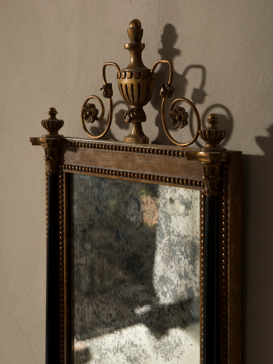 Esta exquisita pareja de espejos decorativos de la Maison Jansen, creado en la década de 1950, es un ejemplo perfecto del refinamiento neoclásico reinterpretado con la sofisticación del diseño del siglo XX. Con una estructura de madera dorada y detalles de inspiración imperial, destaca por su remate superior en forma de urna flanqueada por volutas florales, columnas laterales acanaladas en negro y una base decorativa sutilmente ornamentada.