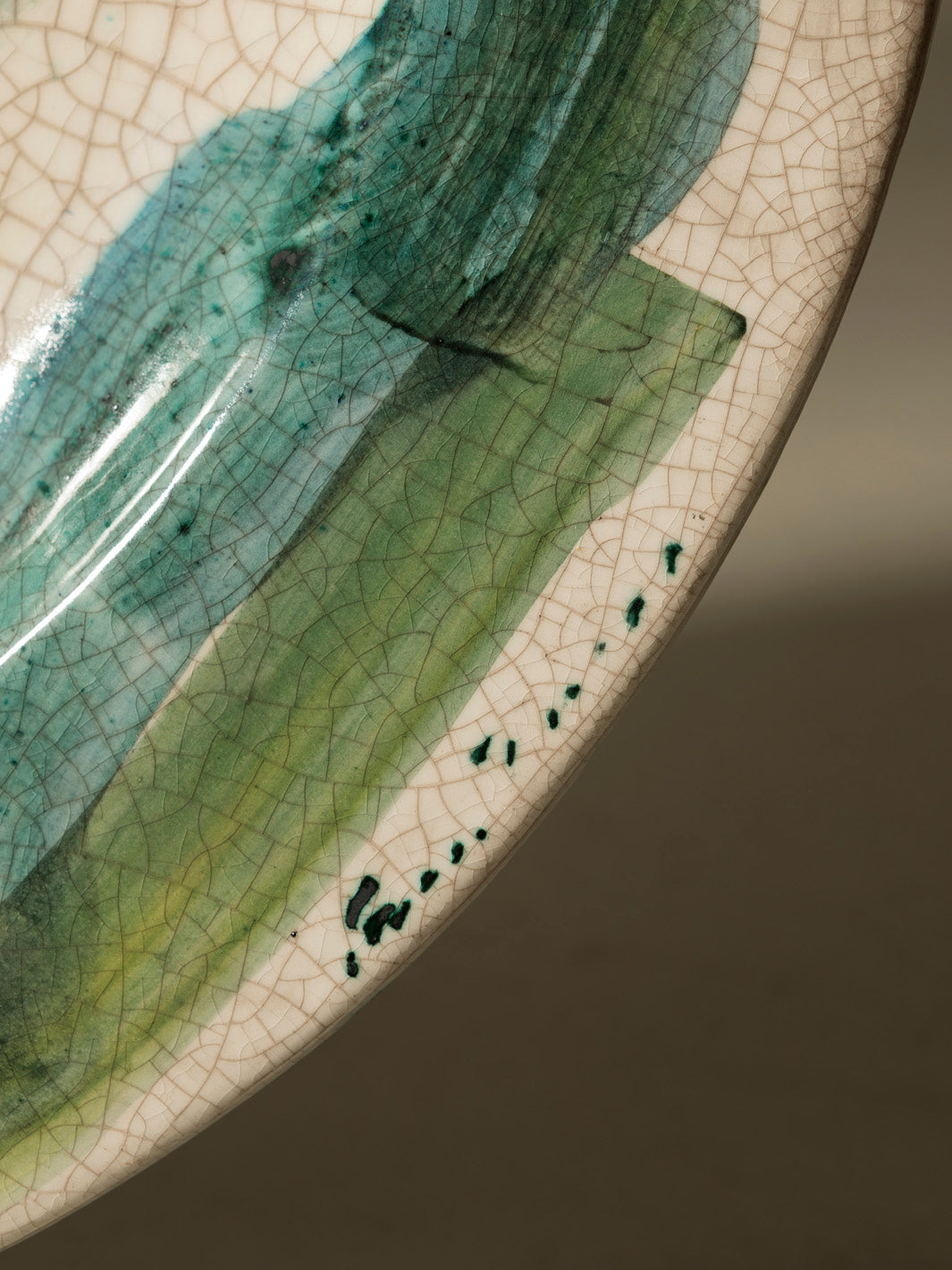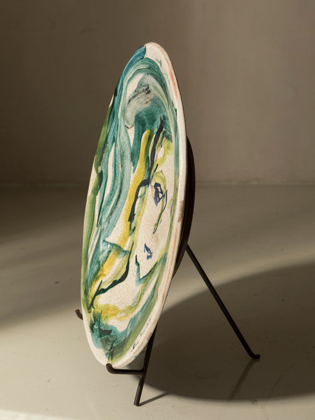 Treccani trasladó su lenguaje artístico al mundo de la cerámica en una serie de creaciones vibrantes, llenas de color, gesto y movimiento. Sus platos, decorados a mano, capturan escenas líricas, figuras humanas estilizadas y motivos abstractos que evocan tanto el arte moderno como las raíces populares italianas. Son fragmentos de historia, cargados de sensibilidad y significado.
