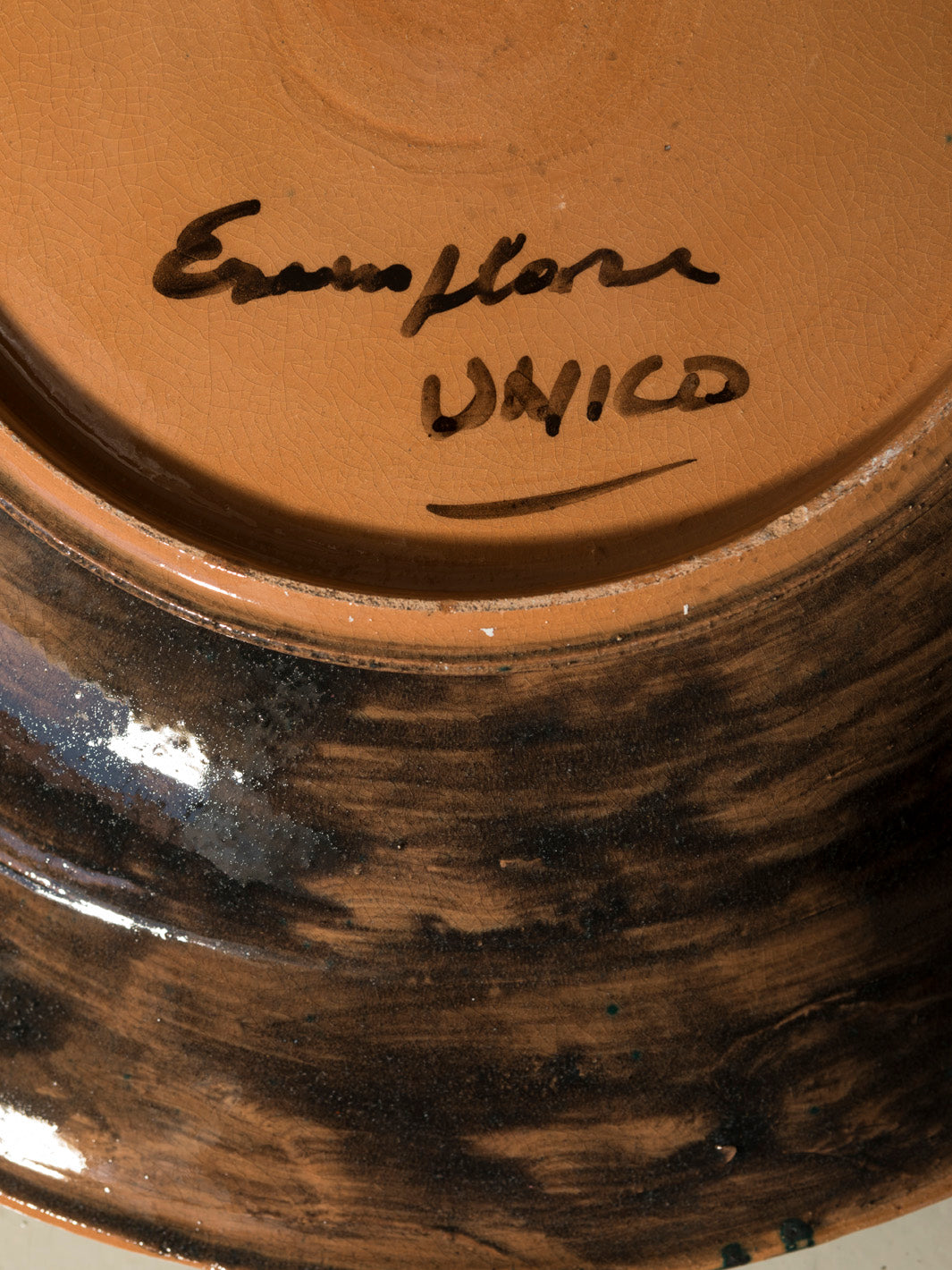 Plato de cerámica de G. Rossicone "Donna, Bambino e Fiore" del artista italiano Ernesto Treccani original de los años 70. Cada pieza es una obra original, diseñada por el célebre pintor y escultor, fundador del movimiento Corrente, cuya pasión por la humanidad y la libertad se refleja en cada trazo.