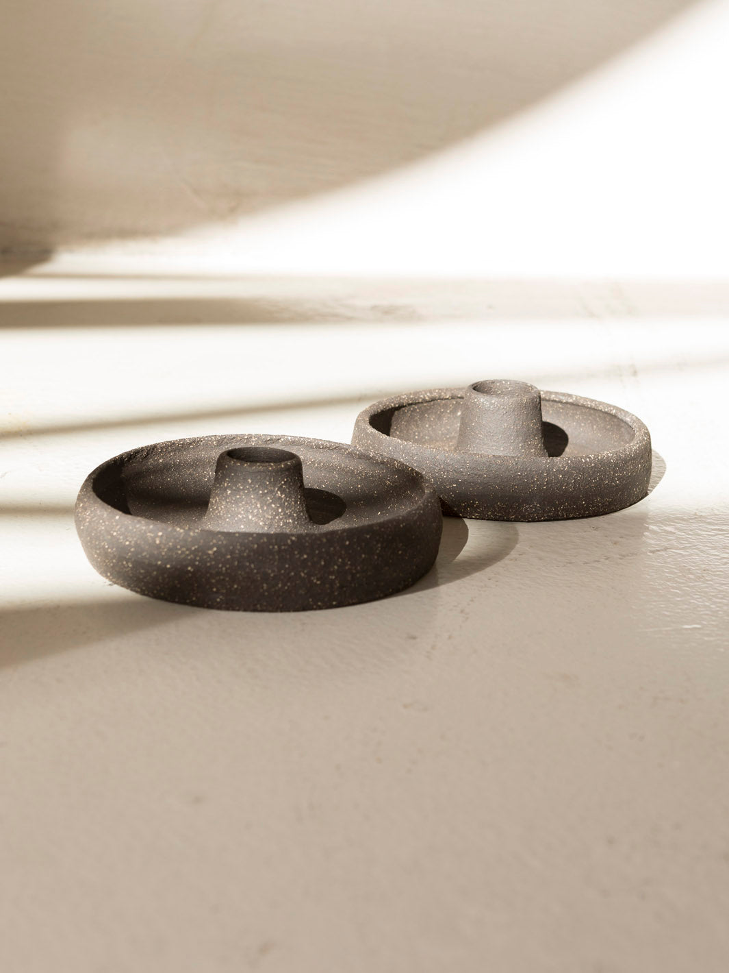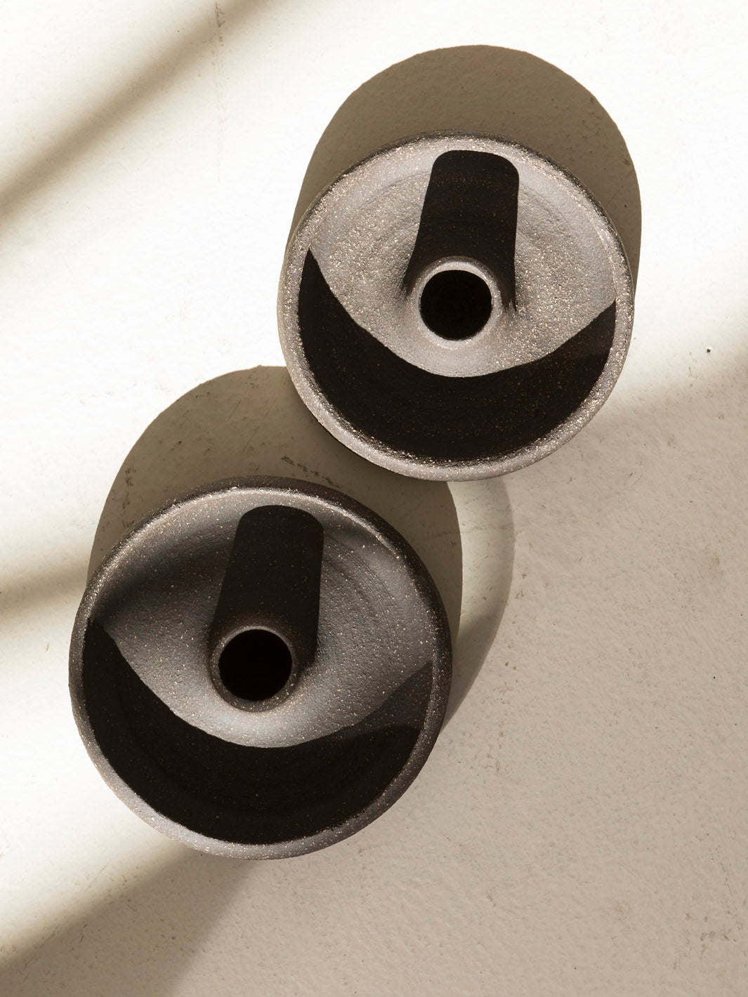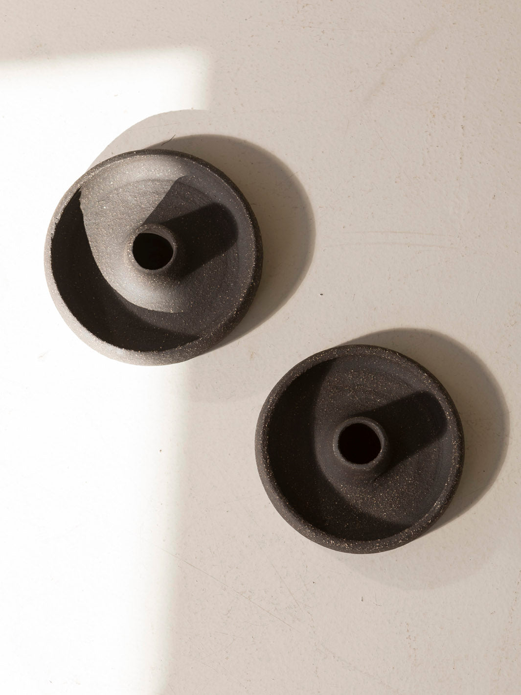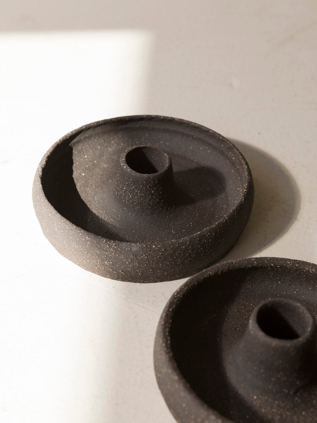 Creación artesanal de cerámica color negro, diseñado en exclusiva por Omé Studios para RV74, que sirve tanto de candelabro como de porta palosanto.