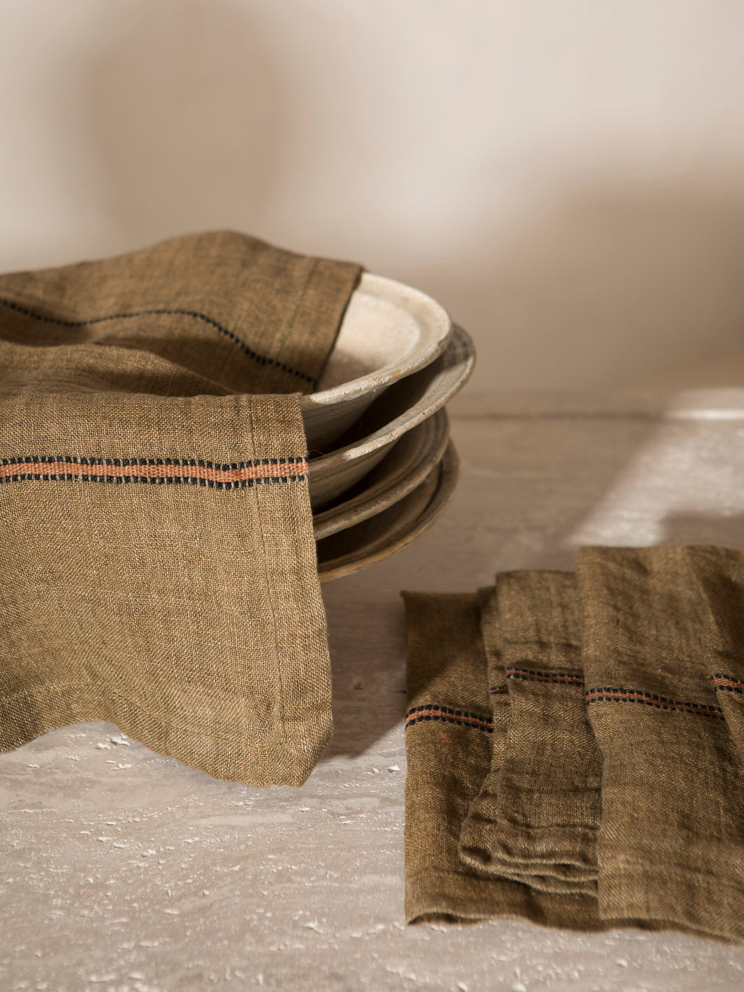 Esta servilleta de tejido abierto, tienen un aspecto tejido a mano y detalles de hilo especiales. Franja de bronce: franjas negras y óxido/negro sobre un fondo de bronce.