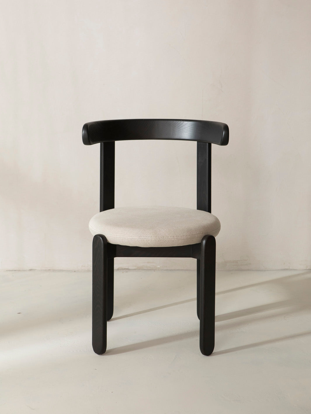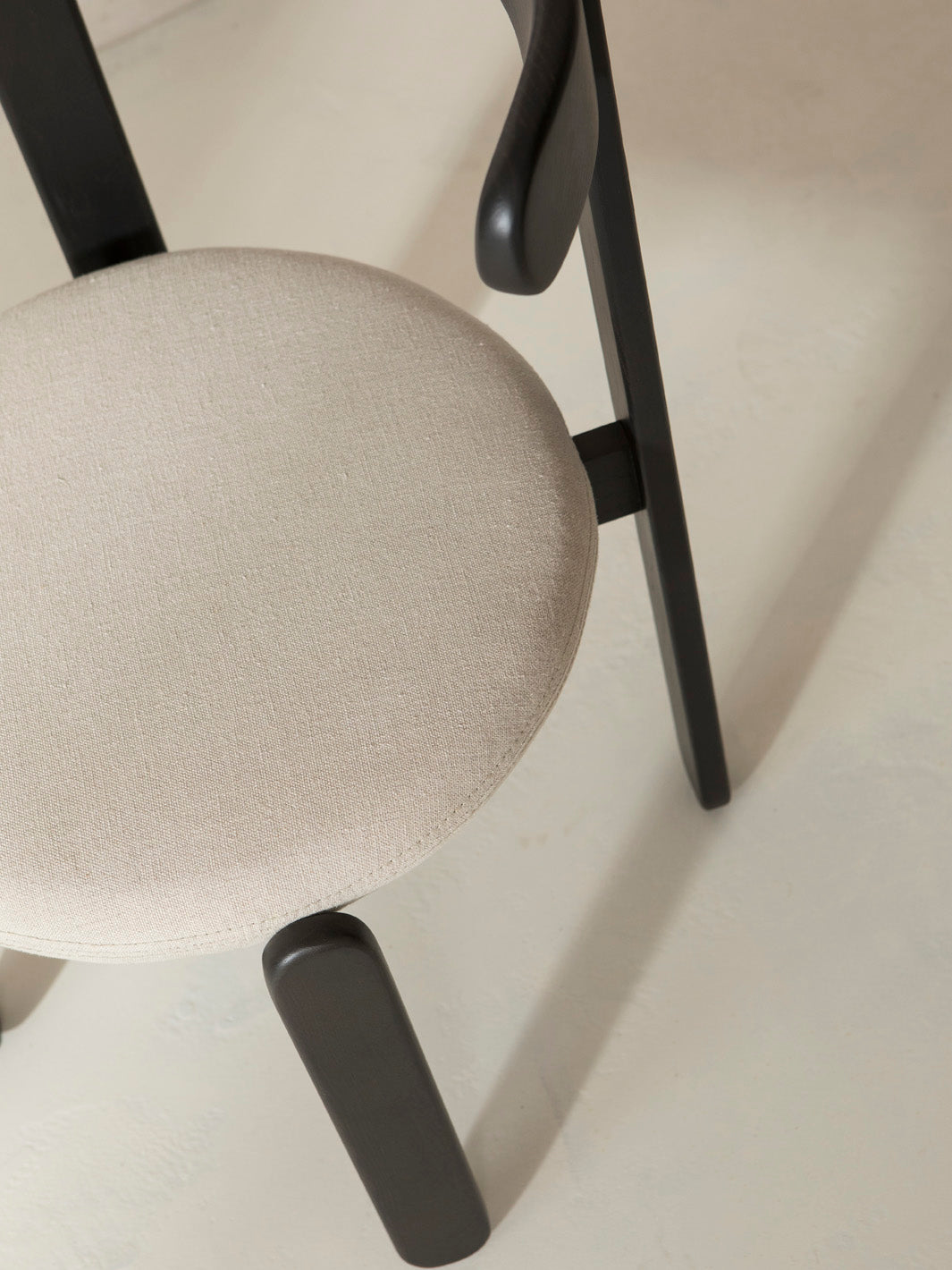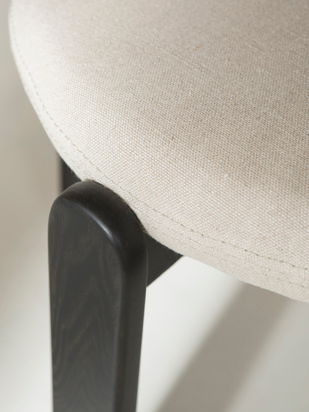 Silla de fresno con acabado lacado negro y revestimiento de lino natural.