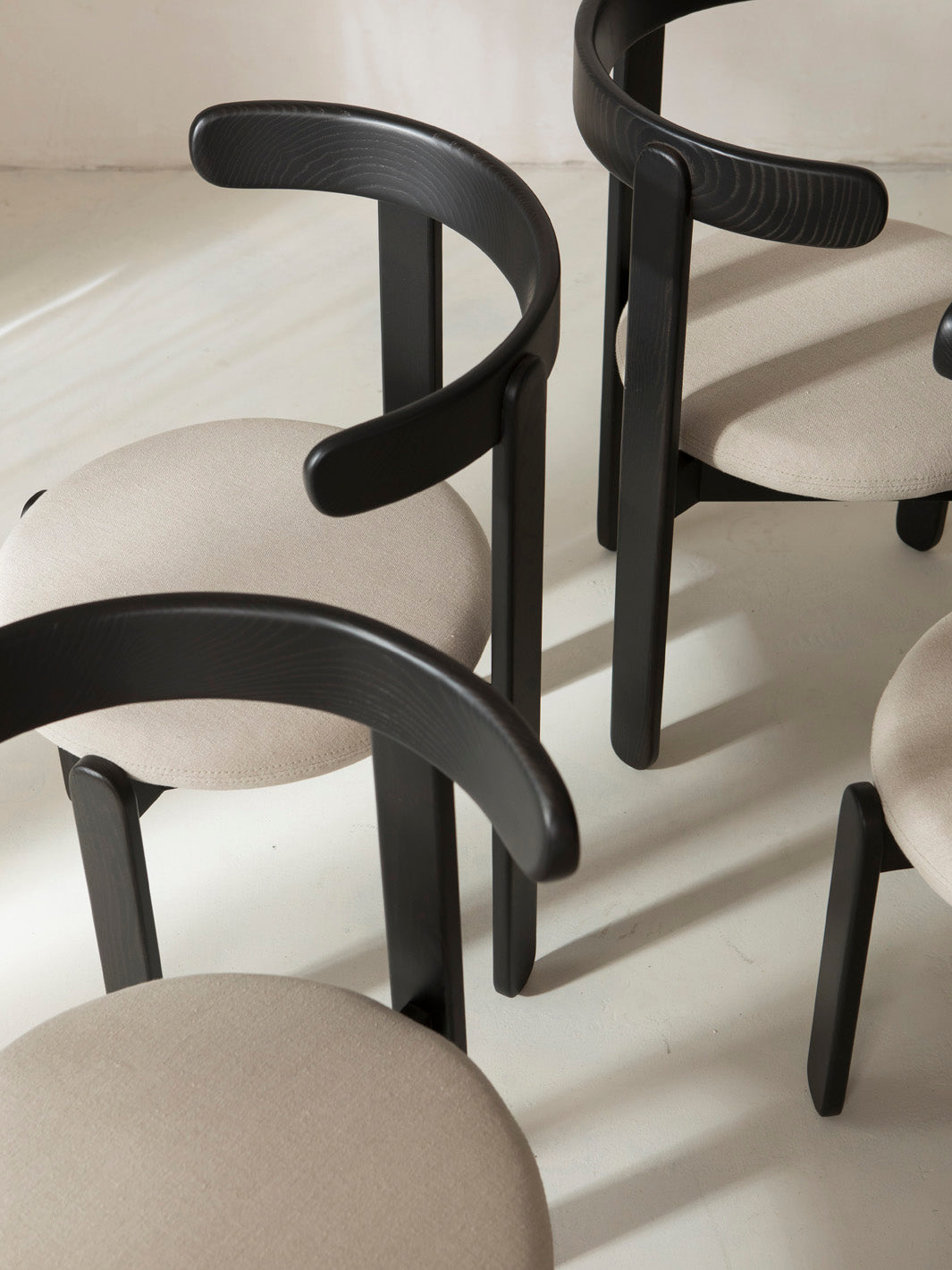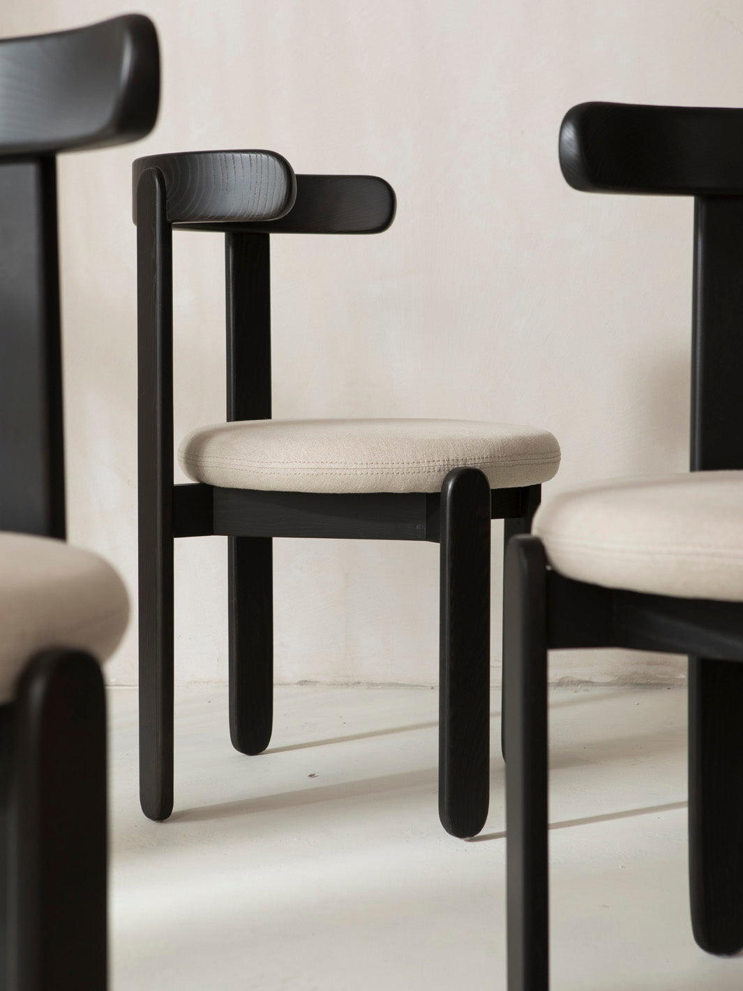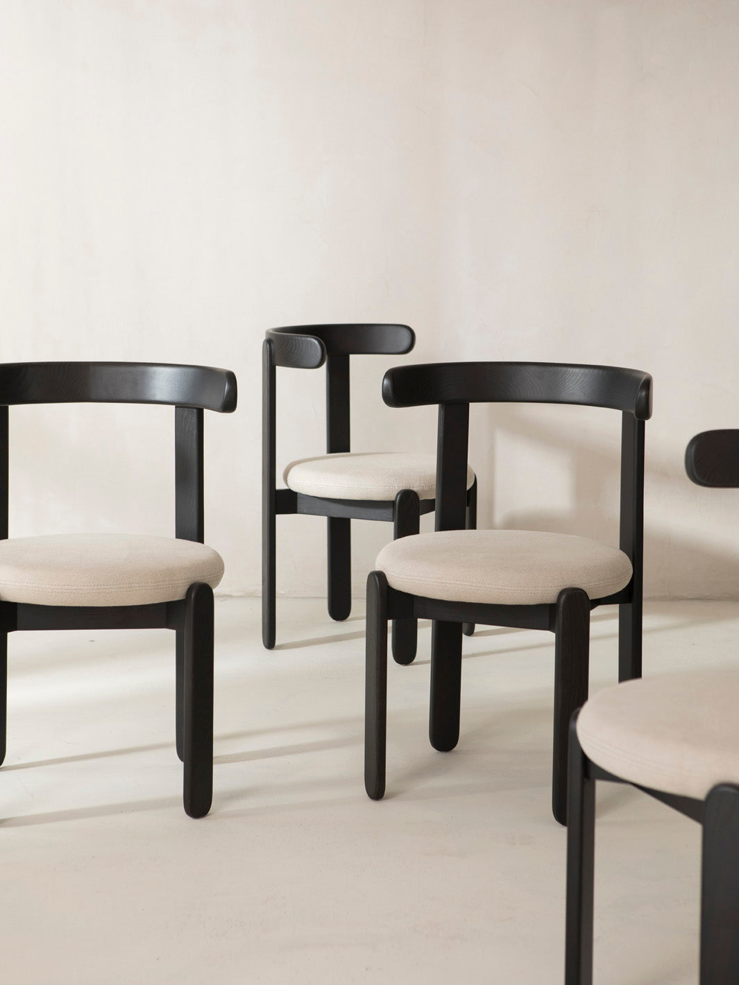 Silla de fresno con acabado lacado negro y revestimiento de lino natural.