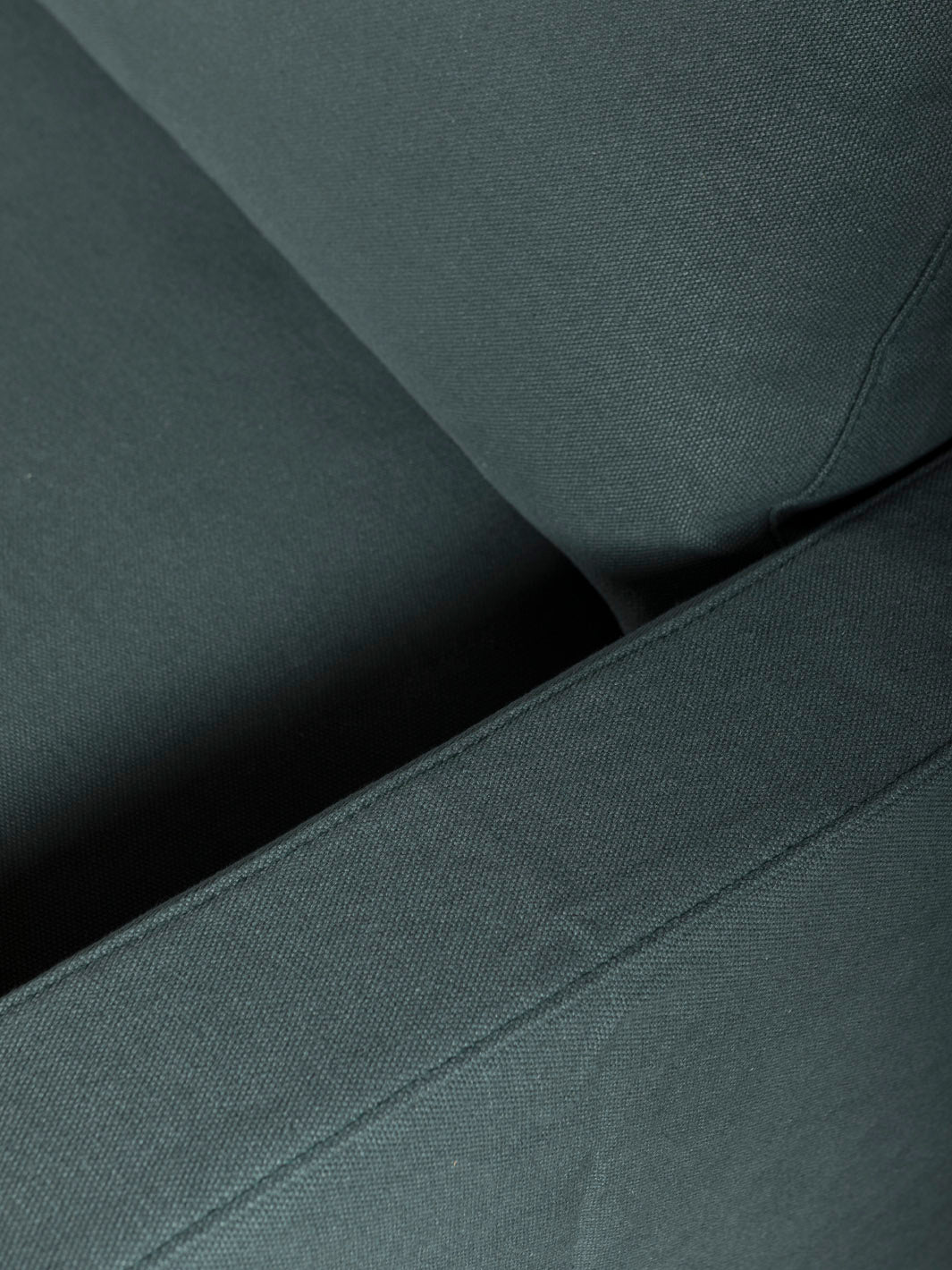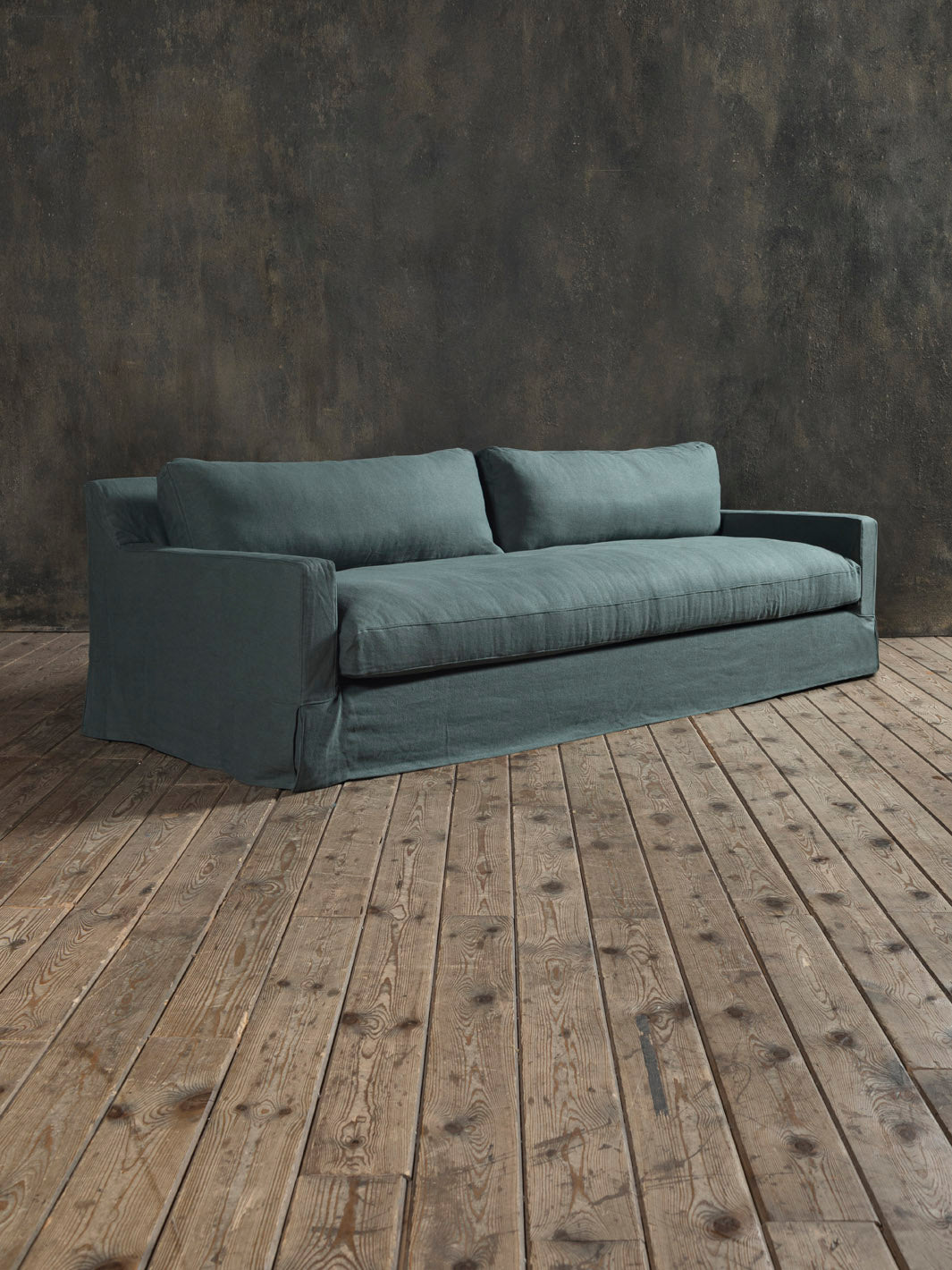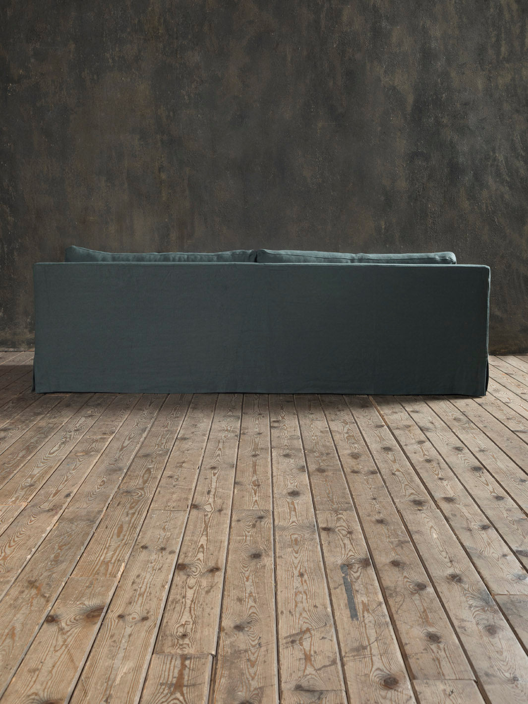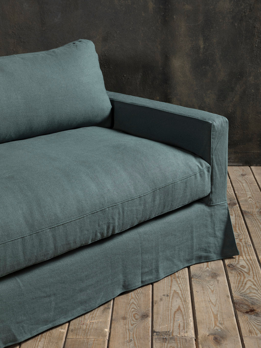 Sofá de inspiración Belga en lino desenfundable de color azul plomizo. Es confortable y ergonómico, te atrapará en su mullida estructura.