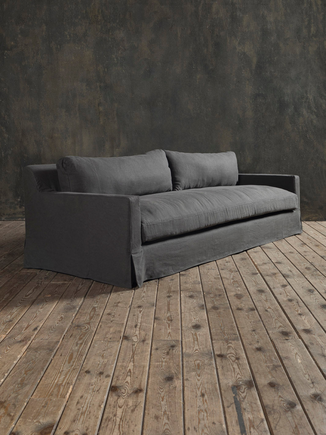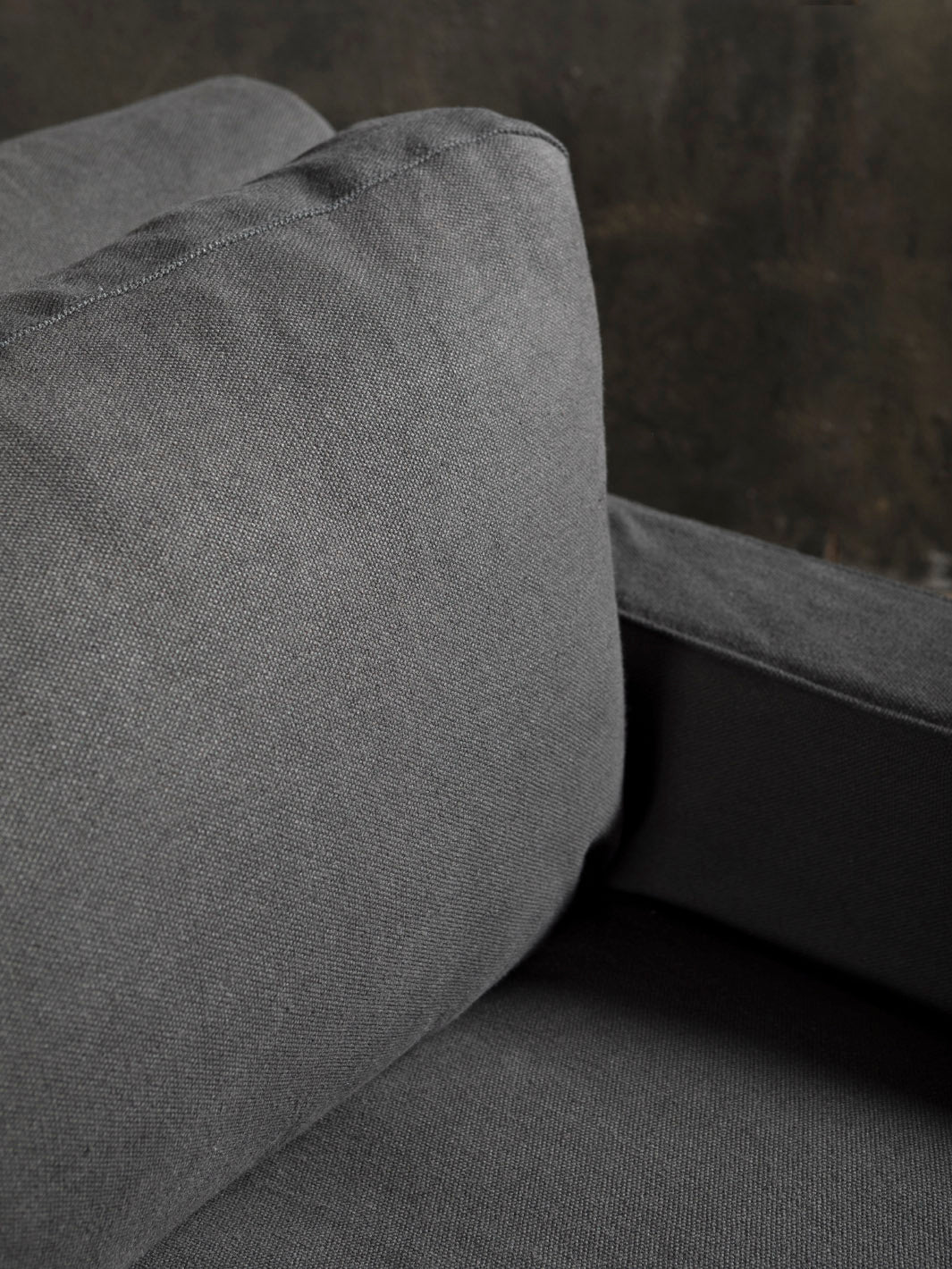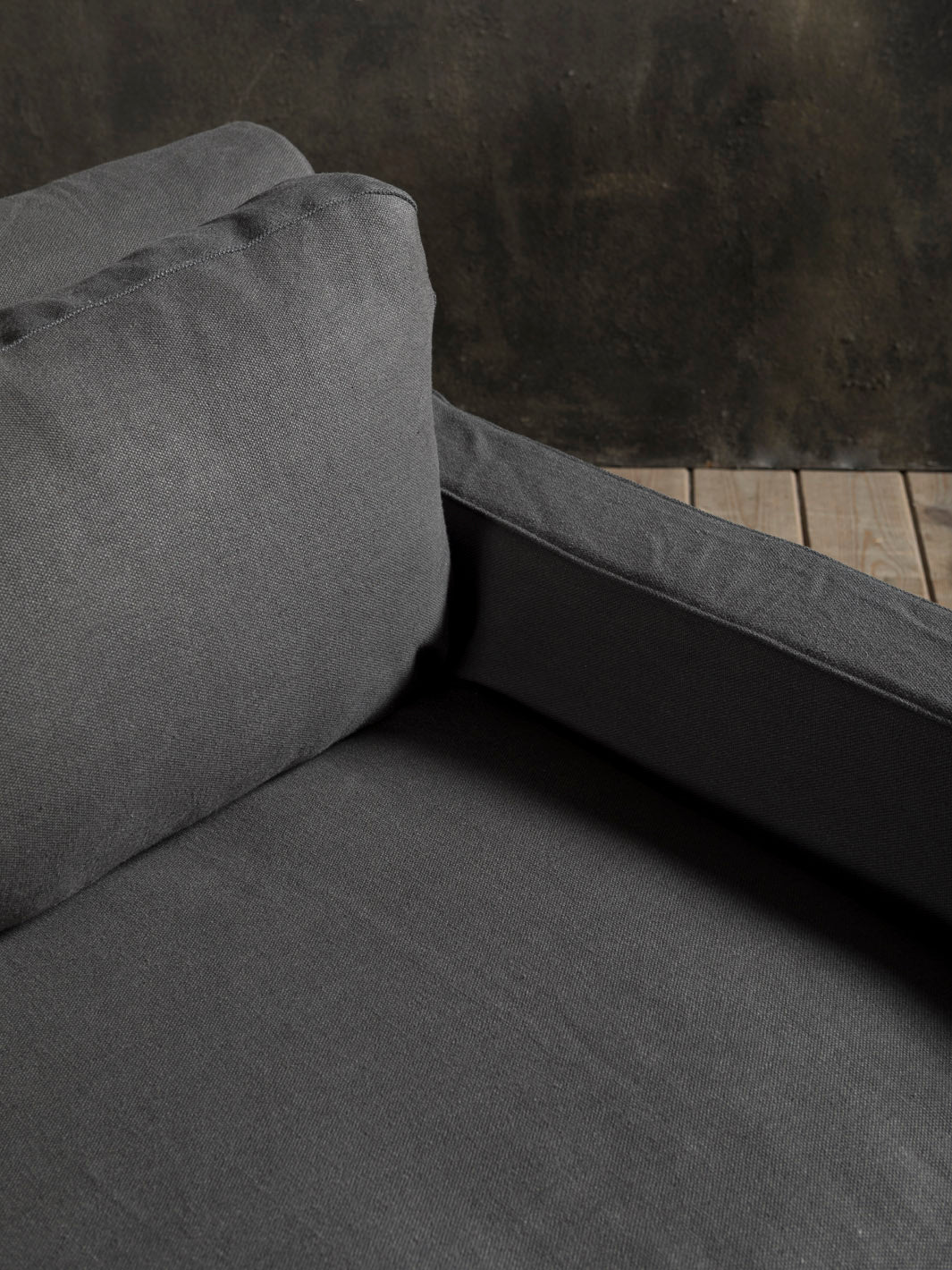 Sofá de inspiración Belga en lino desenfundable de color gris antracita. Es confortable y ergonómico, te atrapará en su mullida estructura.
