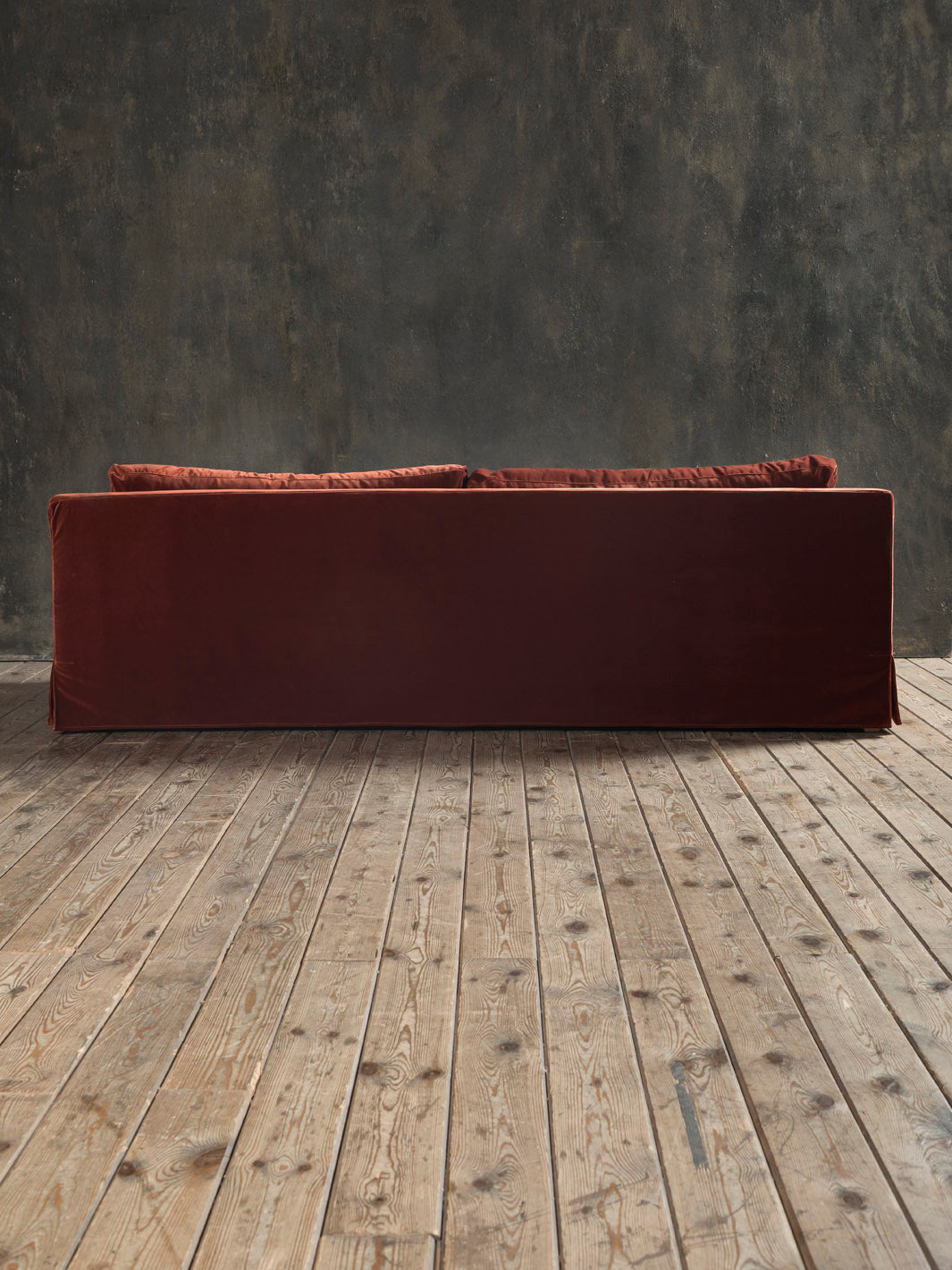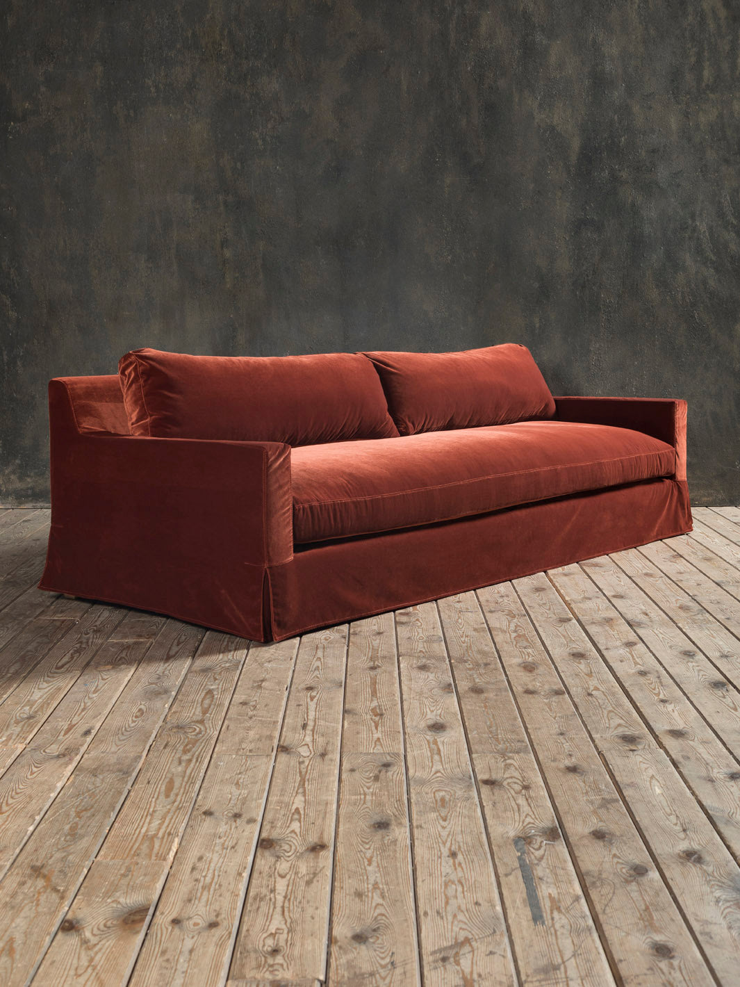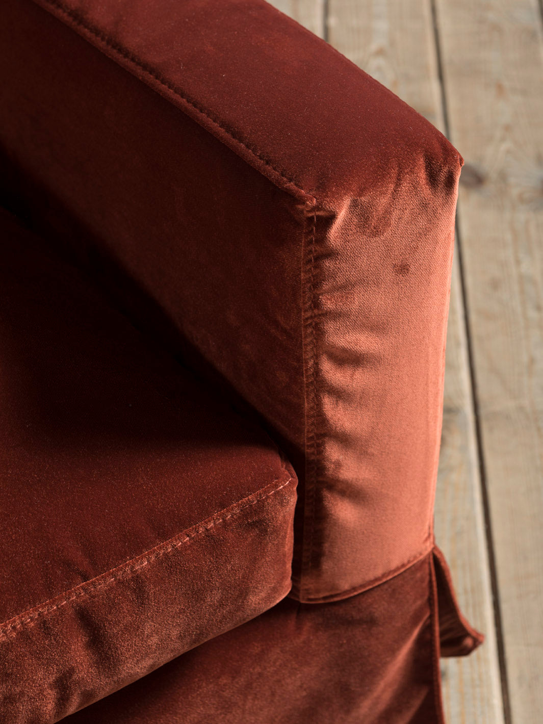 Sofá de inspiración Belga en terciopelo desenfundable de color burdeos cobrizo. Es confortable y ergonómico, al ser mullido te atrapa en su suave terciopelo.