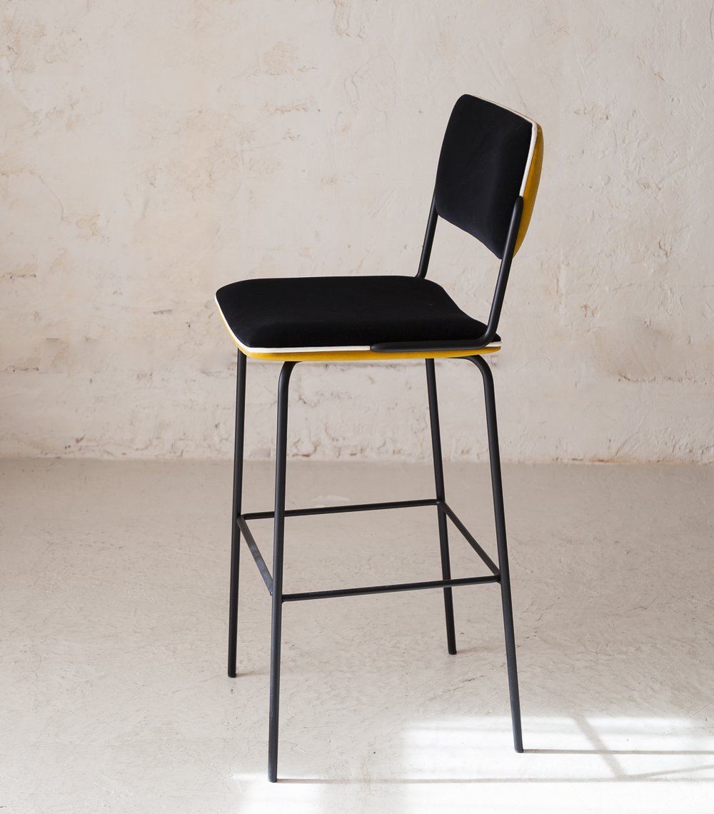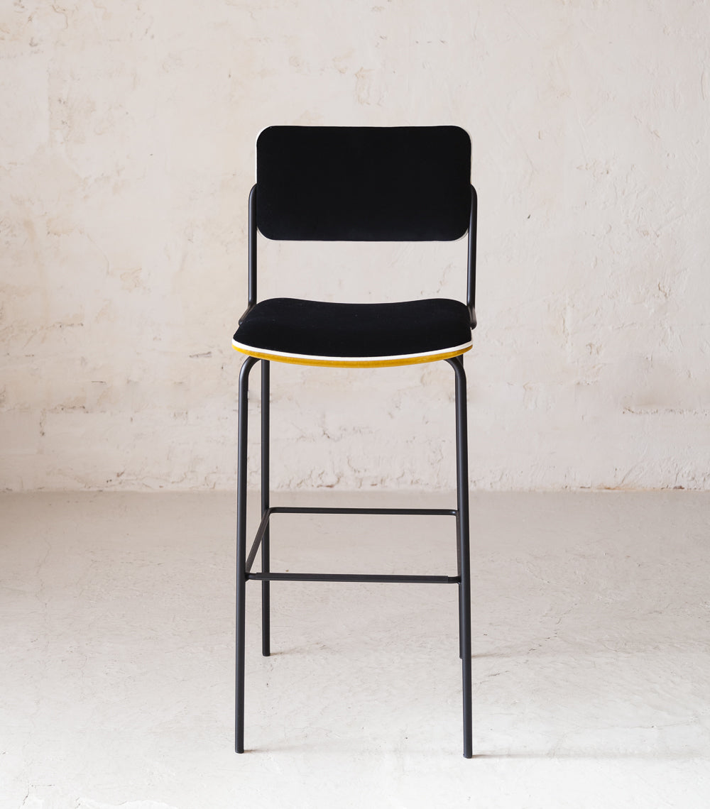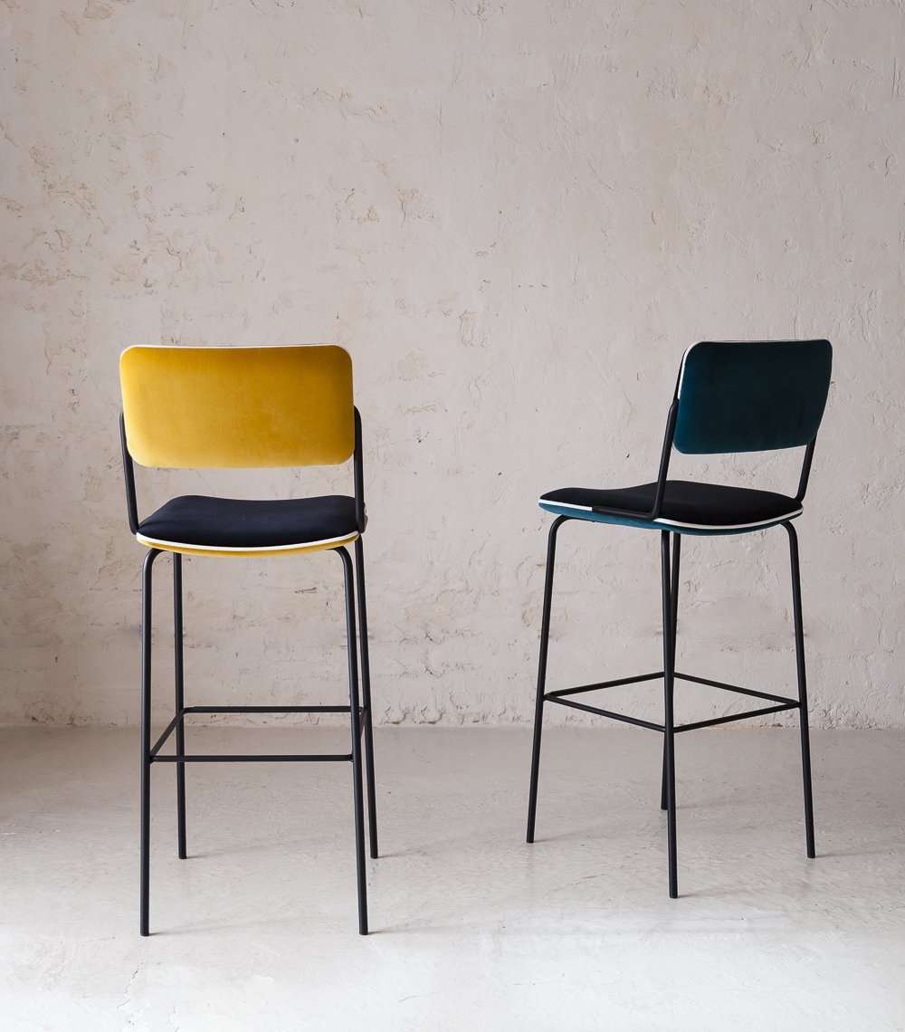 Taburete alto de la diseñadora parisina Sarah Lavoine. Con estructura de hierro negra y asiento y respaldo tapizados en terciopelo.