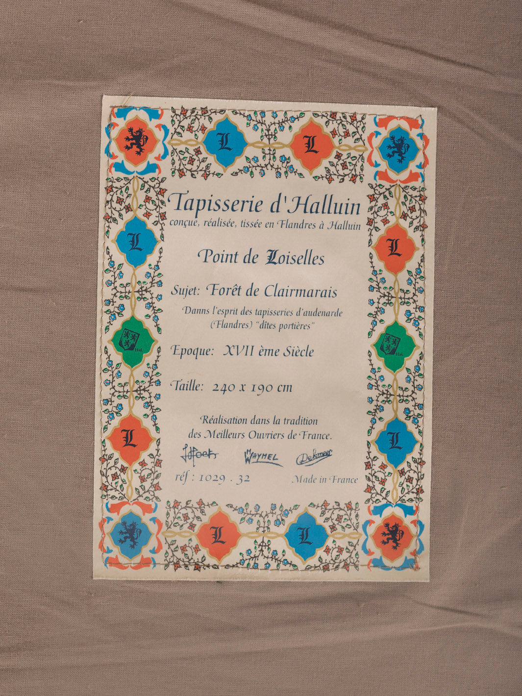 Este tapiz está tejido y confeccionado actualmente en Francia, en los talleres de Jules Pansu. Éstos se encuentran en Flandes, Francia.