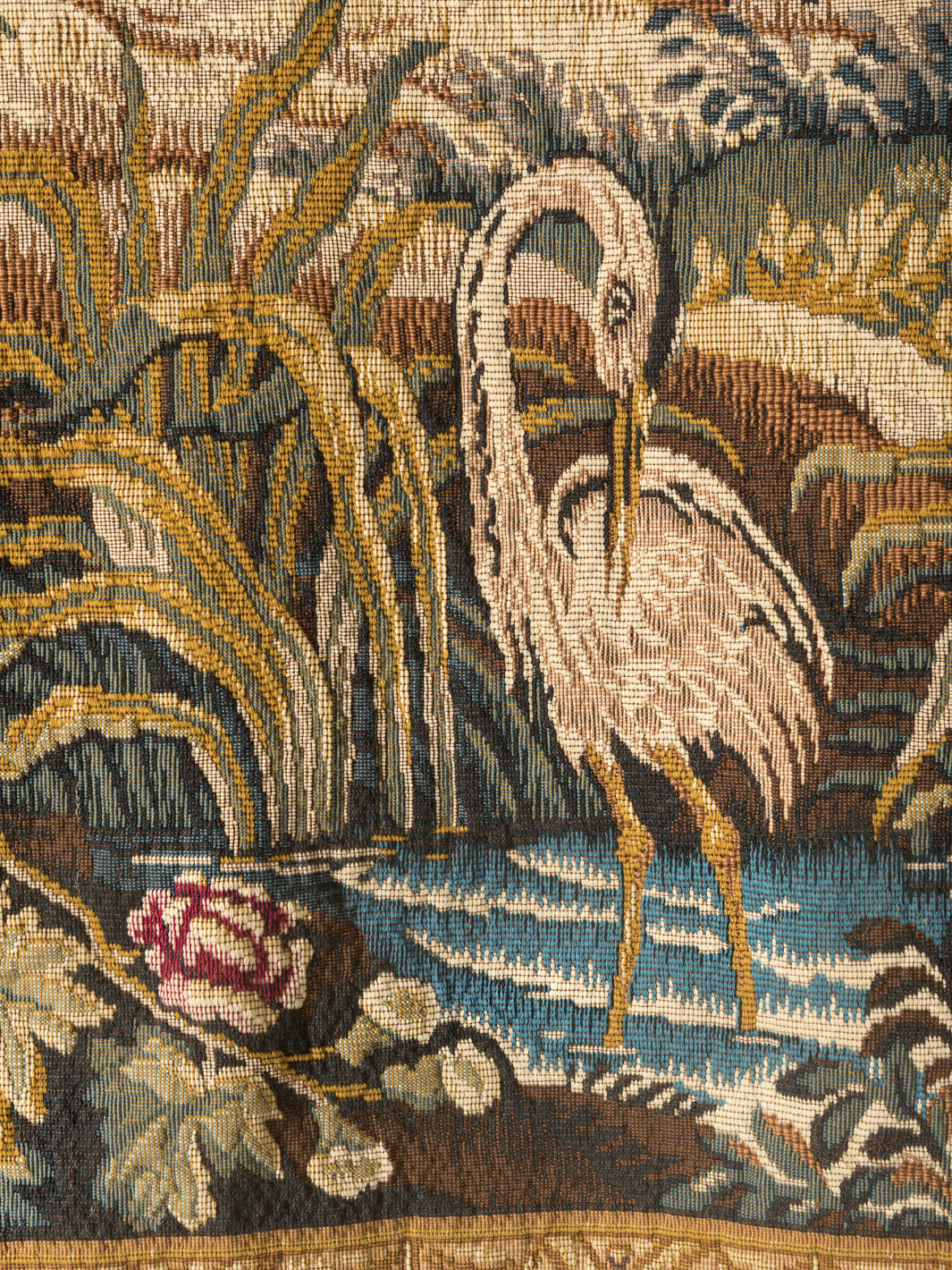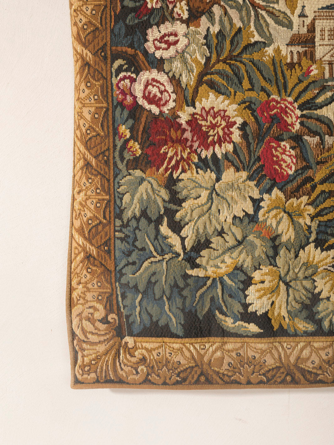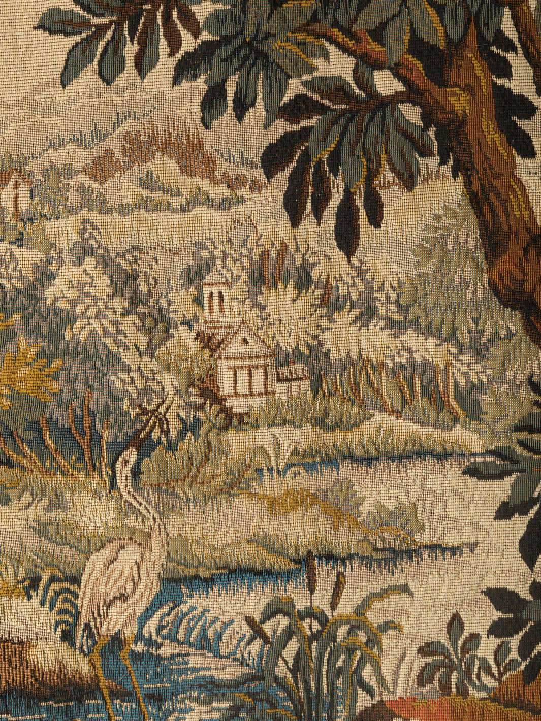 Tapiz clásico inspirado en un tapiz expuesto en el castillo de Chevreuse (Francia), creado por los talleres de Aubusson en el siglo XVIII. En la suave primavera, los pájaros retozan en el río Lignon en medio de flores florecidas y follaje verde, con ricas residencias en perspectiva.