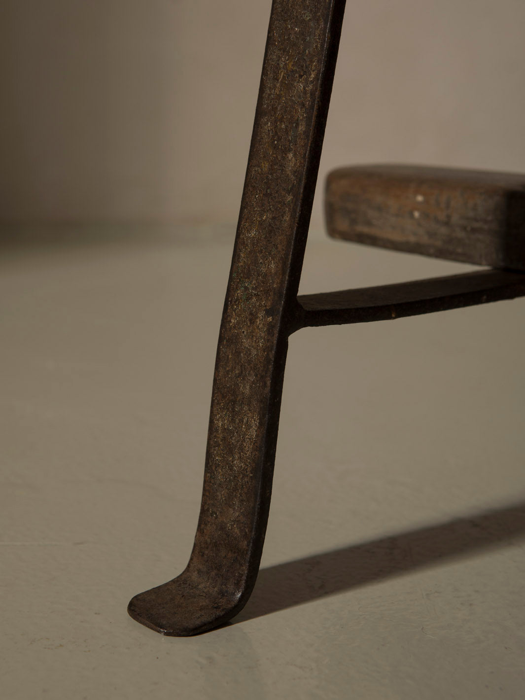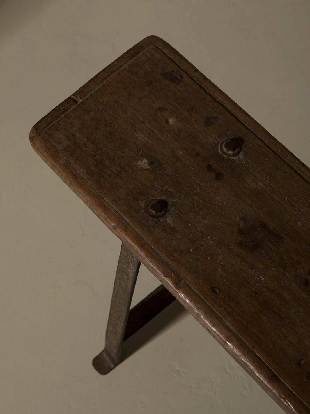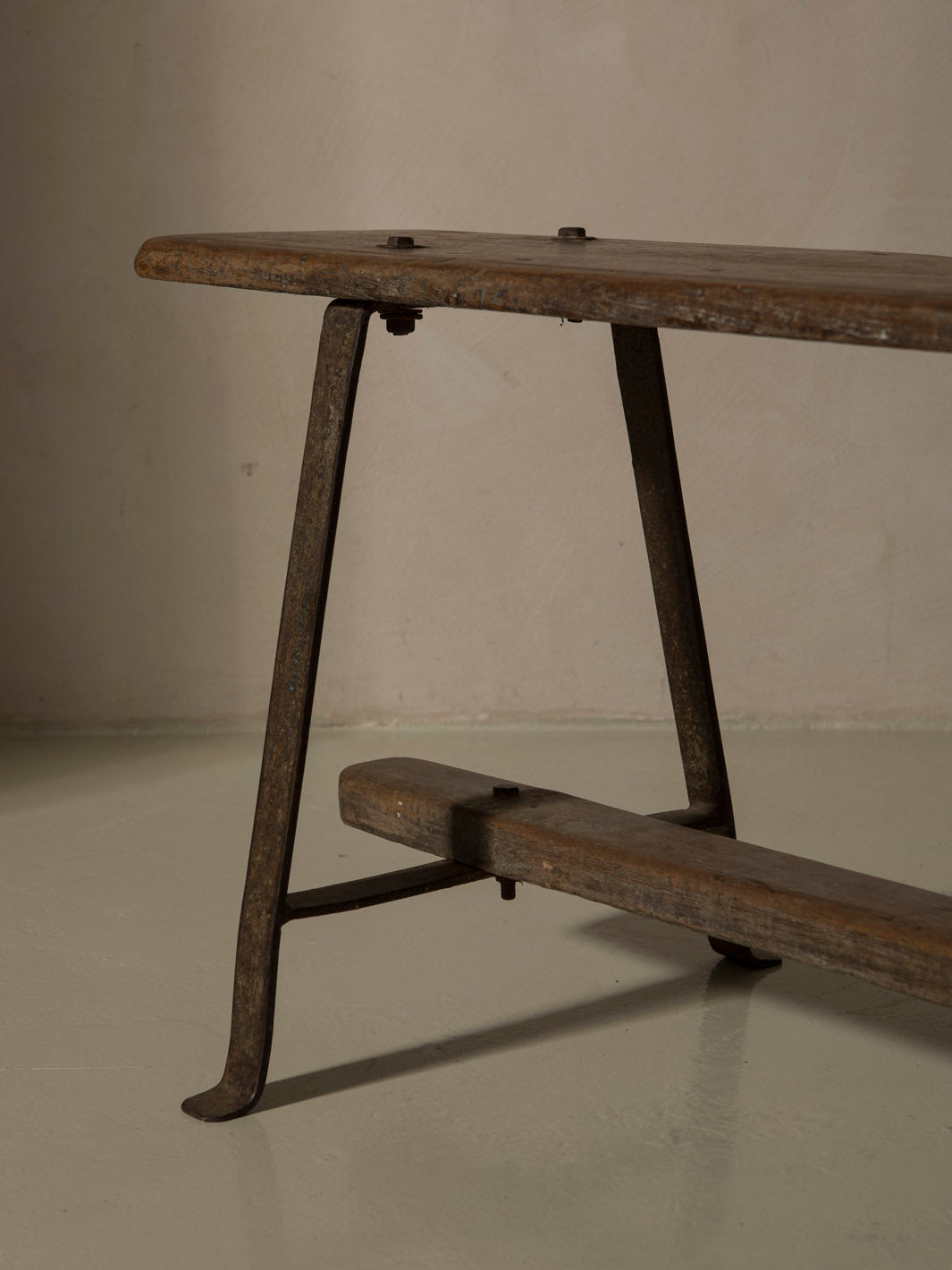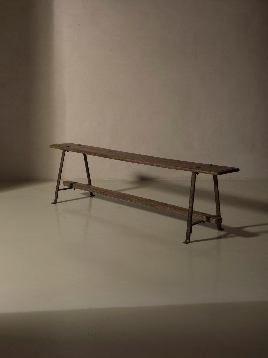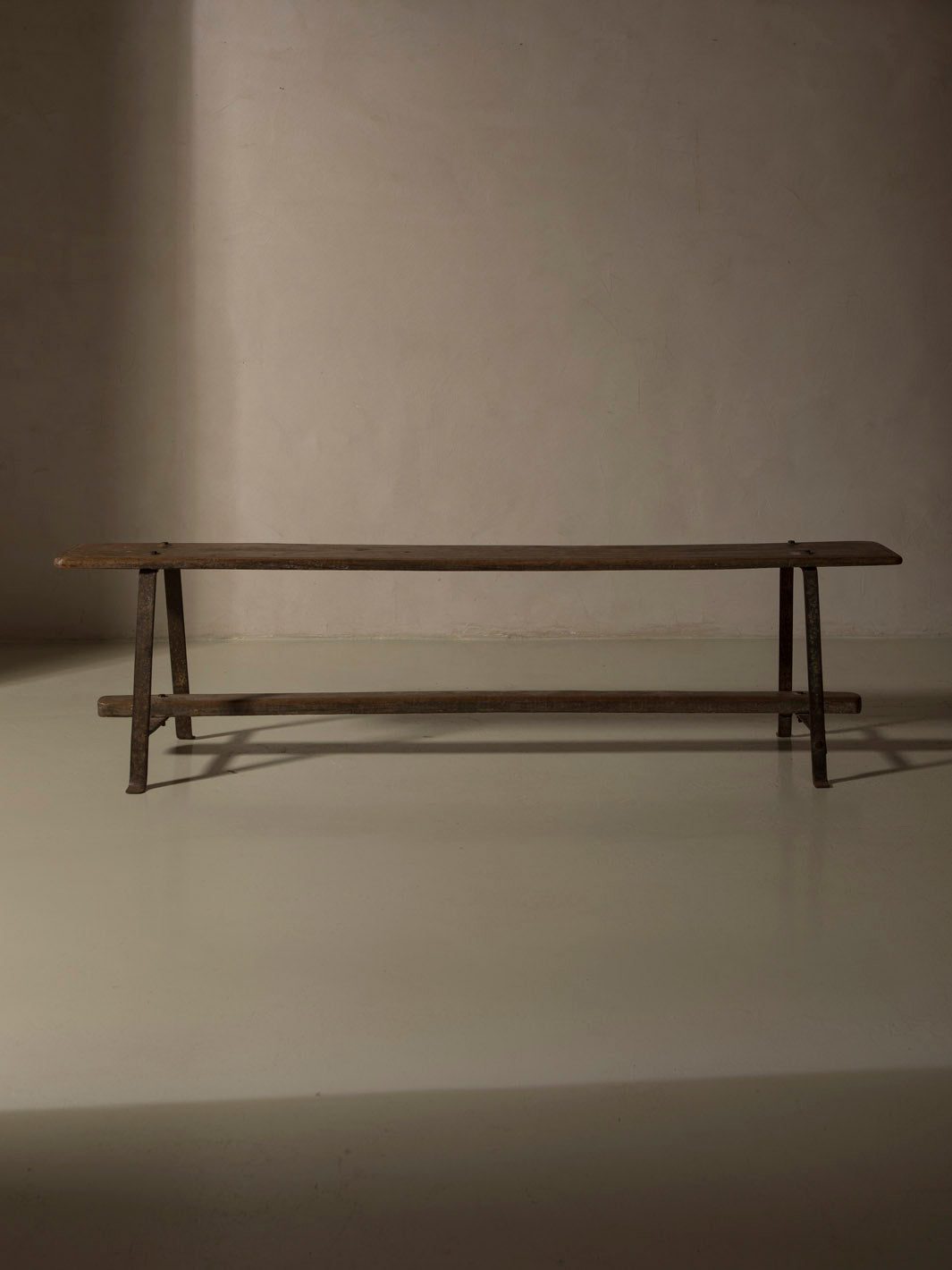 Banco chino de madera de olmo lavado y pies en hierro, original de los años 40.