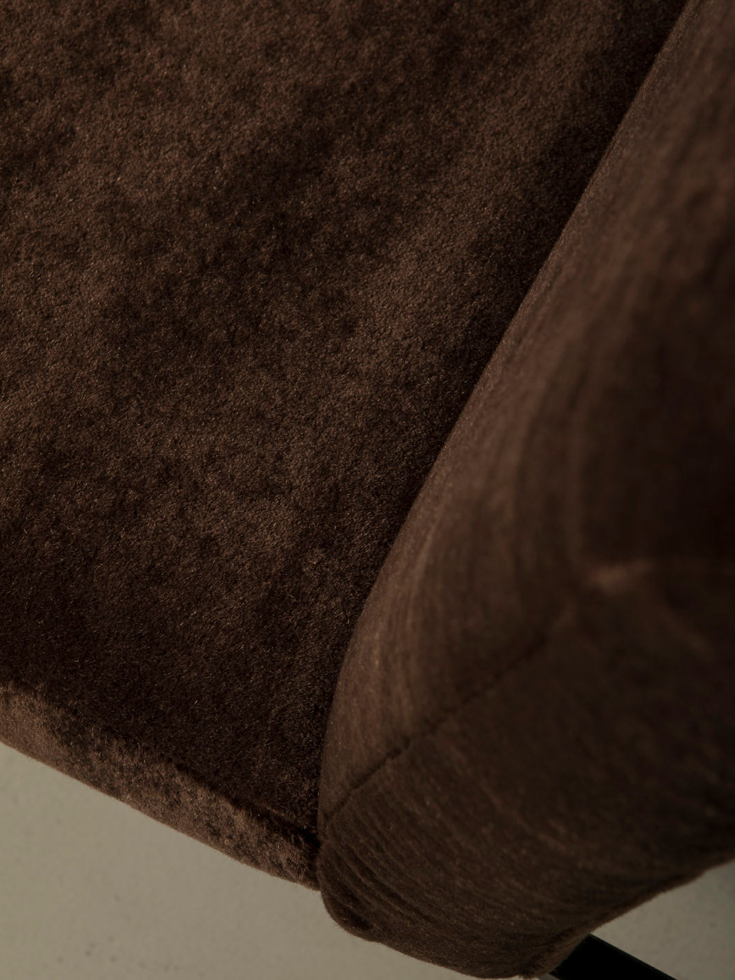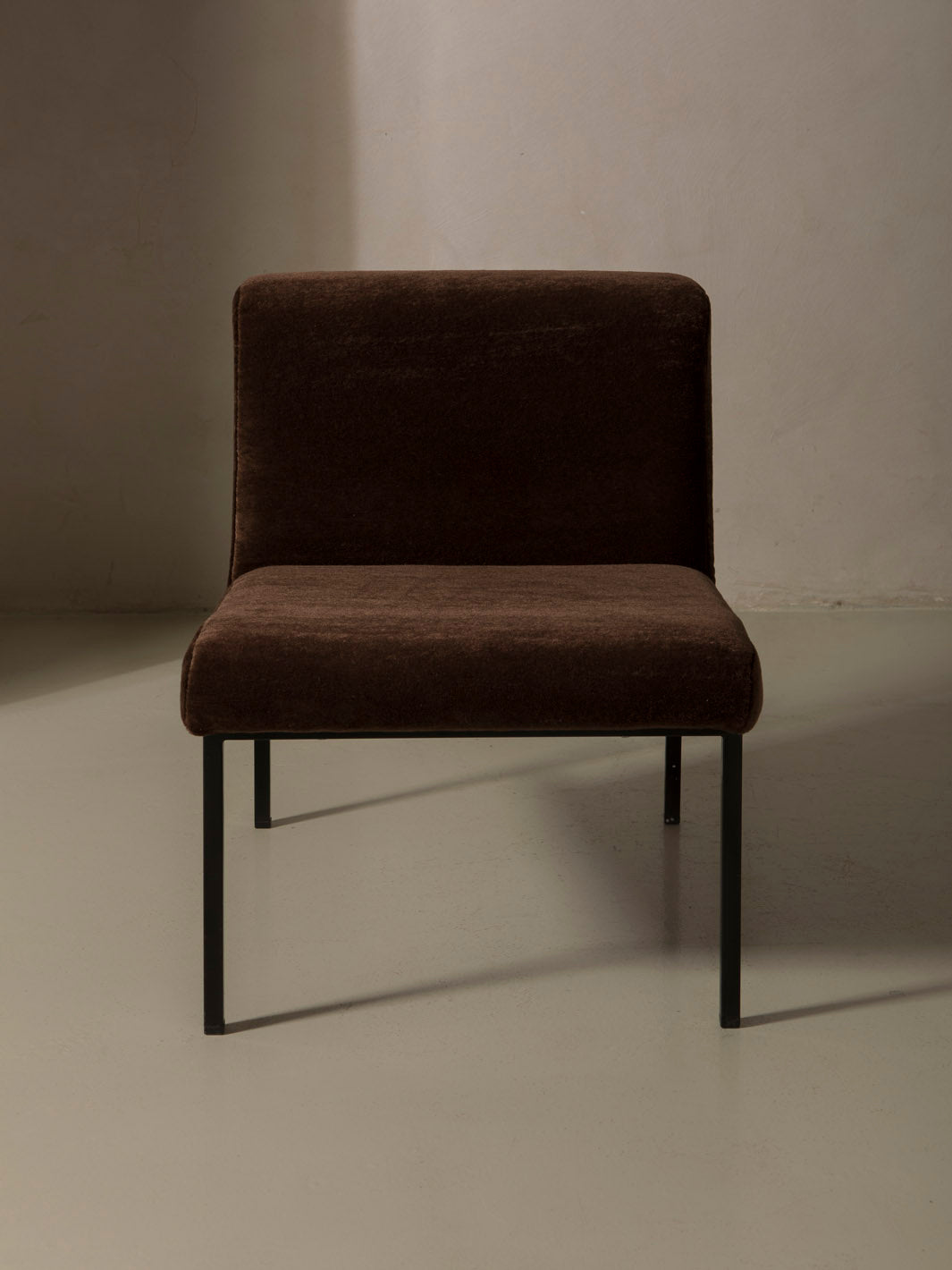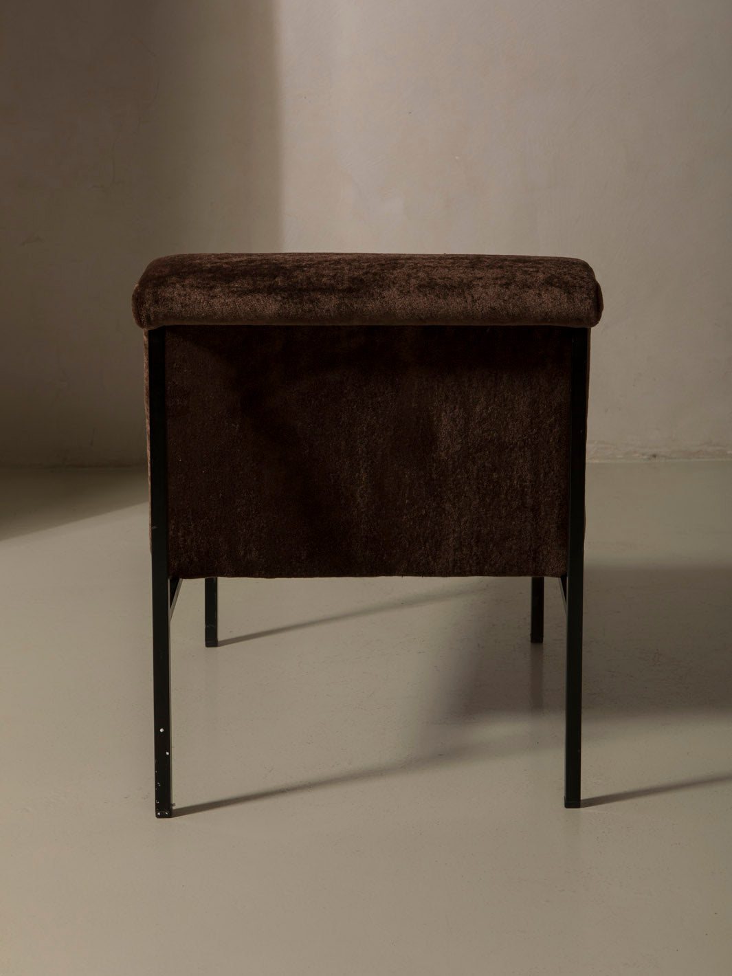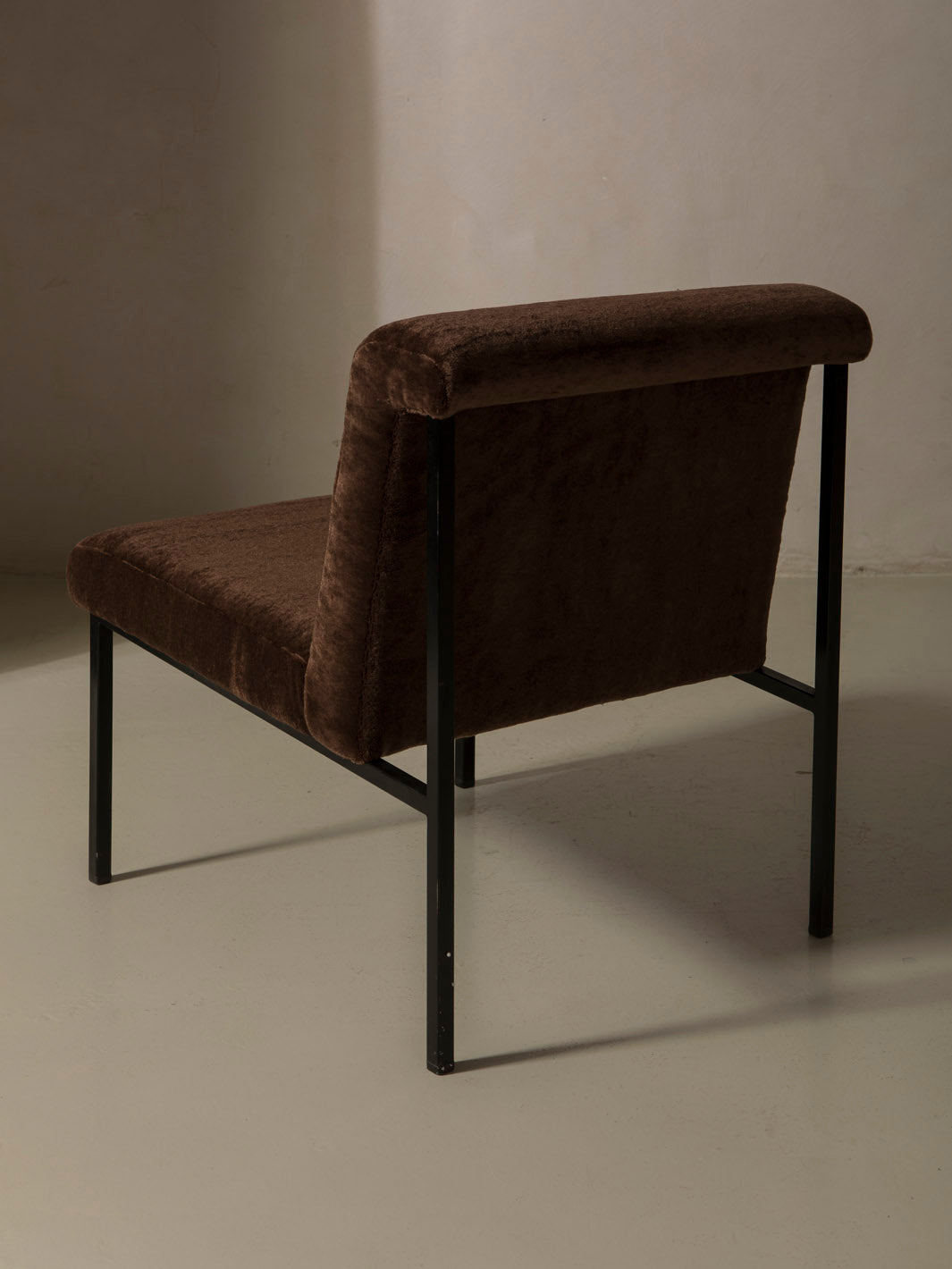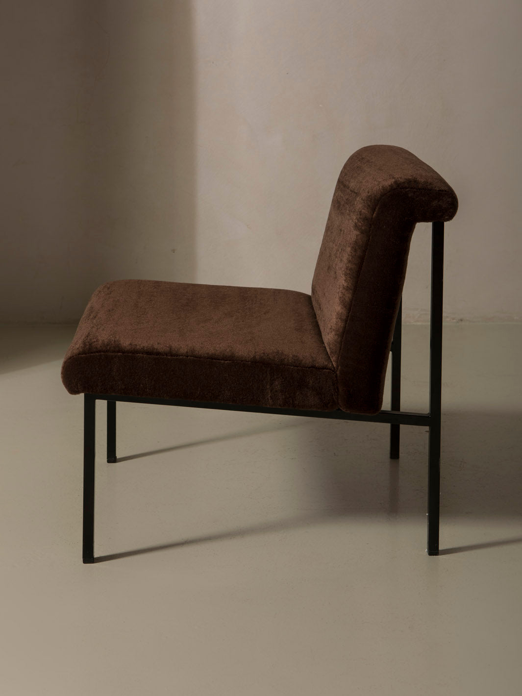 Butaca original de Italia de los años 70, con estructura lineal y tapicería de Elitis en terciopelo de mohair marrón.