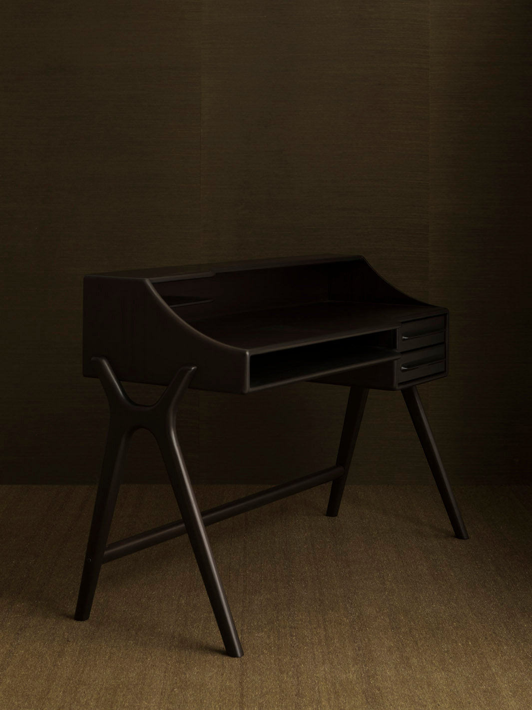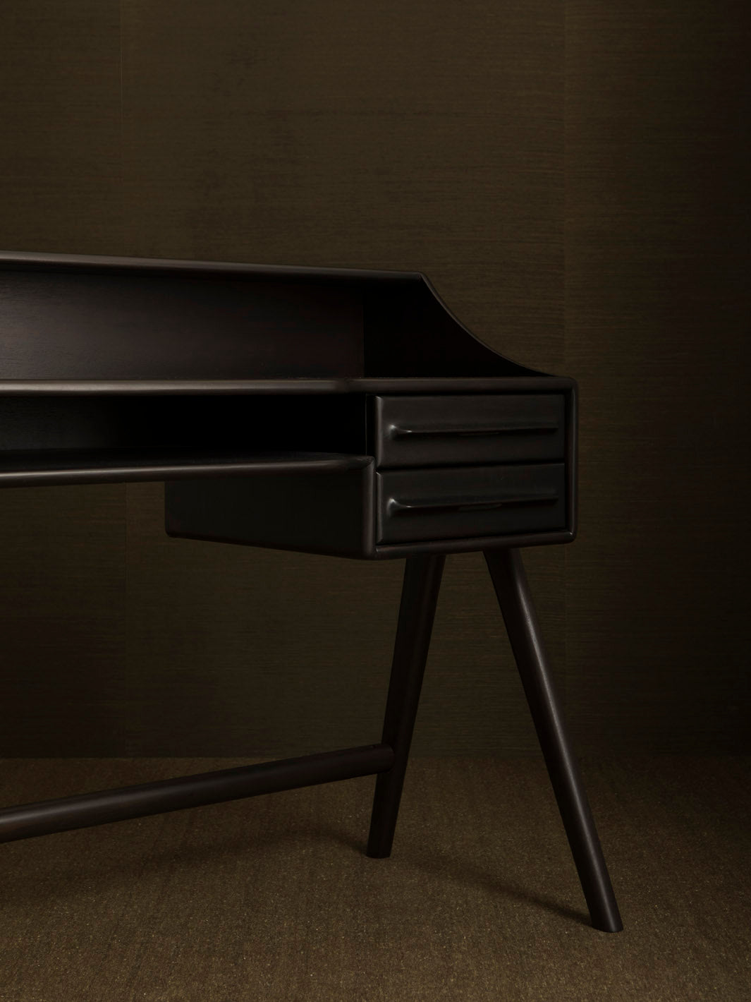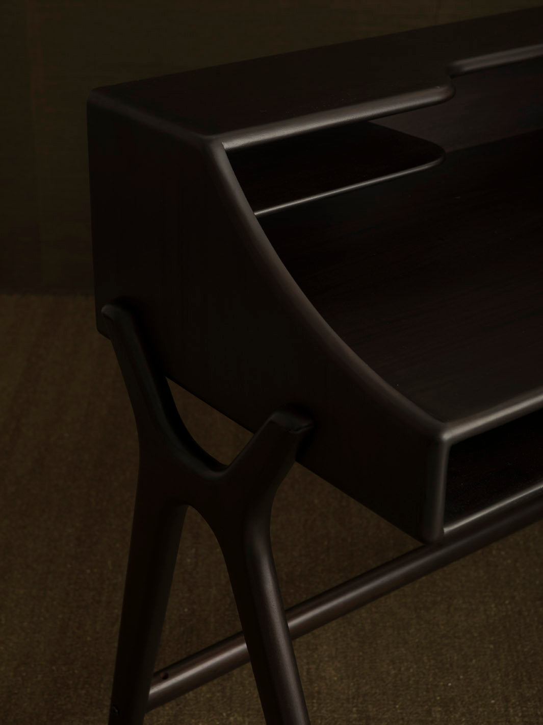 En la colección Flow, con esquinas redondeadas y sutiles curvas por todas partes, cada pieza irradia un espíritu vintage, preparada para complementar espacios y necesidades en evolución. Diseñado tanto para la concentración como para la relajación, las líneas limpias del escritorio y su cuidado acabado sumen al espacio de trabajo en una calidez única. Se fabrica en caoba maciza con un acabado barnizado, y su superficie de trabajo táctil y su base abierta crean un entorno acogedor para momentos creativos y productivos.