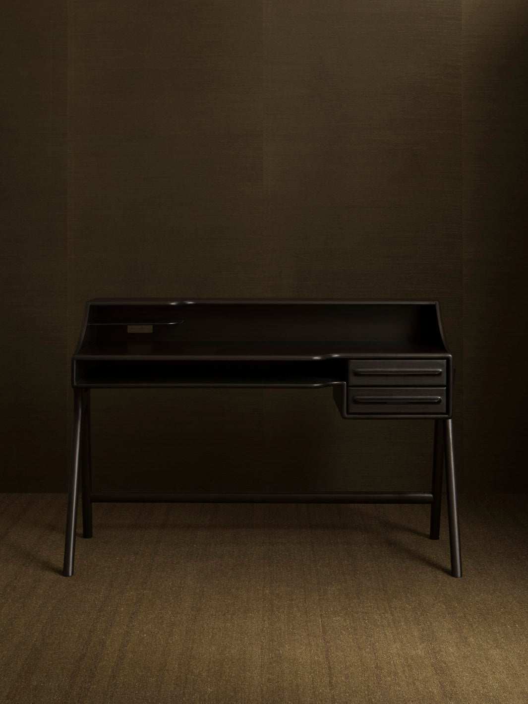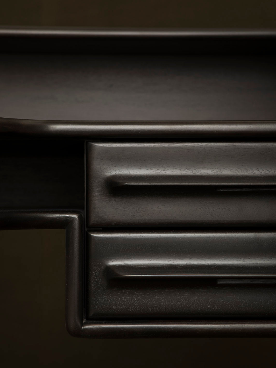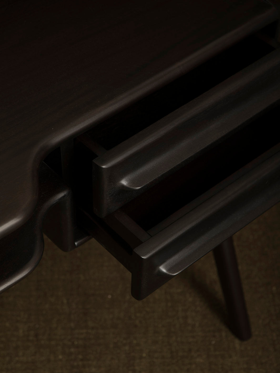 En la colección Flow, con esquinas redondeadas y sutiles curvas por todas partes, cada pieza irradia un espíritu vintage, preparada para complementar espacios y necesidades en evolución. Diseñado tanto para la concentración como para la relajación, las líneas limpias del escritorio y su cuidado acabado sumen al espacio de trabajo en una calidez única. Se fabrica en caoba maciza con un acabado barnizado, y su superficie de trabajo táctil y su base abierta crean un entorno acogedor para momentos creativos y productivos.