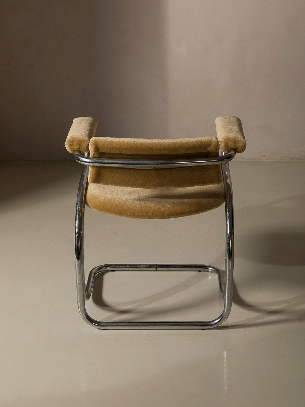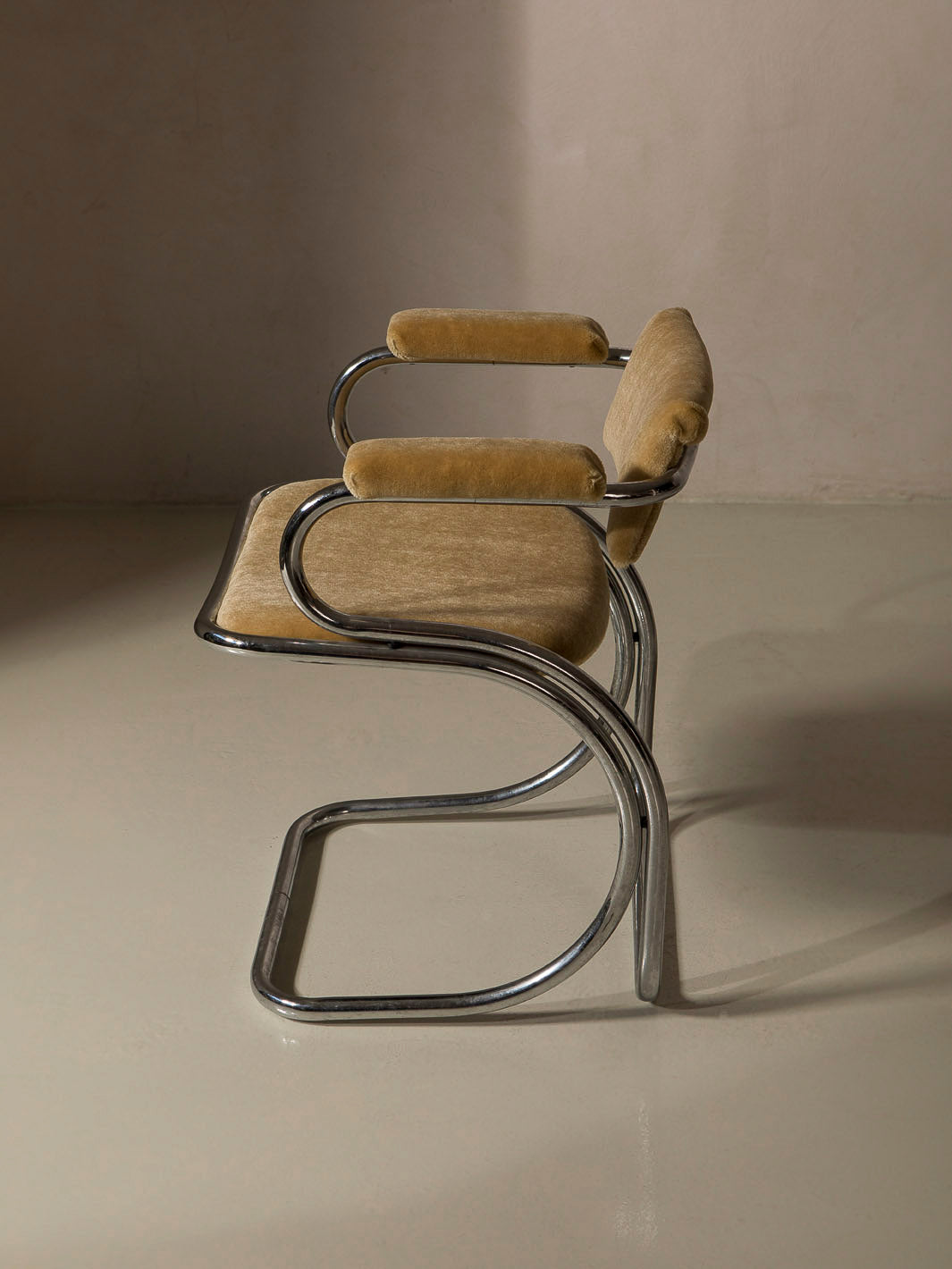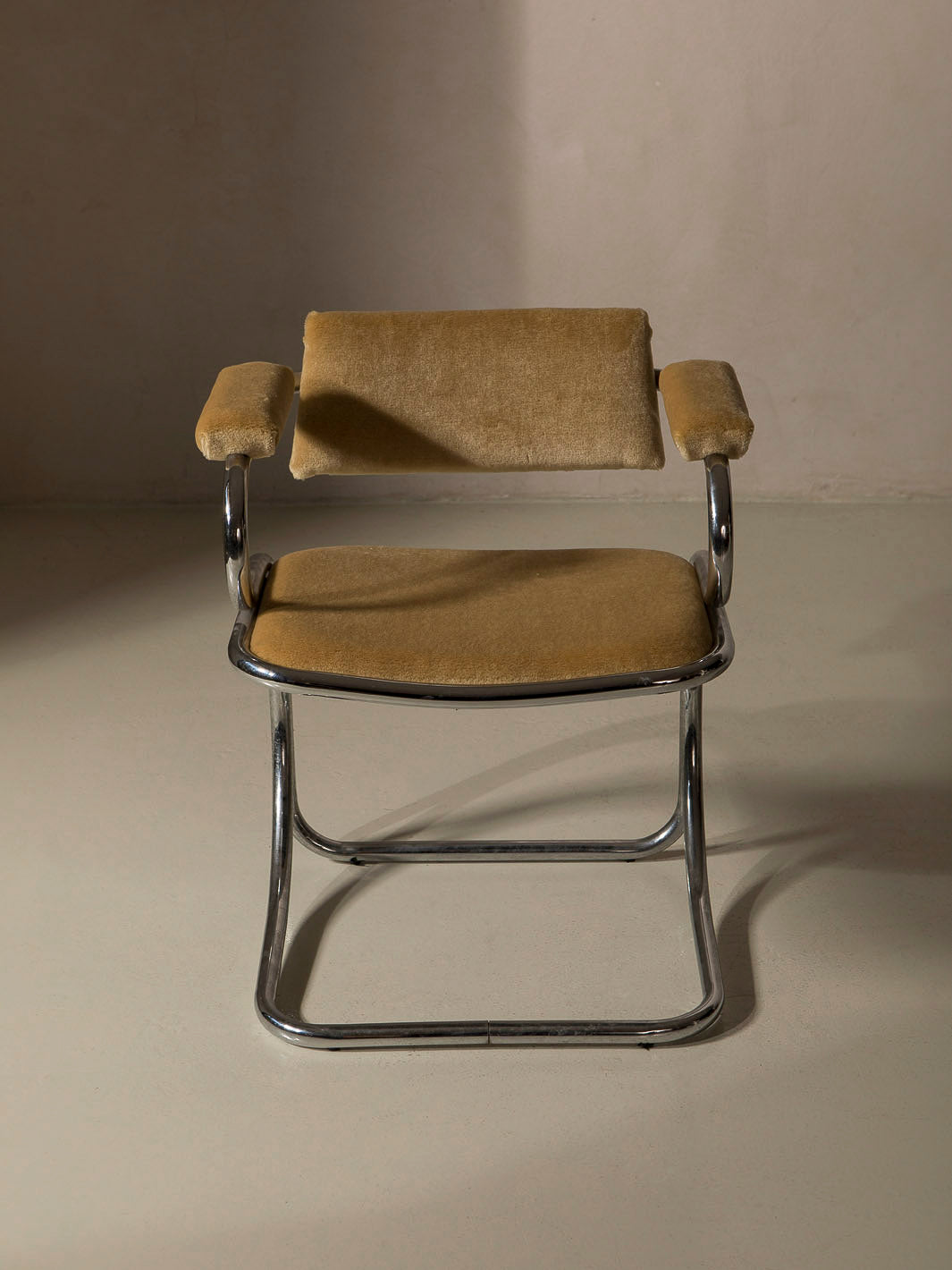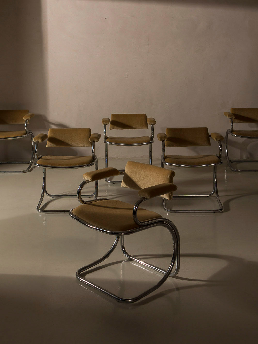 Juego de 6 sillas italianas de los años 60, tapizadas en terciopelo de mohair color mantequilla y base cromada.