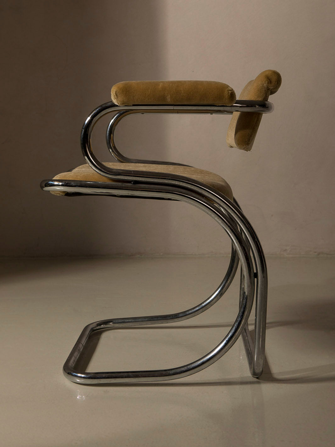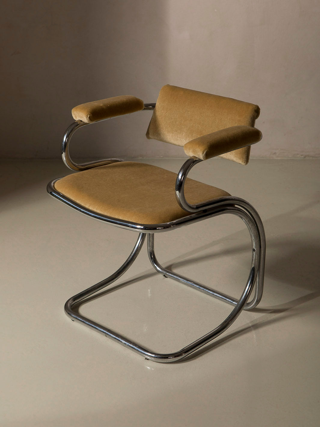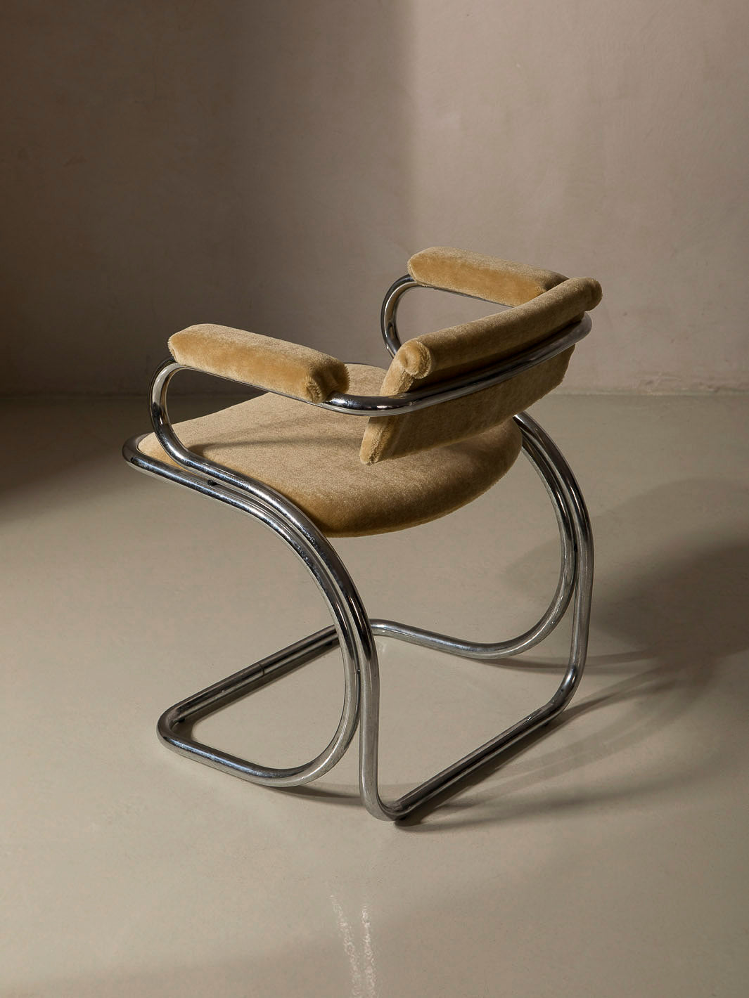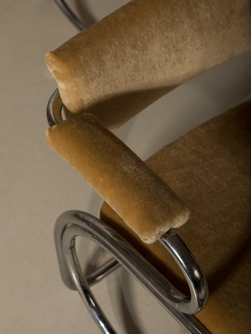 Juego de 6 sillas italianas de los años 60, tapizadas en terciopelo de mohair color mantequilla y base cromada.
