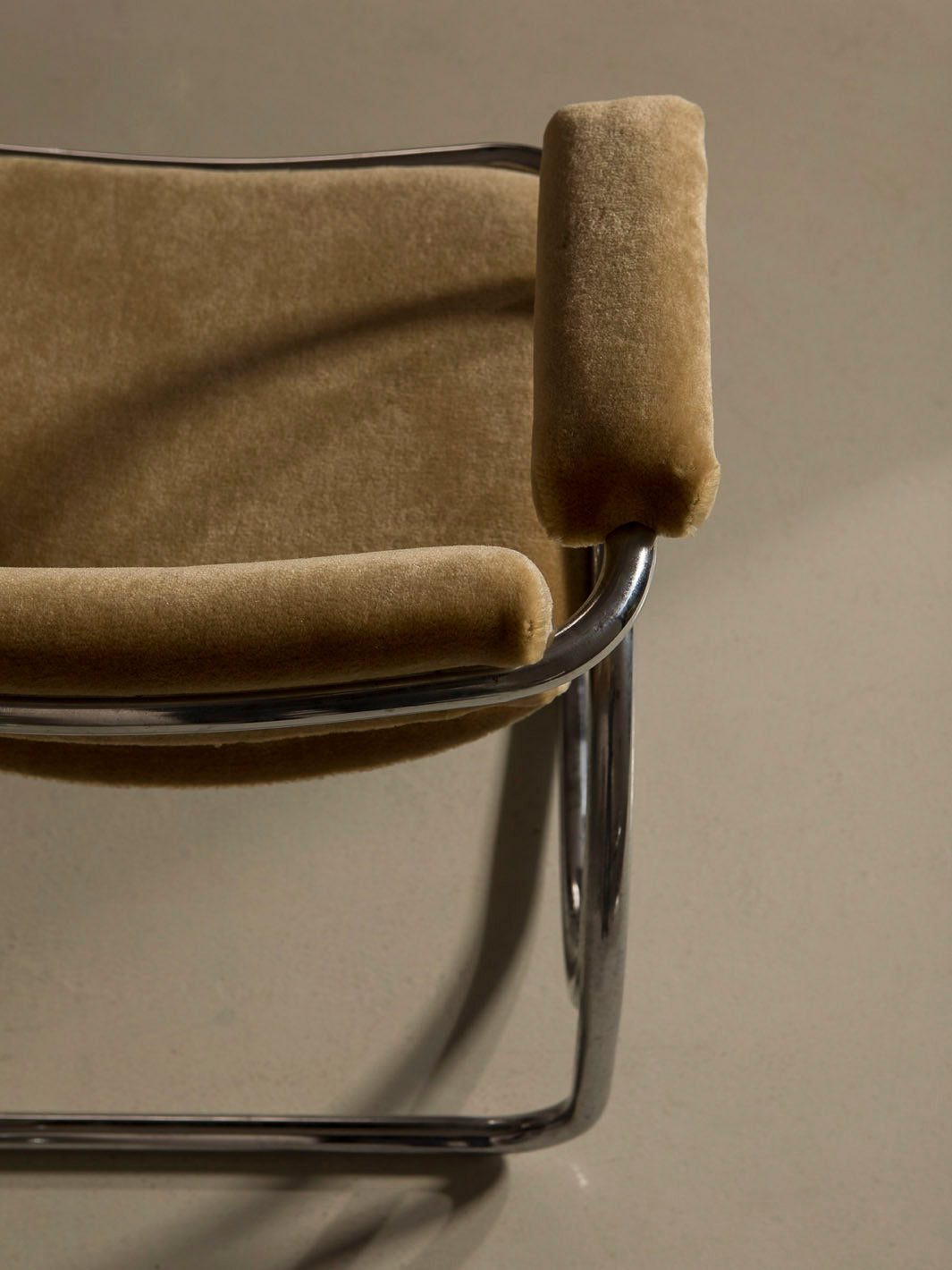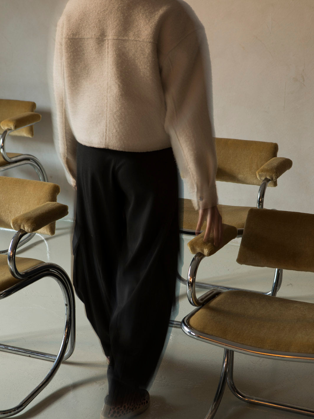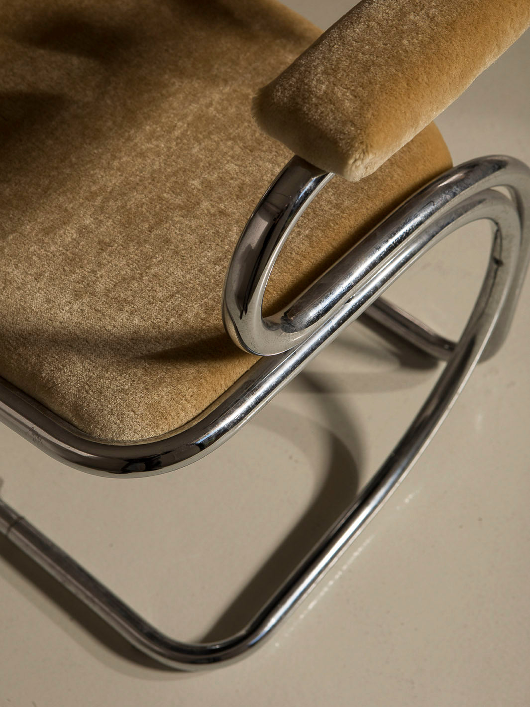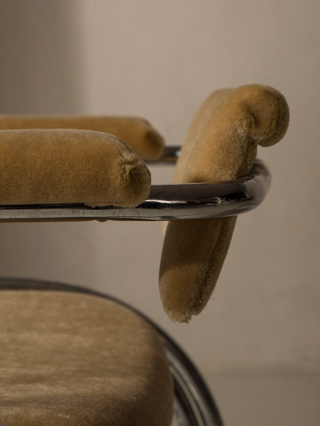 Juego de 6 sillas italianas de los años 60, tapizadas en terciopelo de mohair color mantequilla y base cromada.