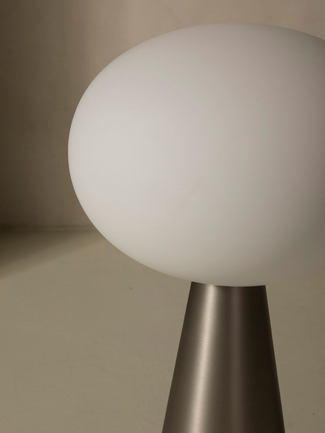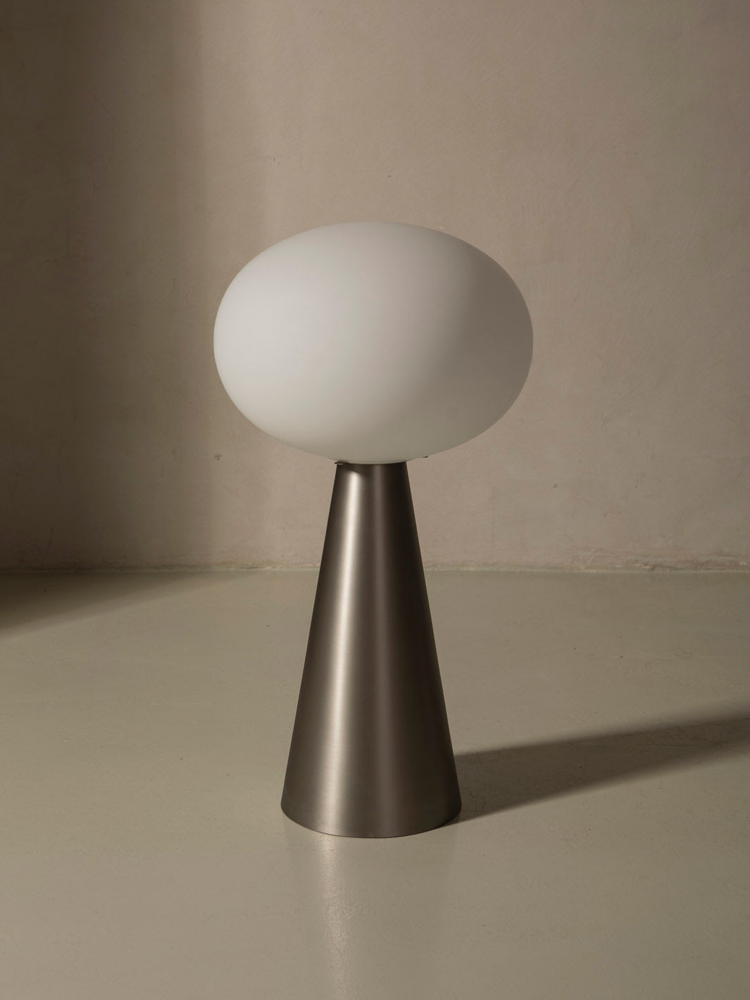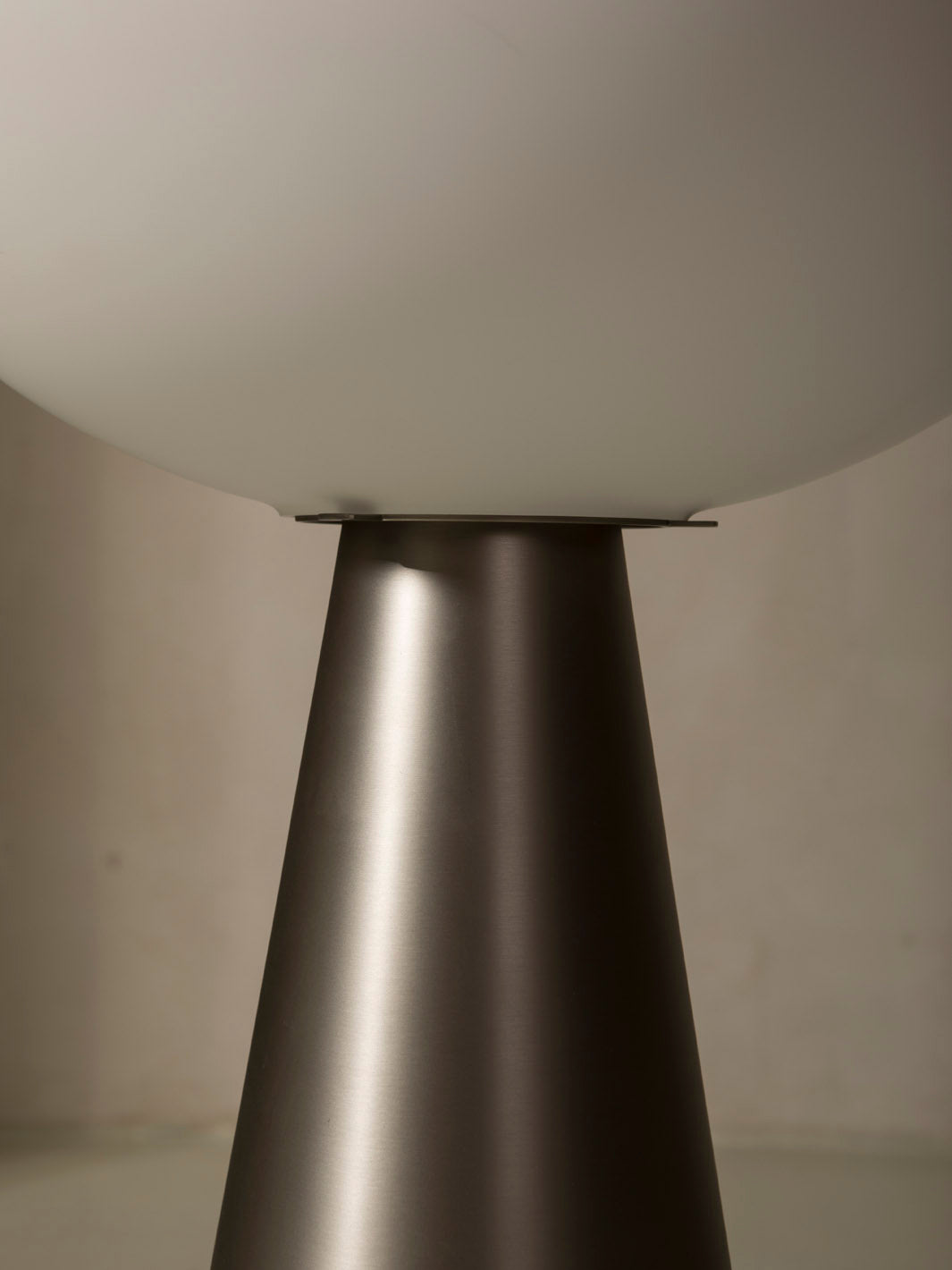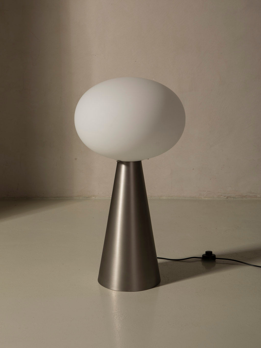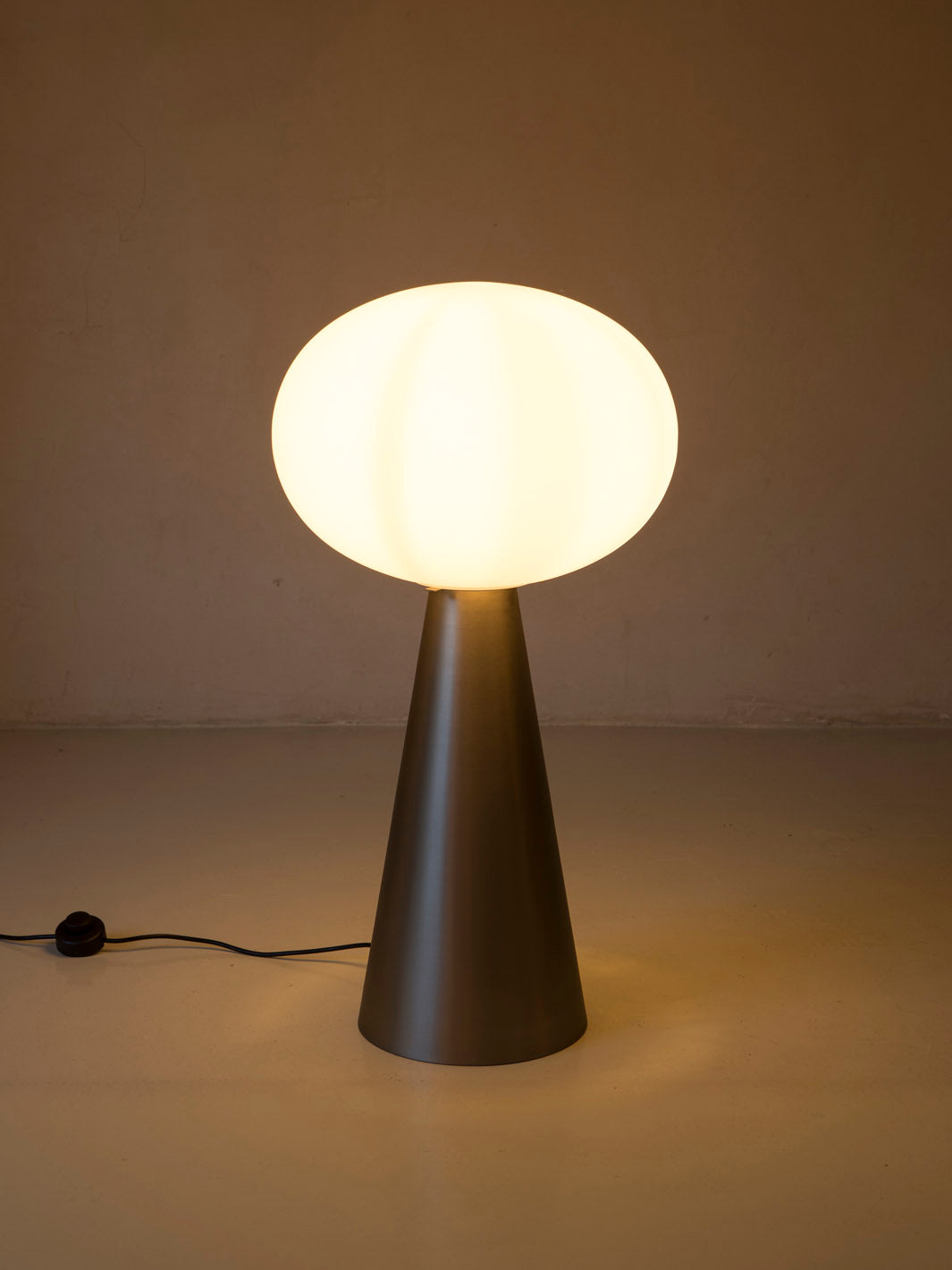 Escultural lámpara de pie con base cónica de acero y tulipa de cristal de Murano, realizada artesanalmente en Italia.