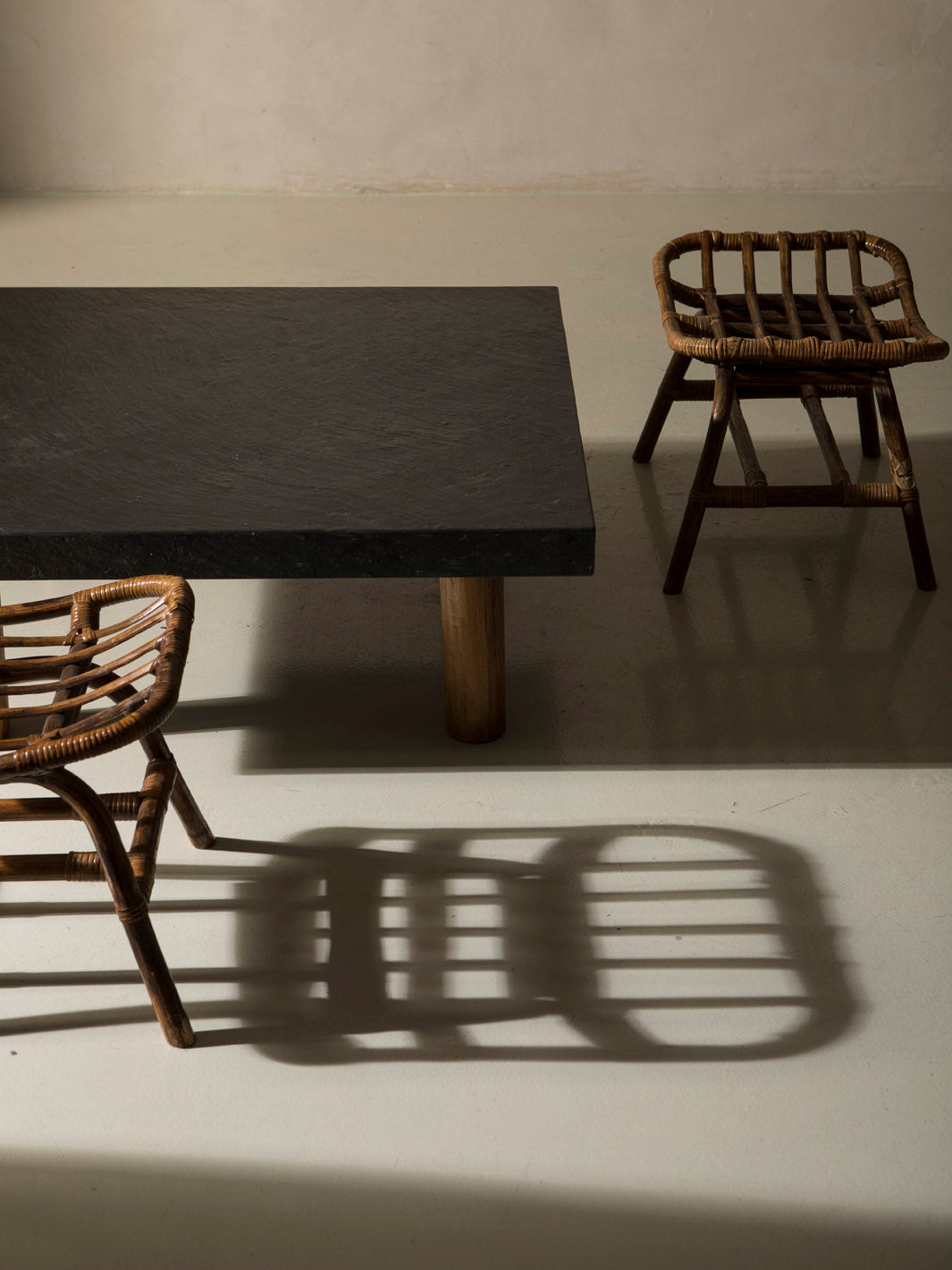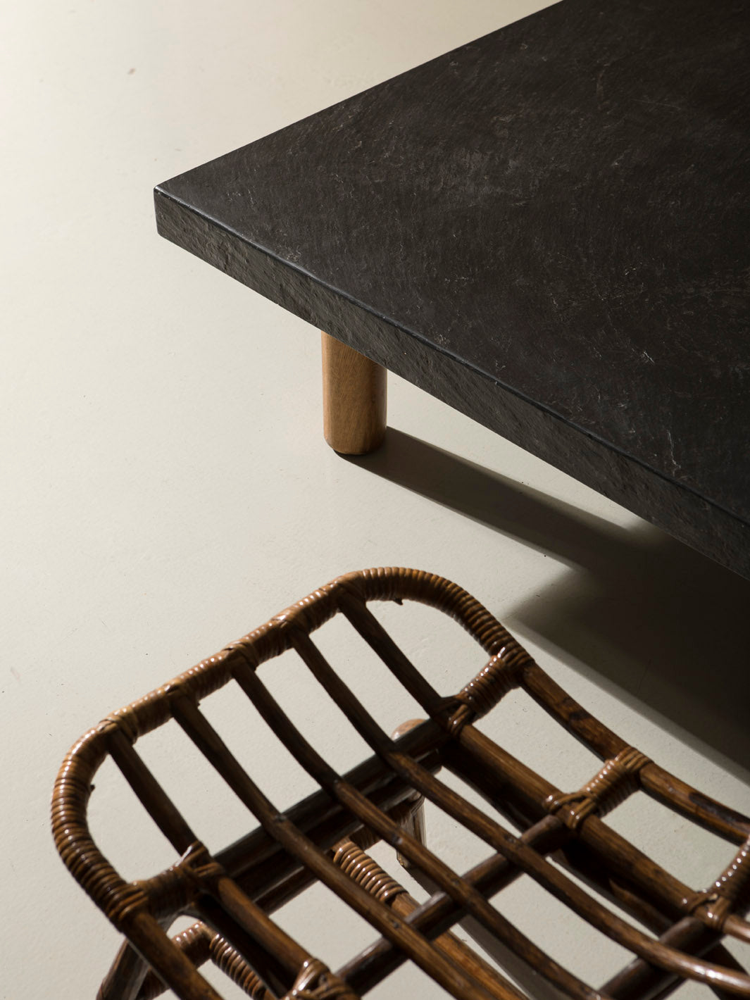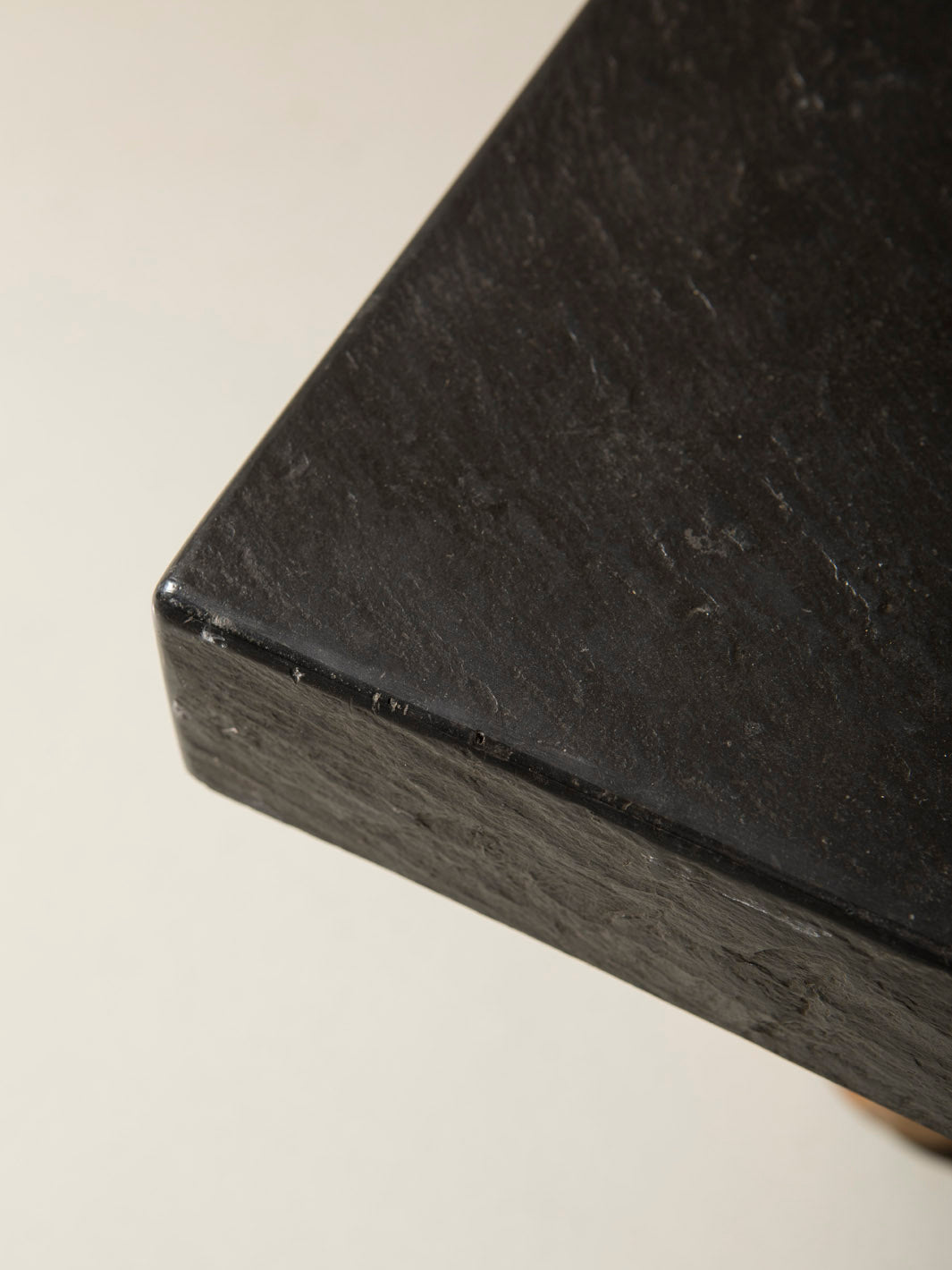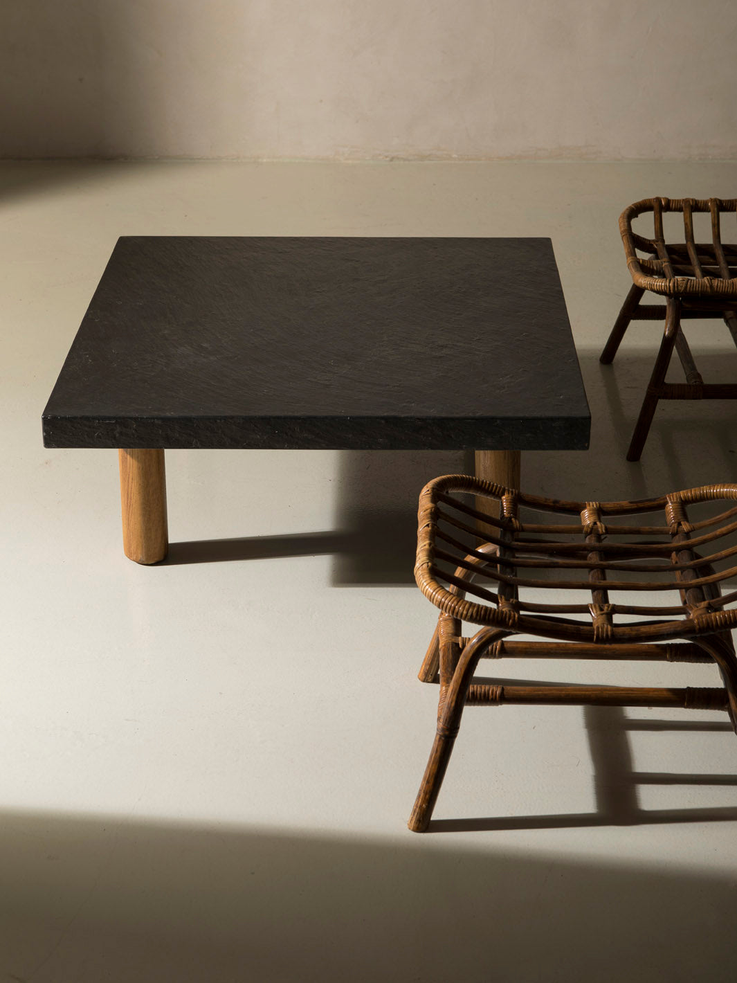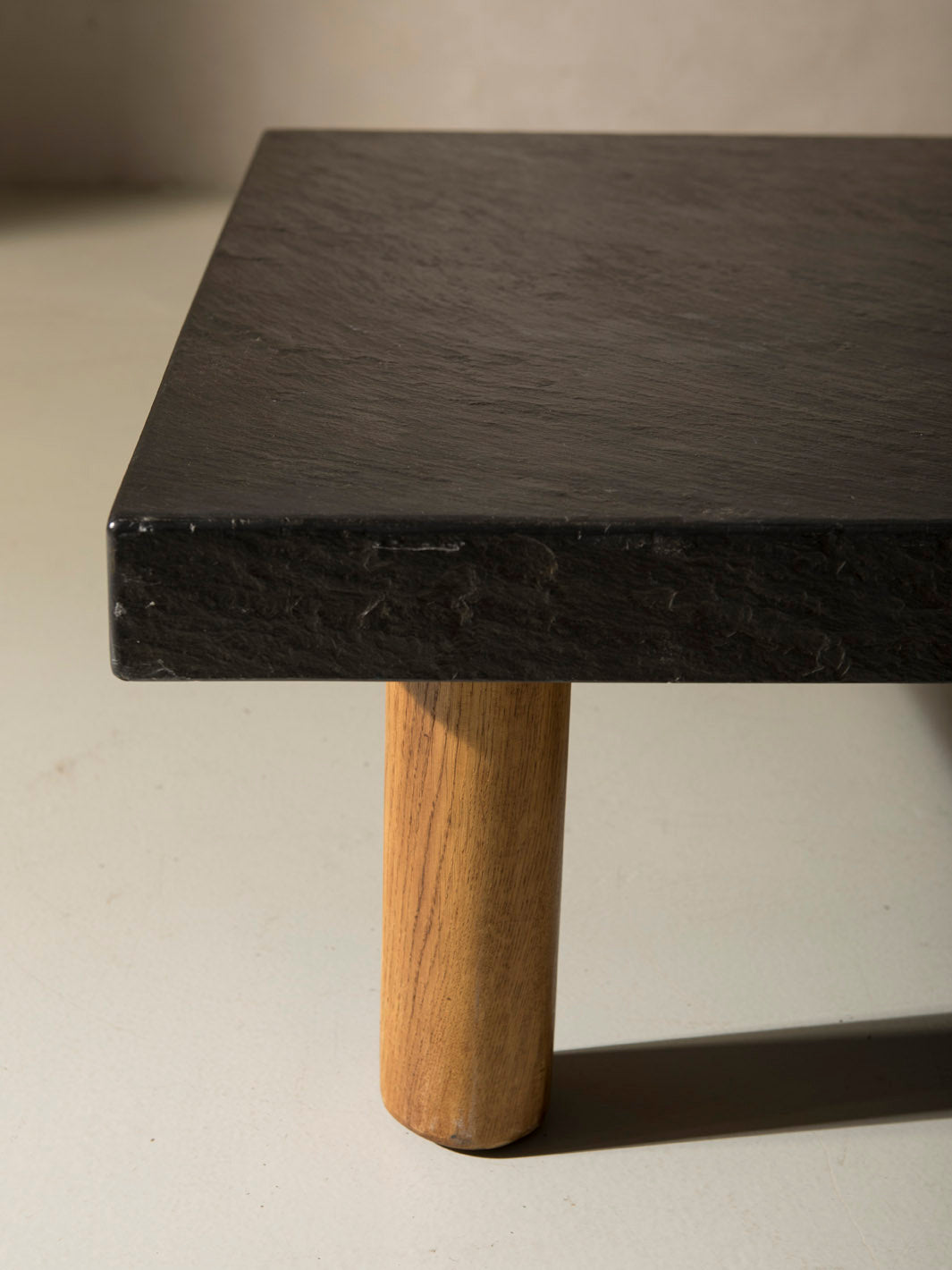 Mesa auxiliar cuadrada de pizarra con estructura de madera, original de Suiza de los años 60.