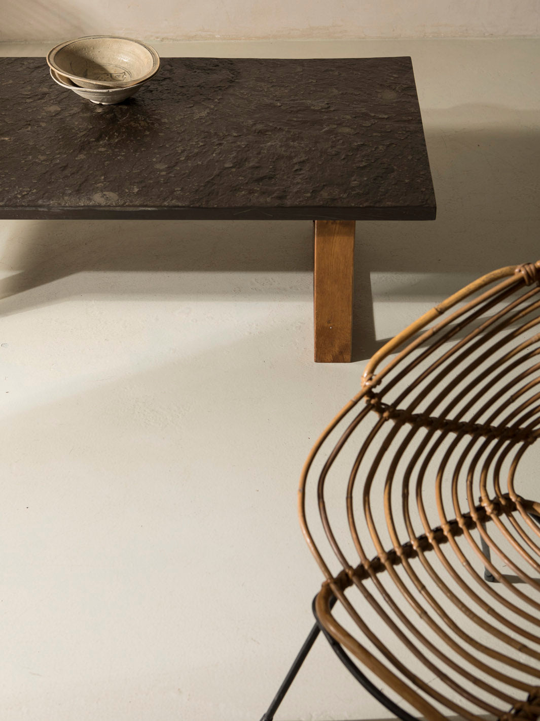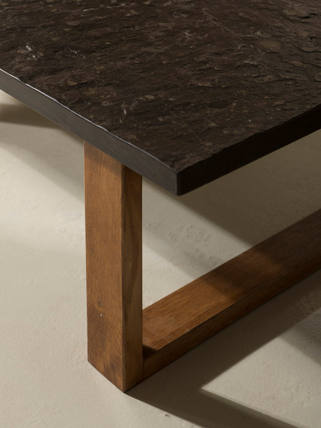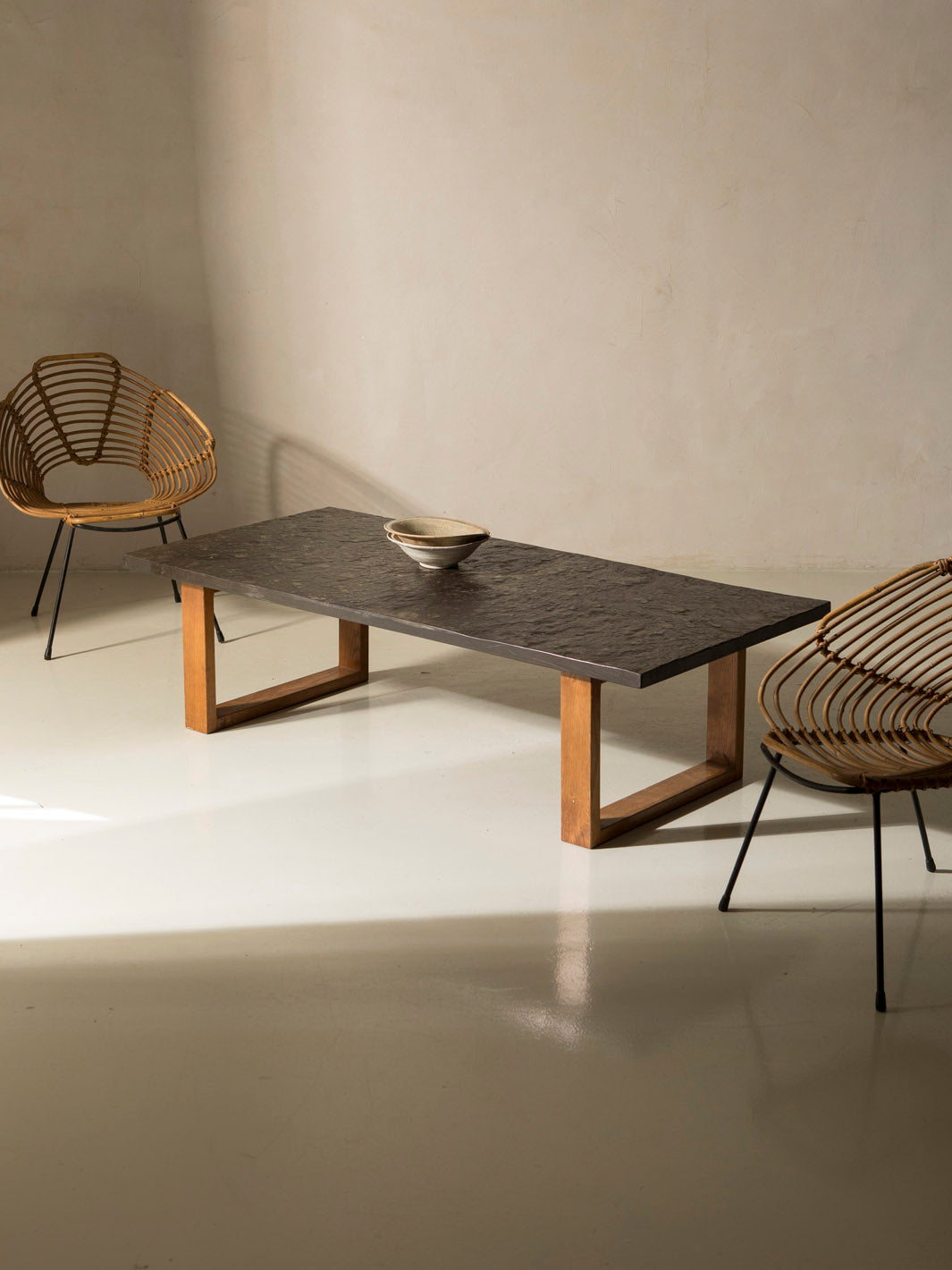 Mesa de centro de pizarra con estructura de madera, original de Suiza de los años 60.