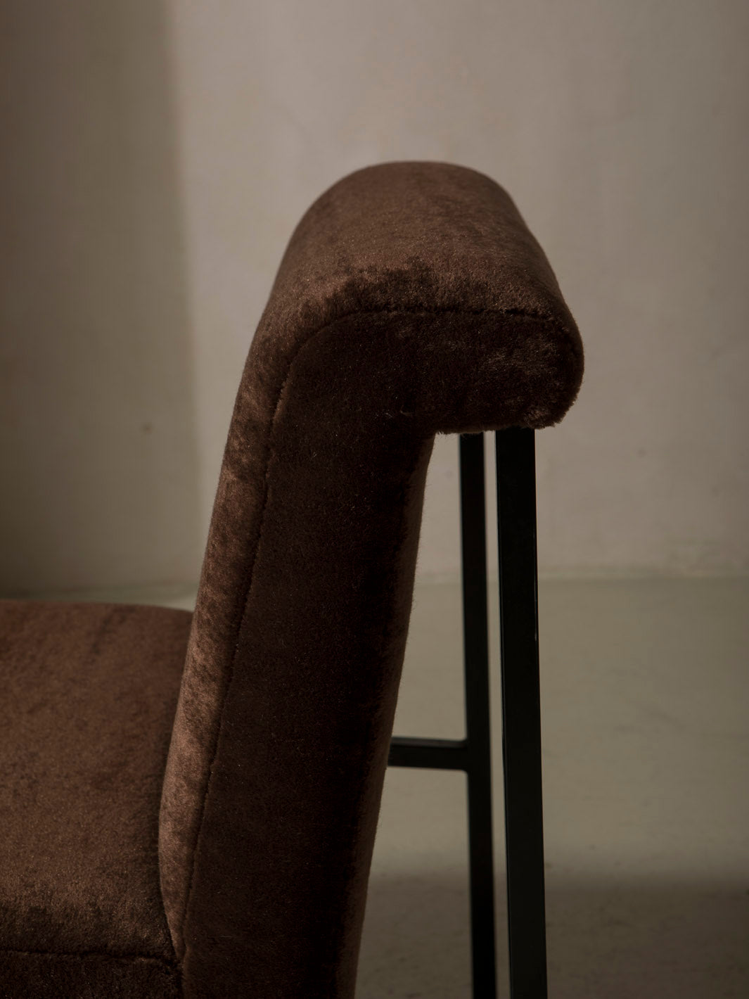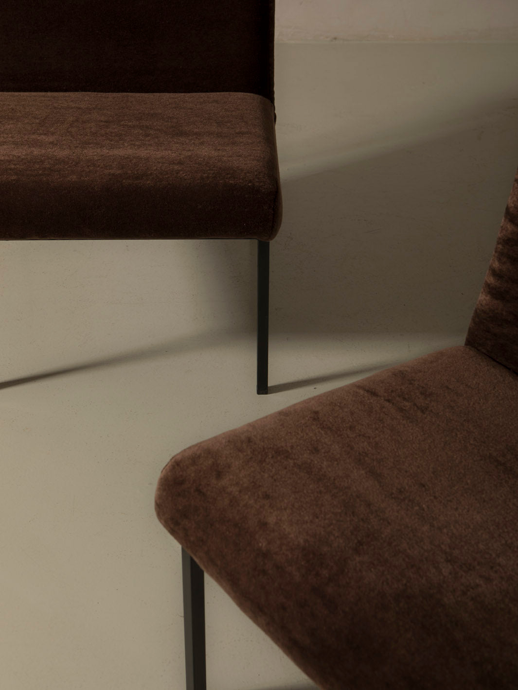 Pareja de butacas originales de Italia de los años 70, con estructura lineal y tapicería de Elitis en terciopelo de mohair marrón.