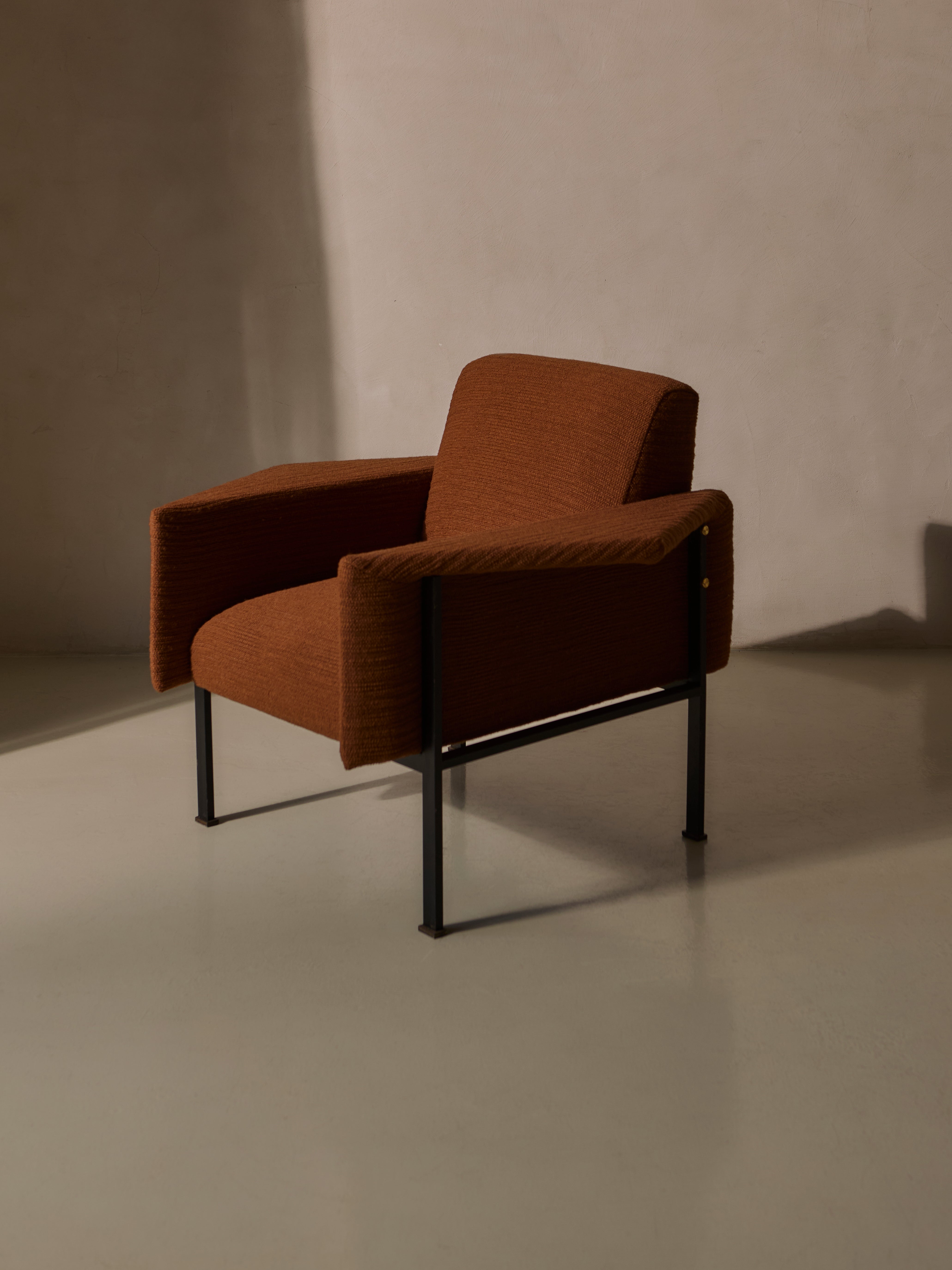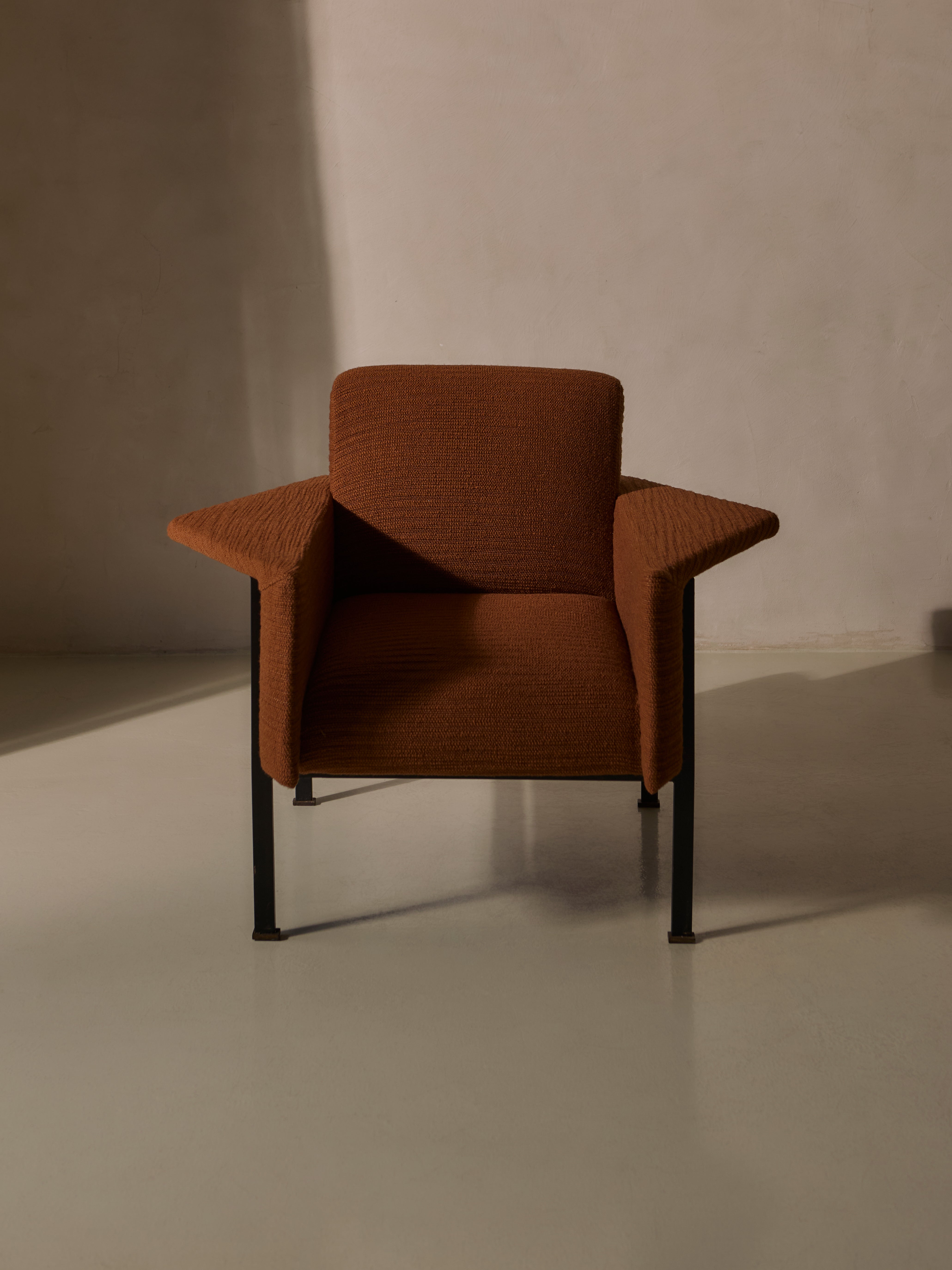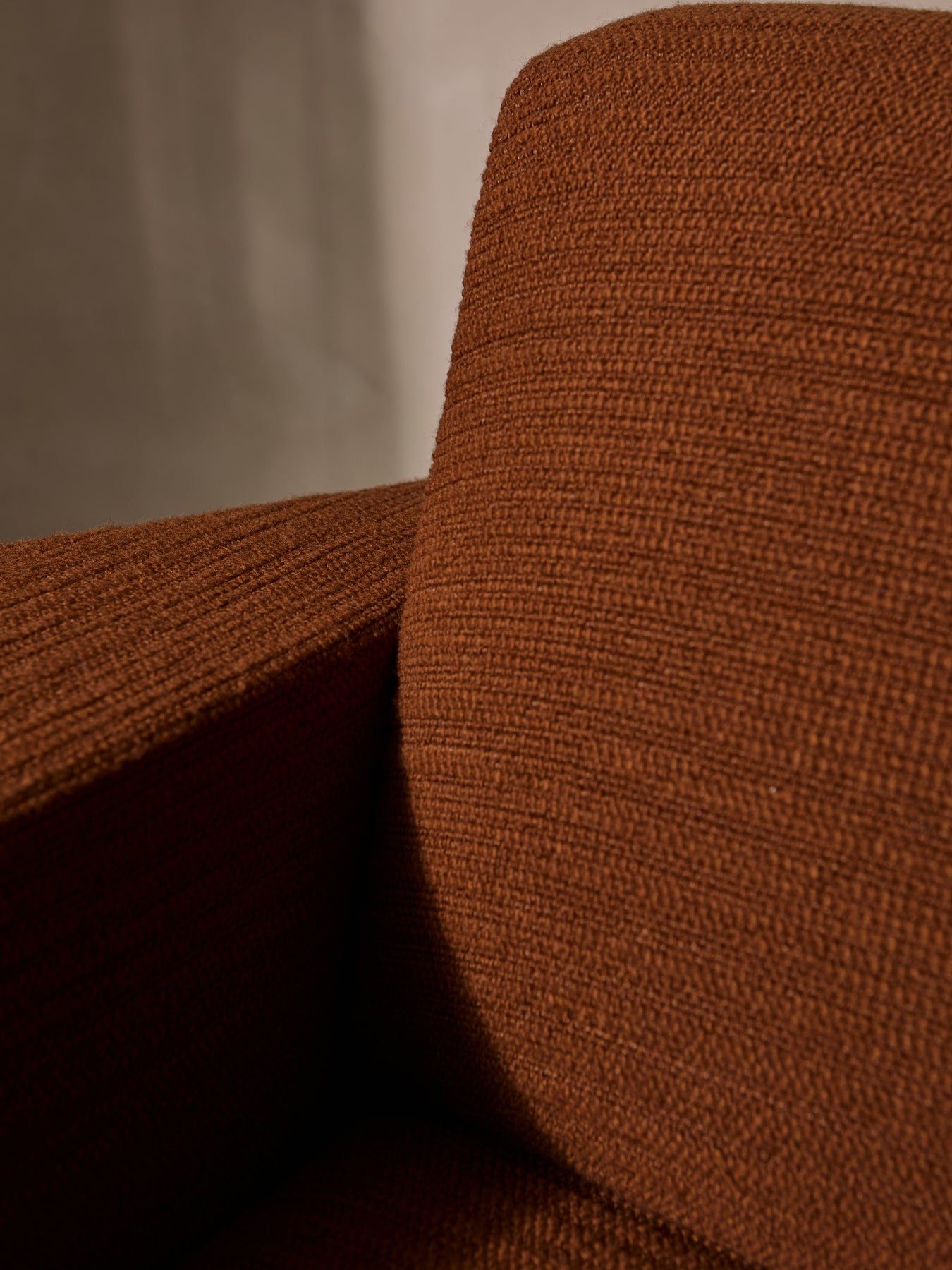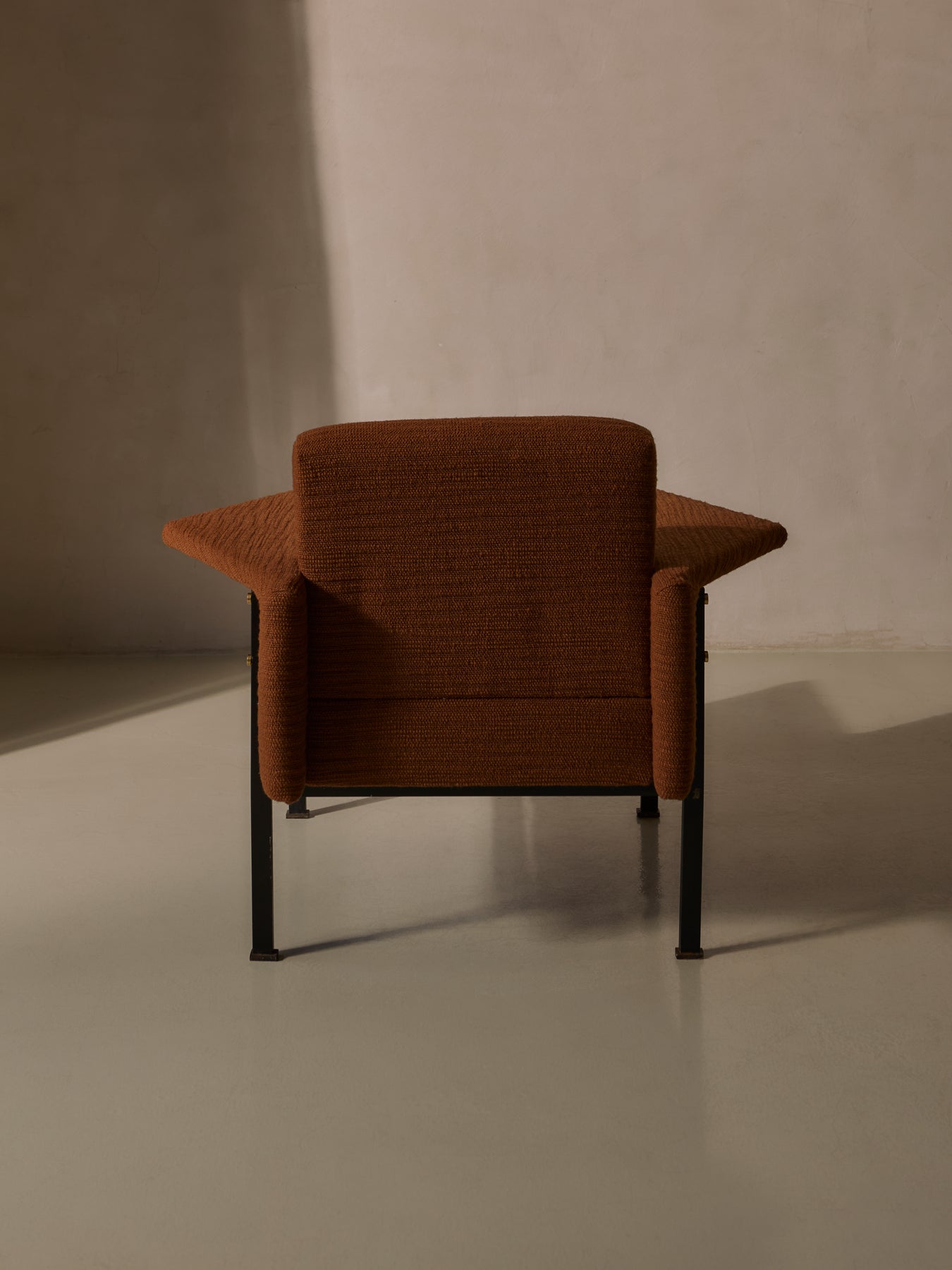 Singular pareja de butacas italianas originales de los años 60, con un diseño inédito en sus brazos. Tapizadas en lana color teja.