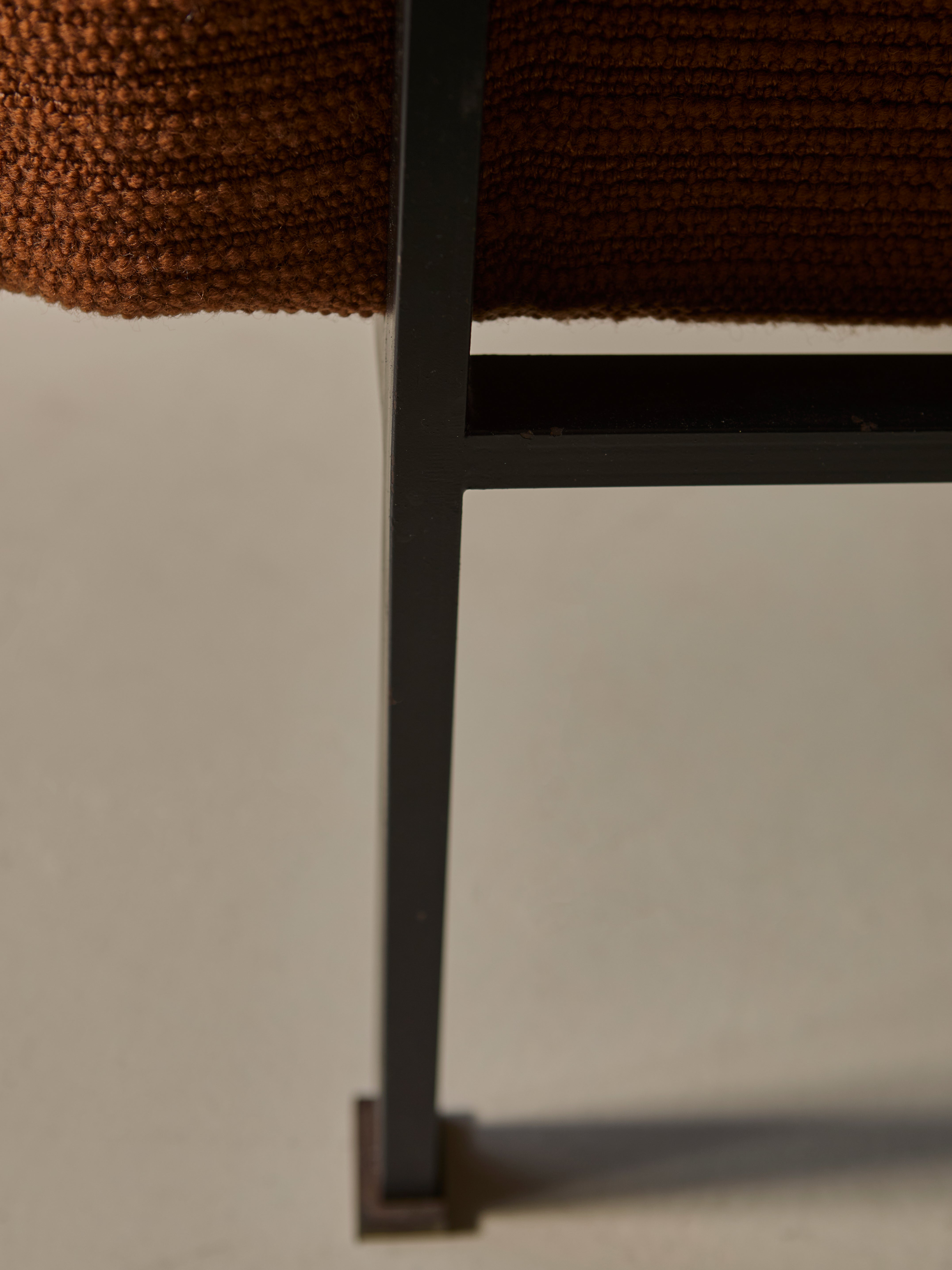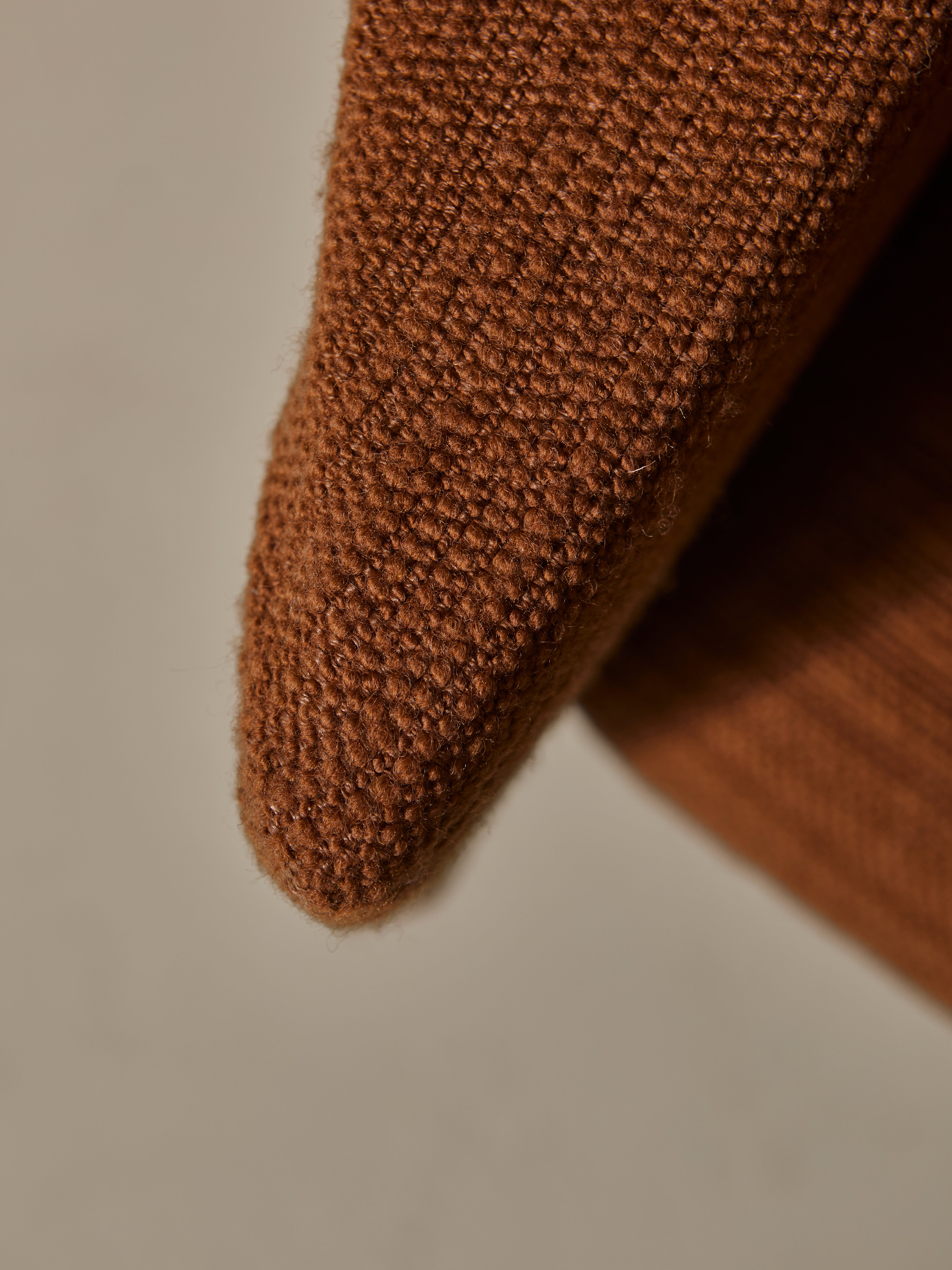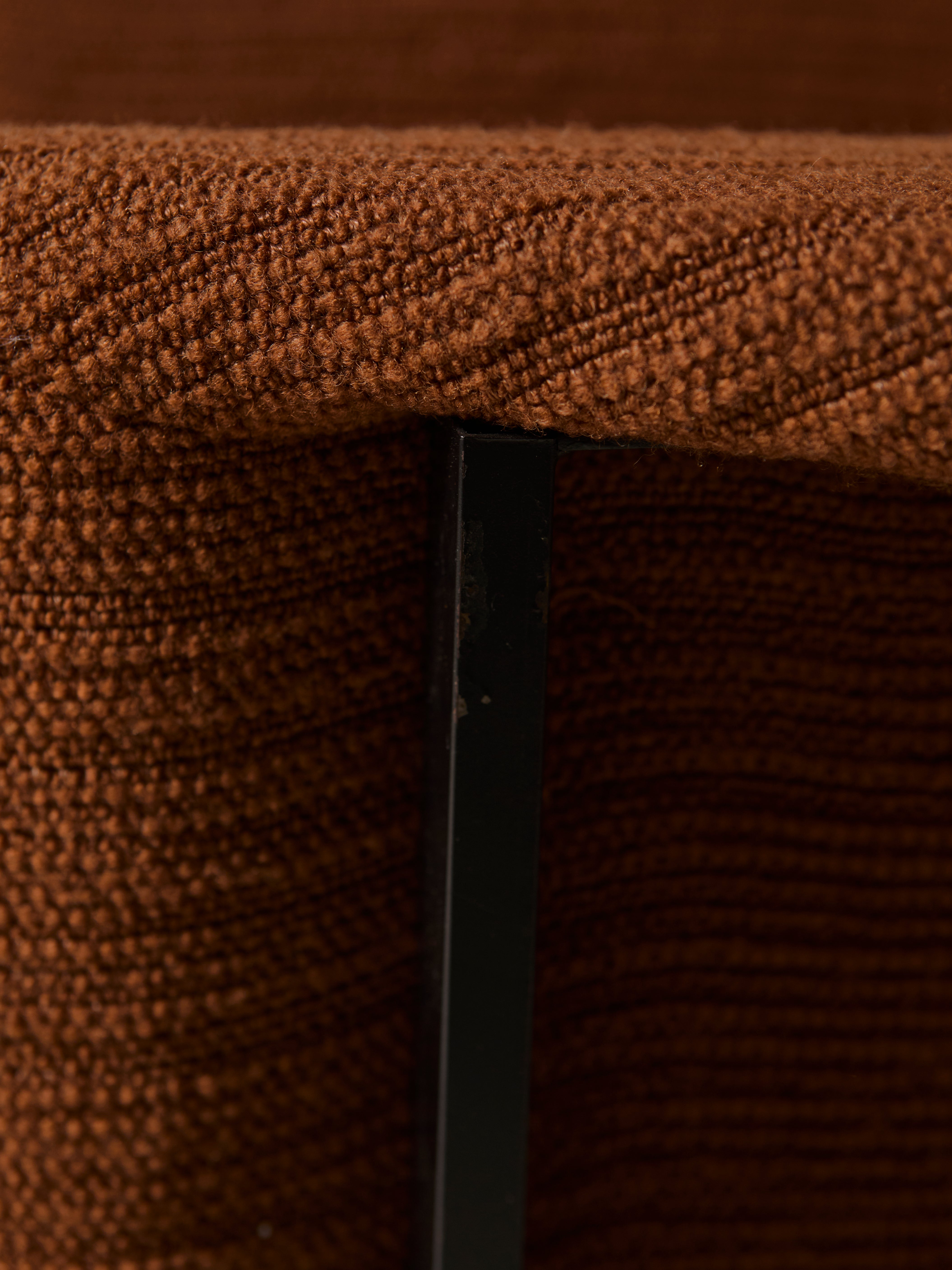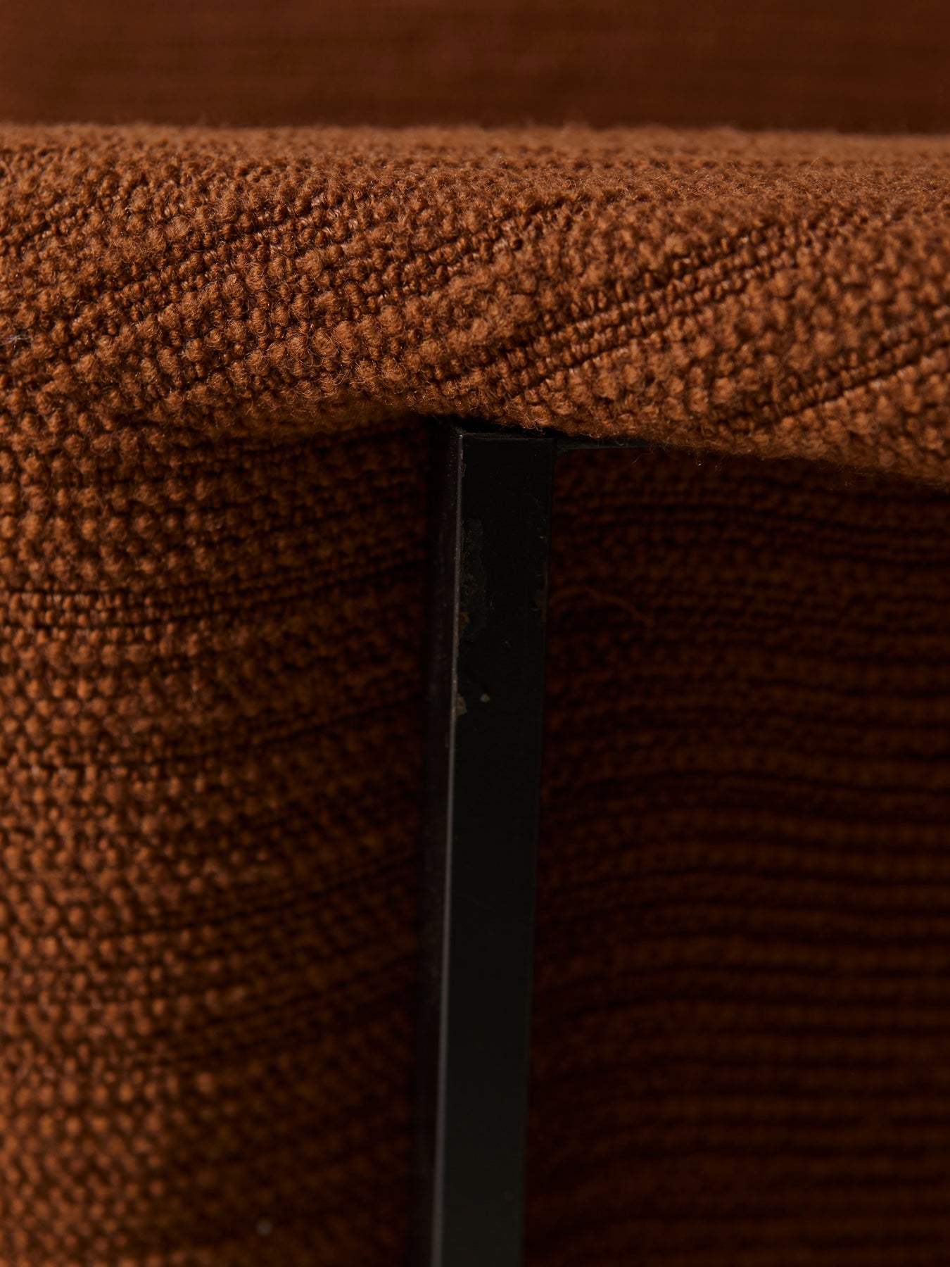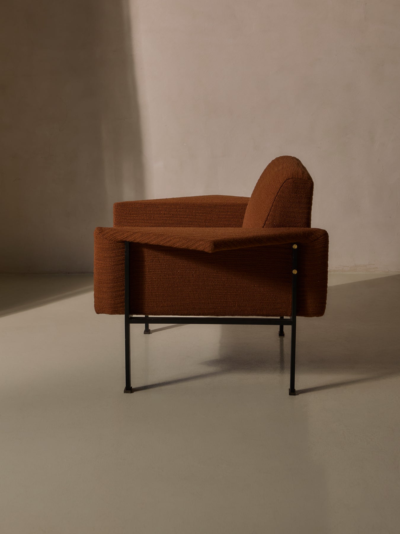 Singular pareja de butacas italianas originales de los años 60, con un diseño inédito en sus brazos. Tapizadas en lana color teja.