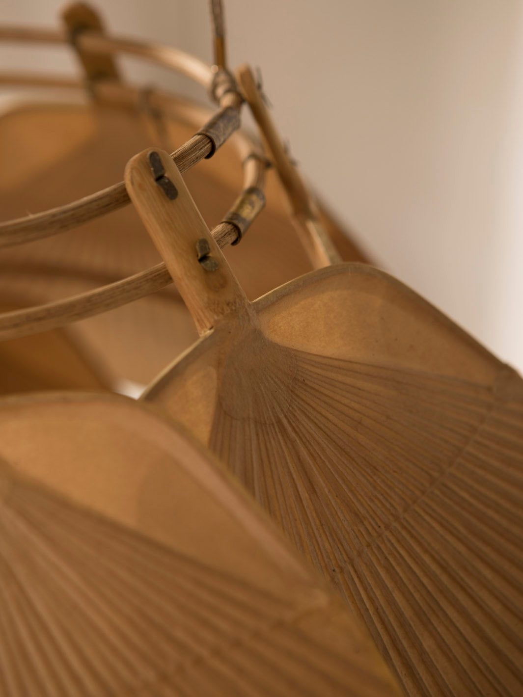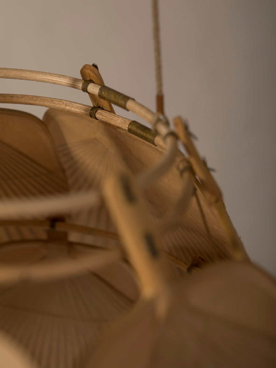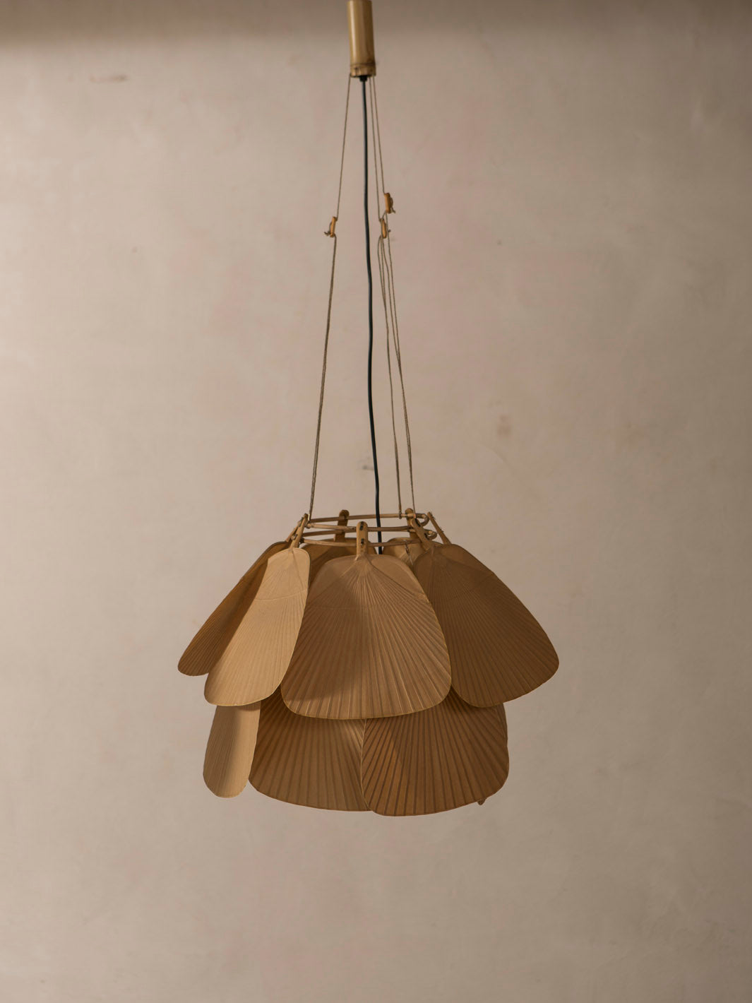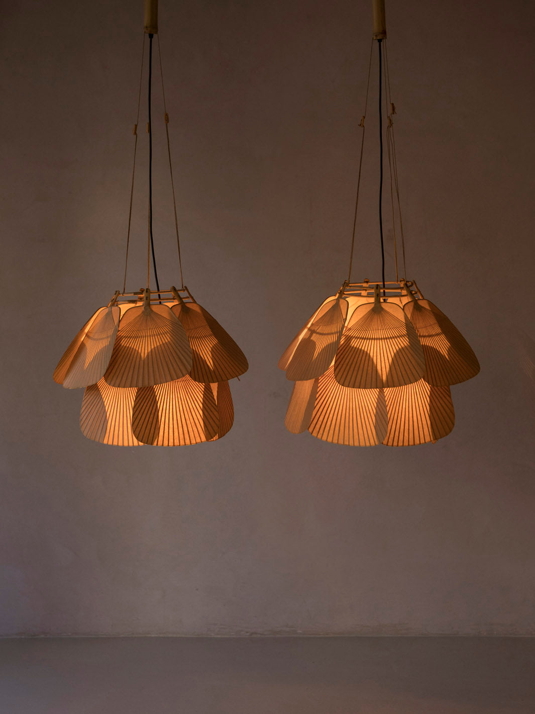 Pareja de lámparas Juyon pertenecientes a la serie Uchiwa, diseñadas por Ingo Maurer en la década de 1970. La colección Uchiwa se basa en la reinterpretación contemporánea del abanico japonés tradicional, utilizando materiales naturales y procesos artesanales. Cada pieza combina una estructura formada por varillas de bambú con un difusor realizado en fibra vegetal tensada, lo que permite una dispersión suave y uniforme de la luz. El modelo Juyon se caracteriza por su silueta en abanico y su ligereza estructural, manteniendo los principios formales de Maurer en torno a la luz como elemento poético y material orgánico. Conexión eléctrica y herrajes originales de época.