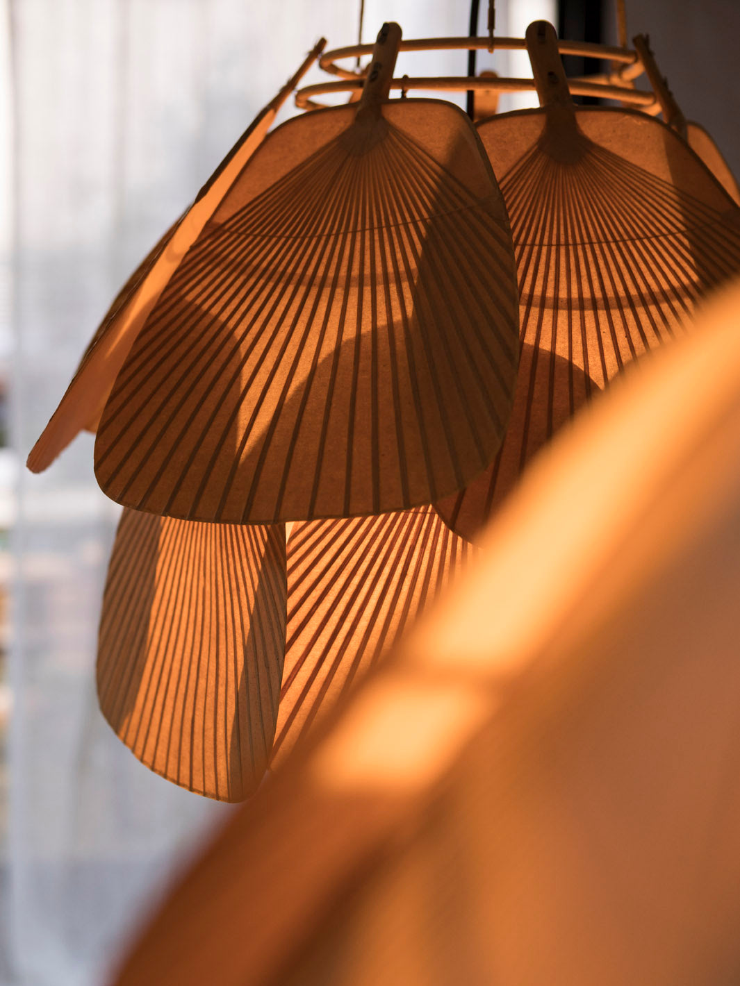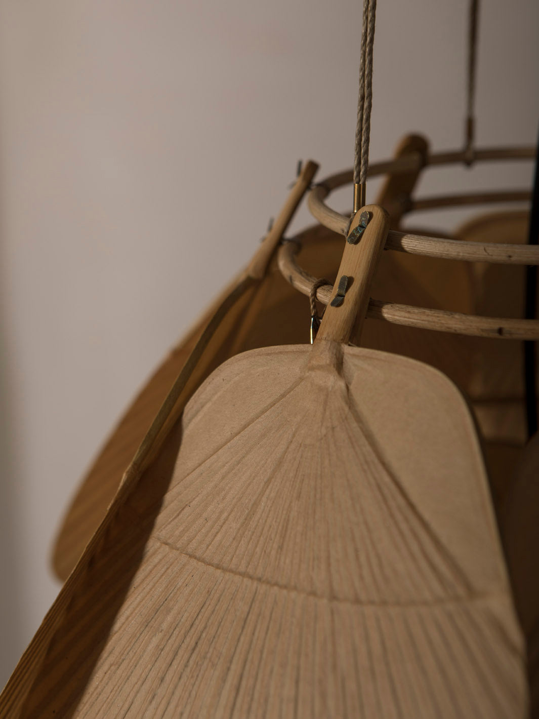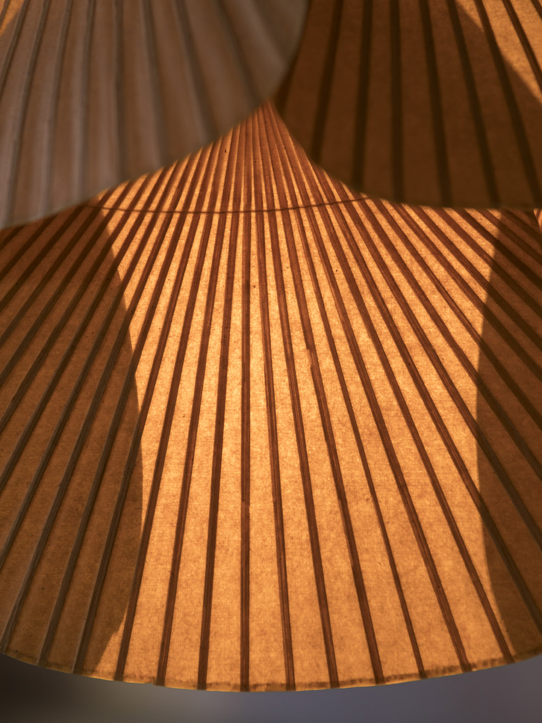 Pareja de lámparas Juyon pertenecientes a la serie Uchiwa, diseñadas por Ingo Maurer en la década de 1970. La colección Uchiwa se basa en la reinterpretación contemporánea del abanico japonés tradicional, utilizando materiales naturales y procesos artesanales. Cada pieza combina una estructura formada por varillas de bambú con un difusor realizado en fibra vegetal tensada, lo que permite una dispersión suave y uniforme de la luz. El modelo Juyon se caracteriza por su silueta en abanico y su ligereza estructural, manteniendo los principios formales de Maurer en torno a la luz como elemento poético y material orgánico. Conexión eléctrica y herrajes originales de época.
