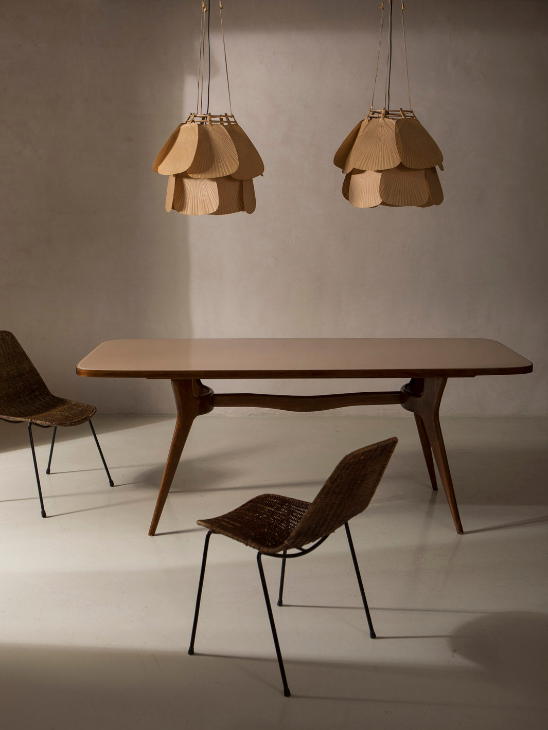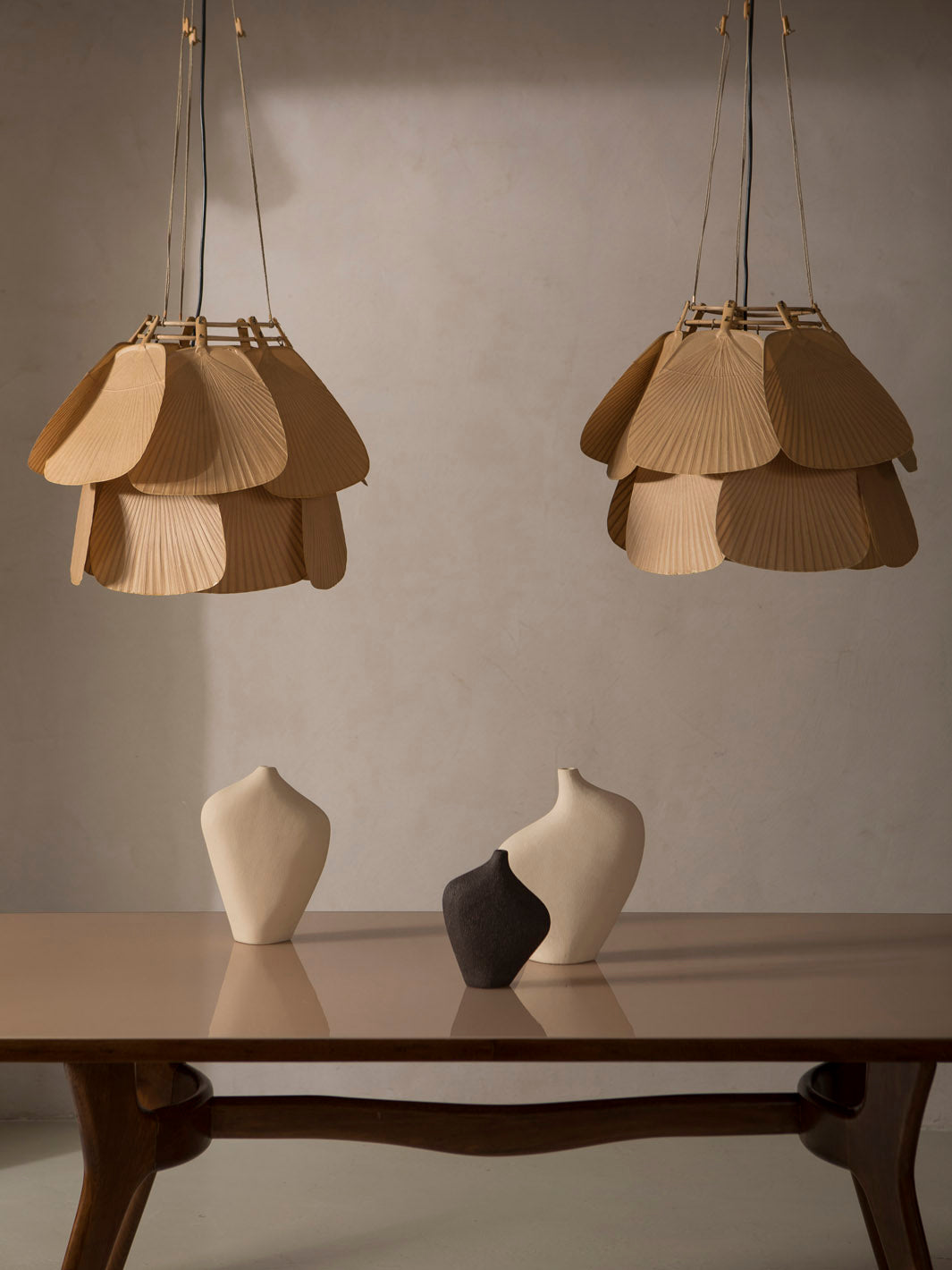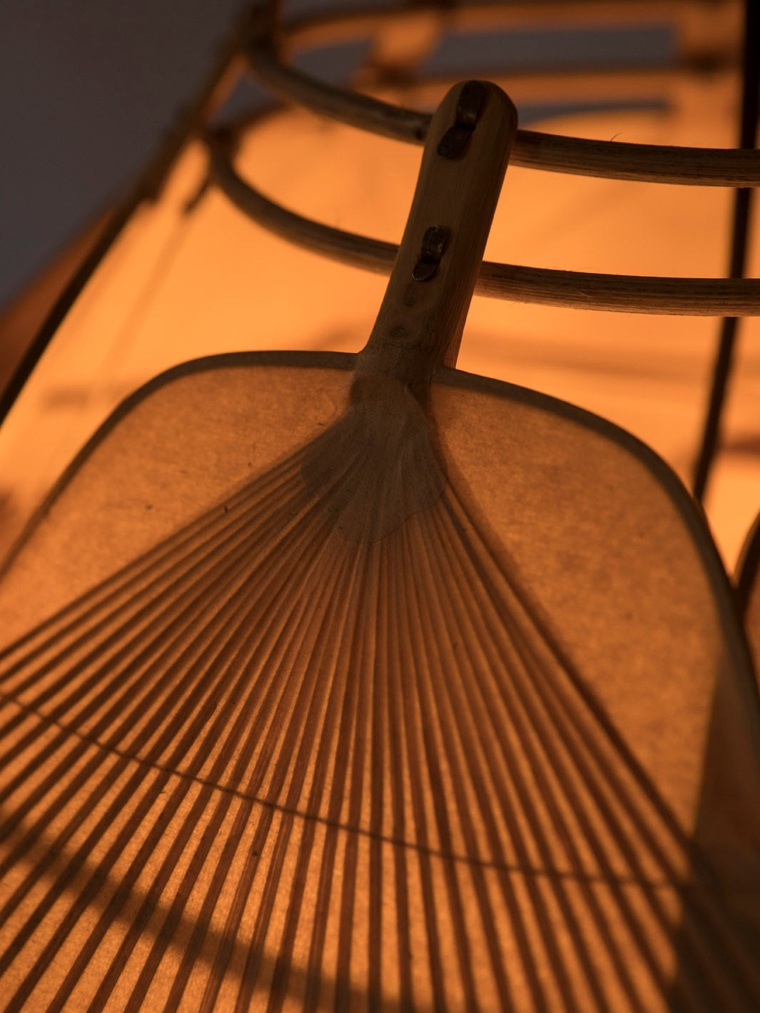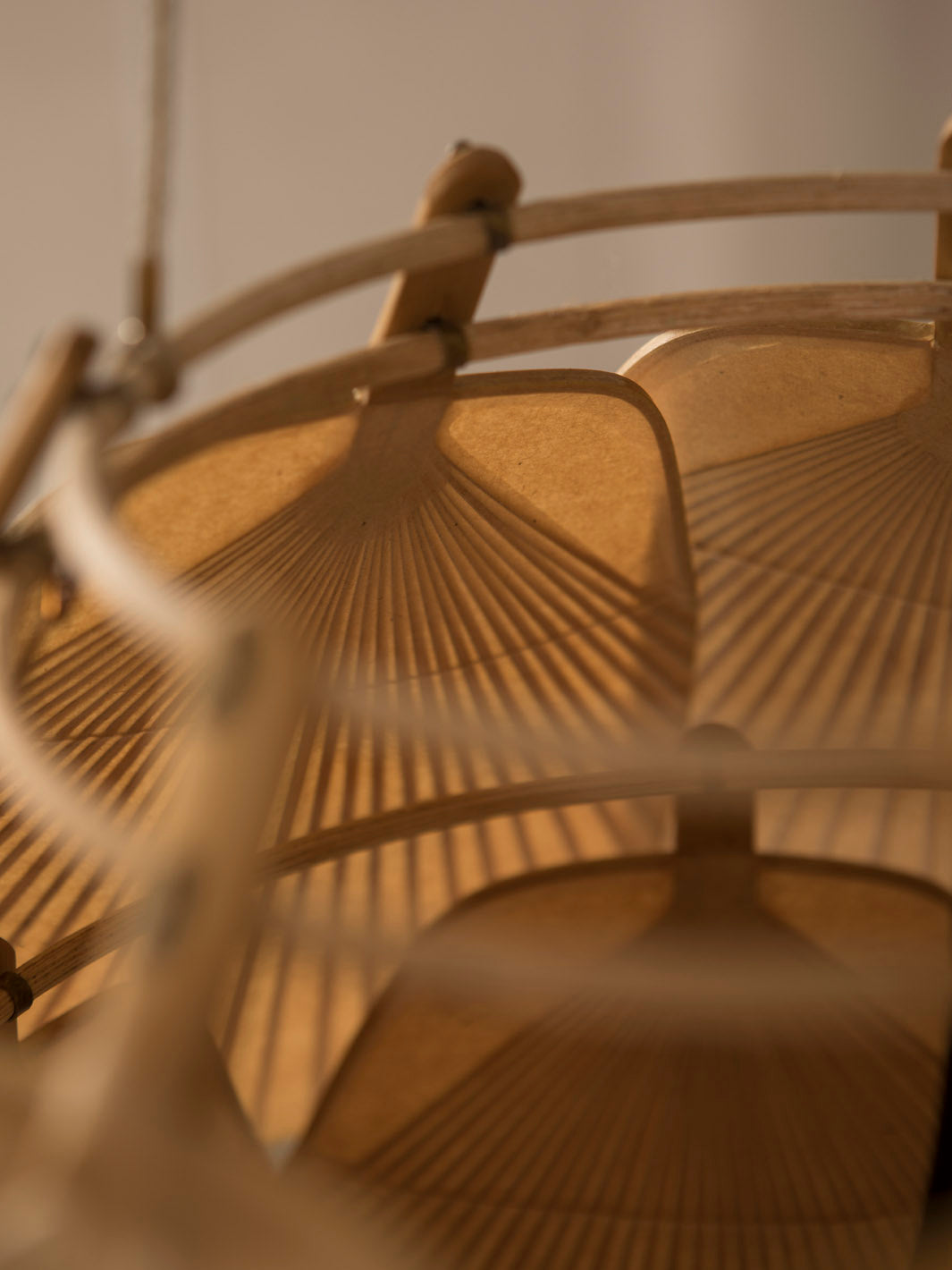 Pareja de lámparas Juyon pertenecientes a la serie Uchiwa, diseñadas por Ingo Maurer en la década de 1970. La colección Uchiwa se basa en la reinterpretación contemporánea del abanico japonés tradicional, utilizando materiales naturales y procesos artesanales. Cada pieza combina una estructura formada por varillas de bambú con un difusor realizado en fibra vegetal tensada, lo que permite una dispersión suave y uniforme de la luz. El modelo Juyon se caracteriza por su silueta en abanico y su ligereza estructural, manteniendo los principios formales de Maurer en torno a la luz como elemento poético y material orgánico. Conexión eléctrica y herrajes originales de época.