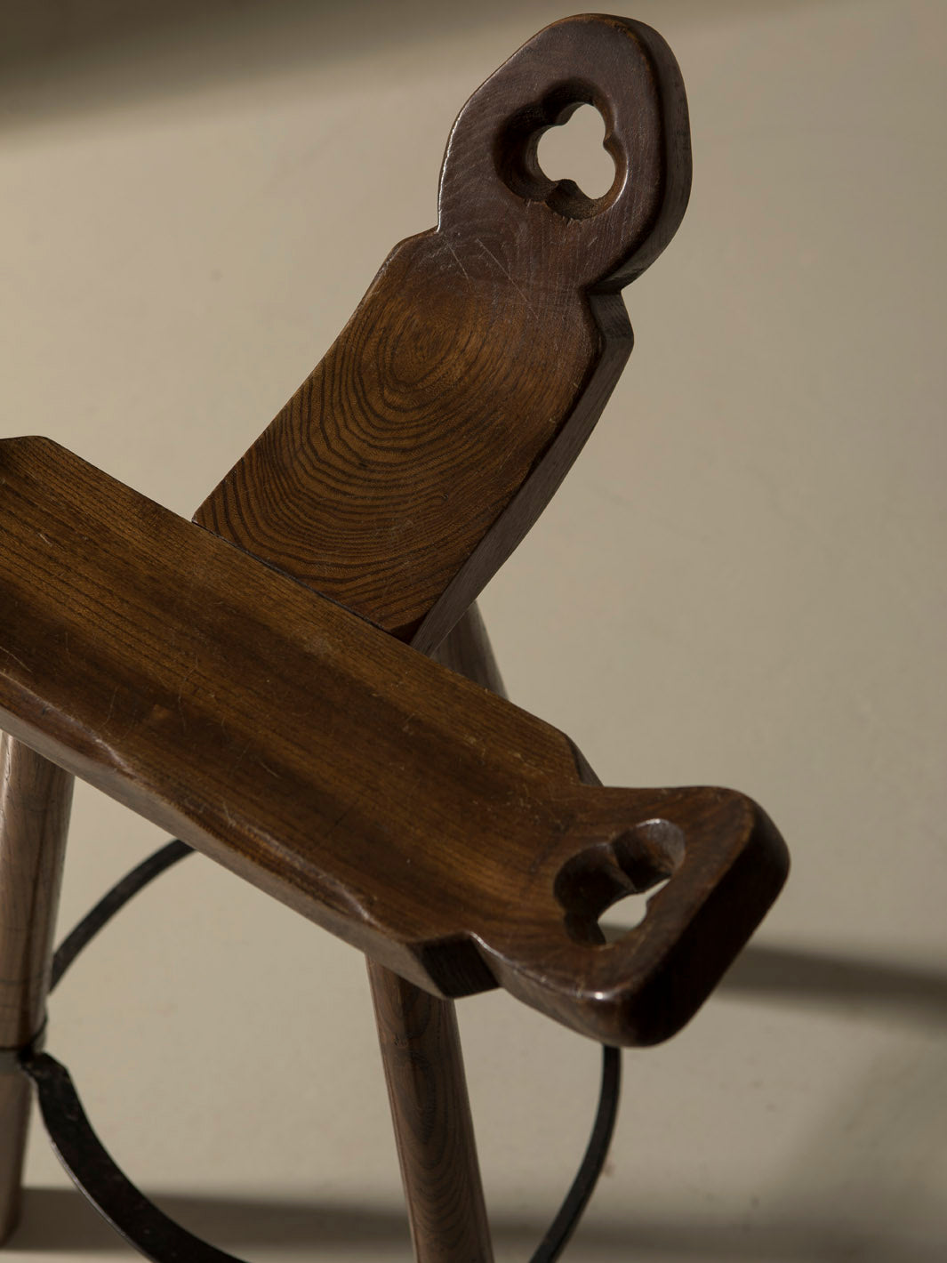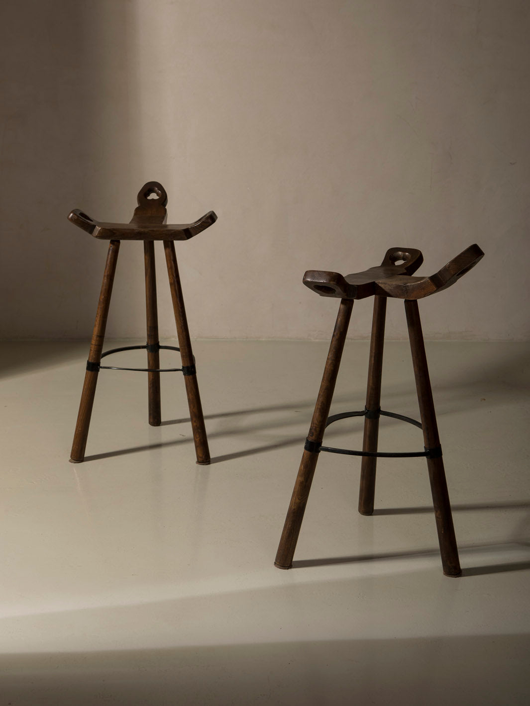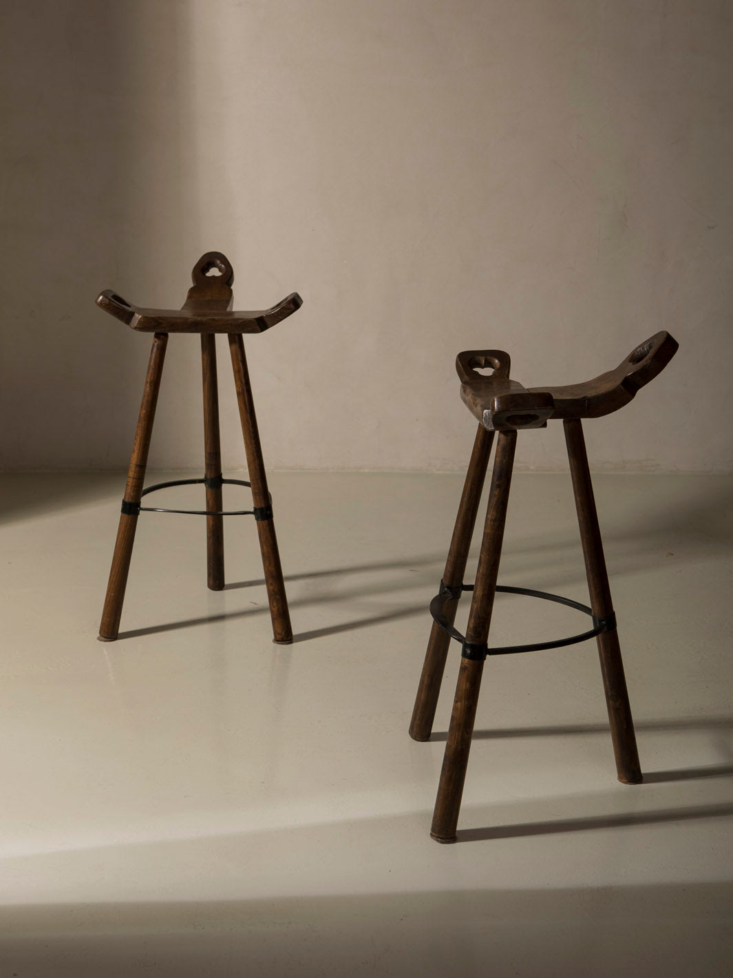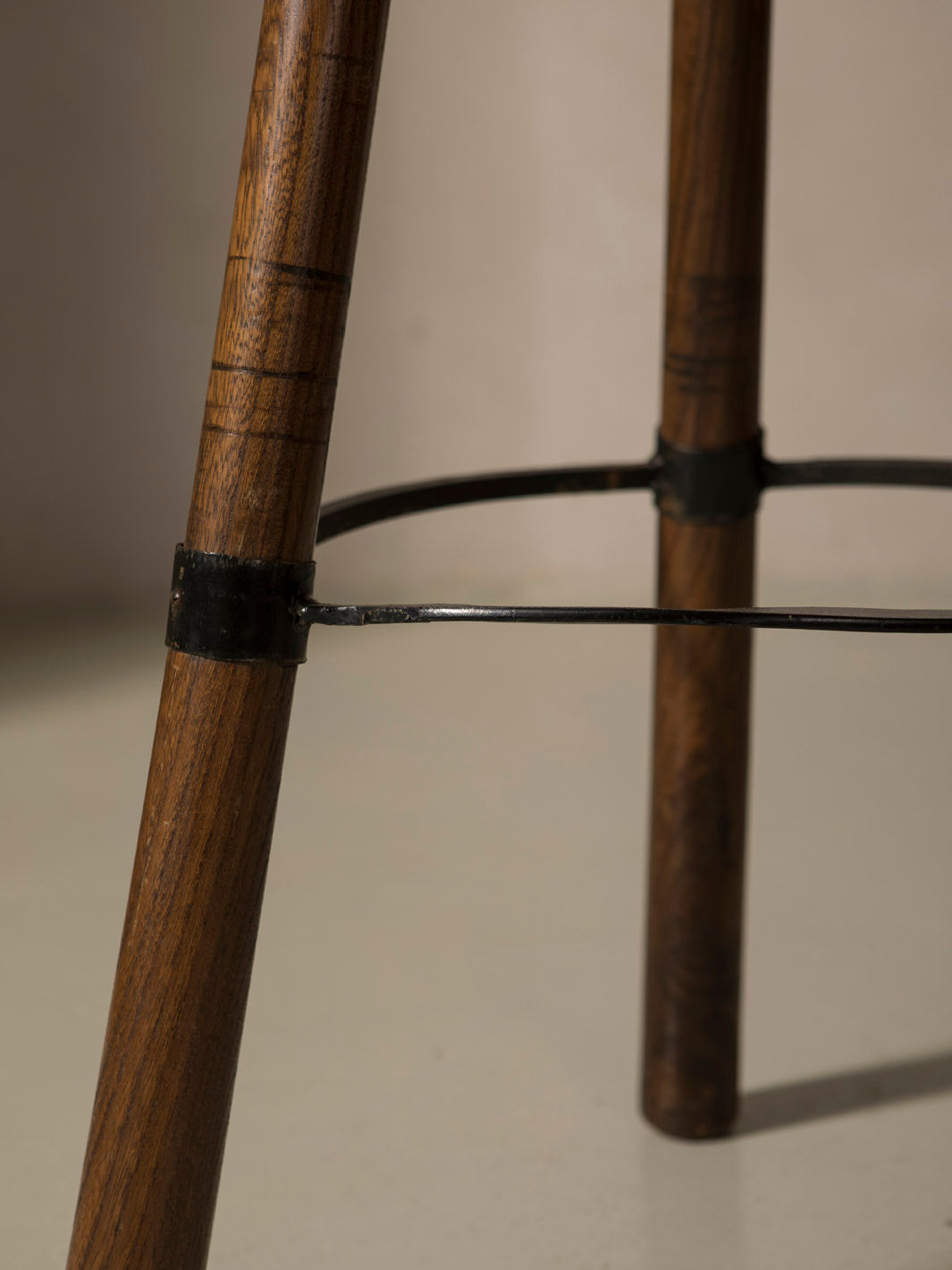 Pareja de taburetes alsacianos originales de los años 50 en madera de nogal y hierro forjado.