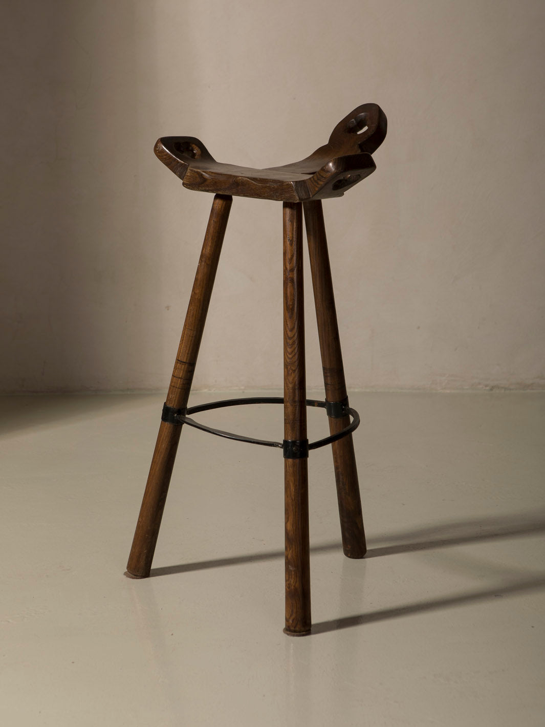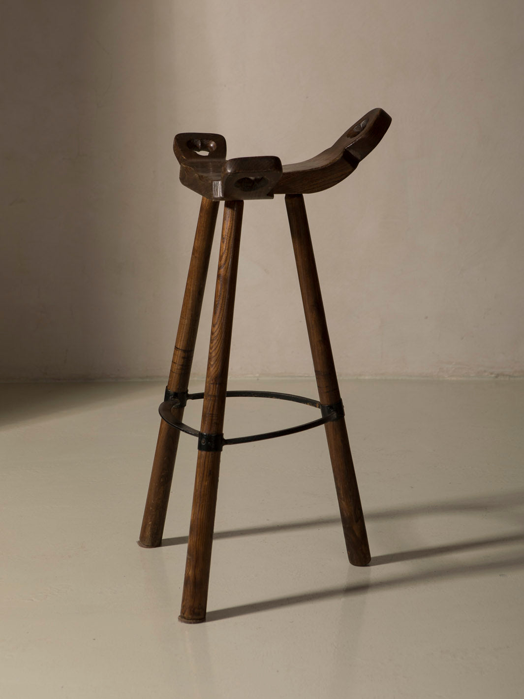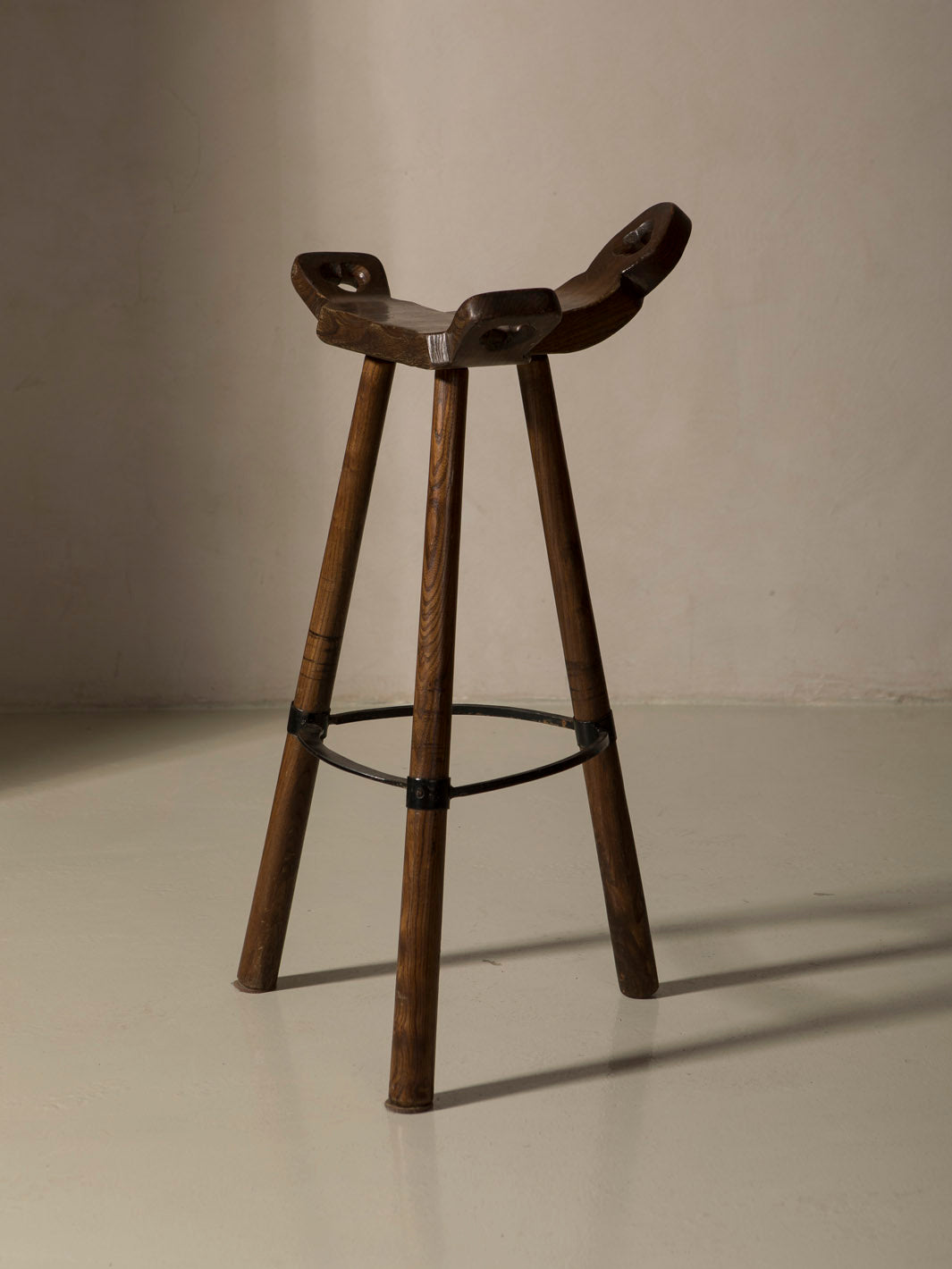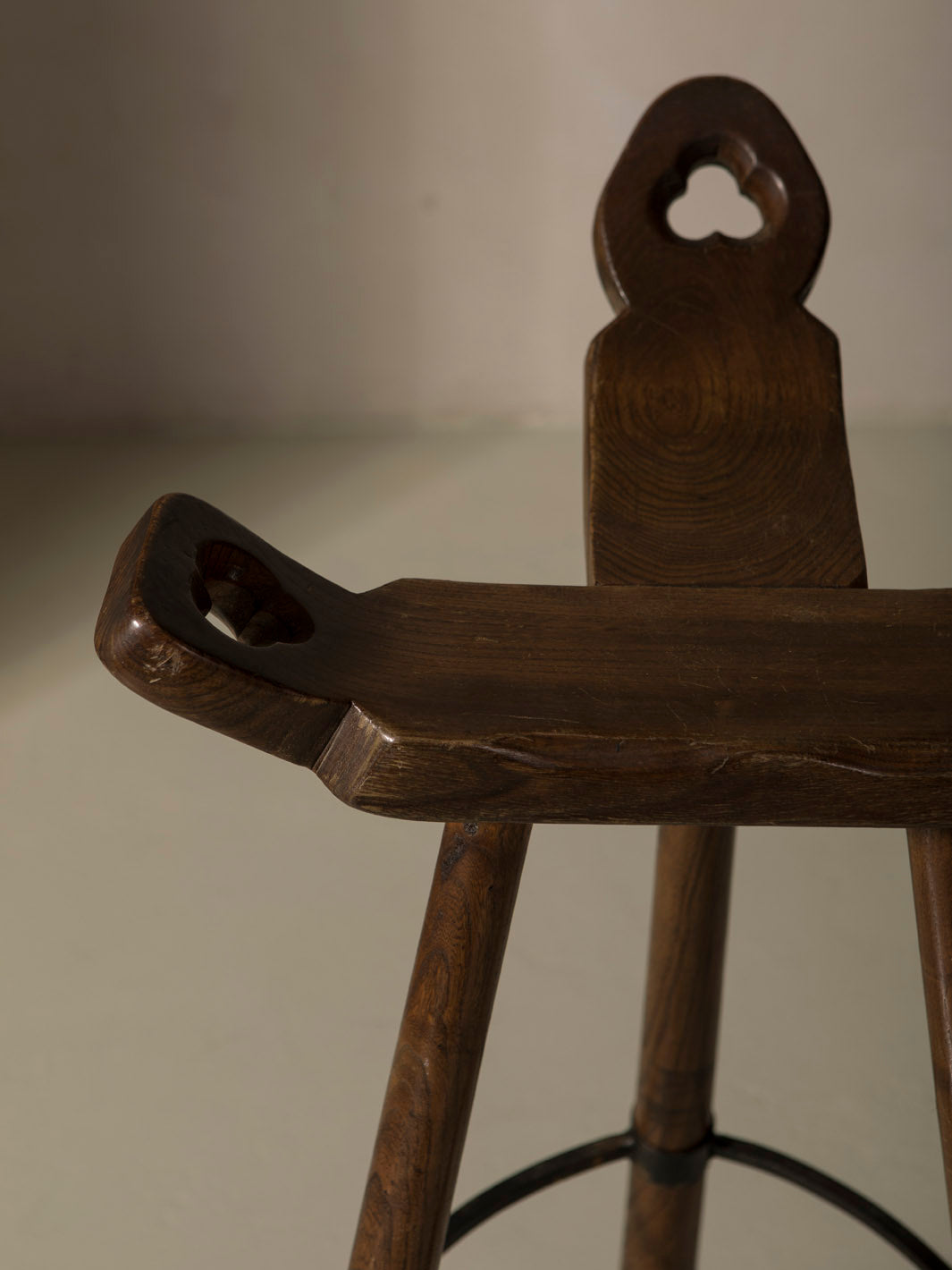 Pareja de taburetes alsacianos originales de los años 50 en madera de nogal y hierro forjado.