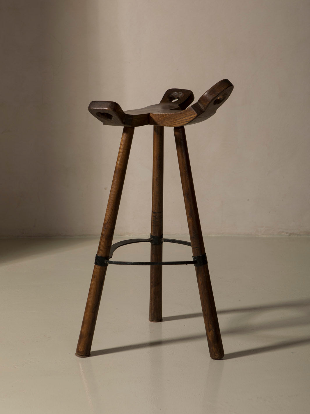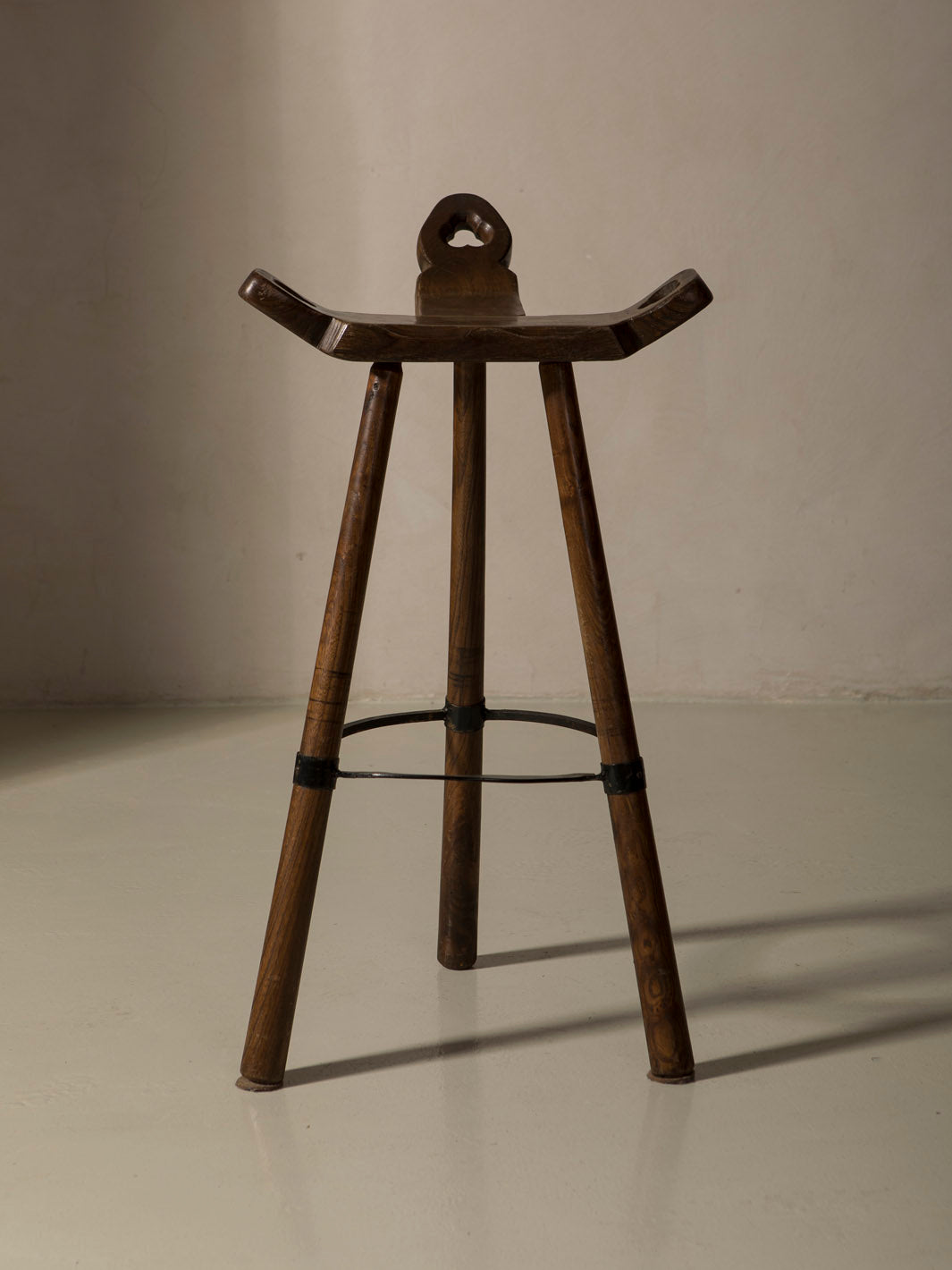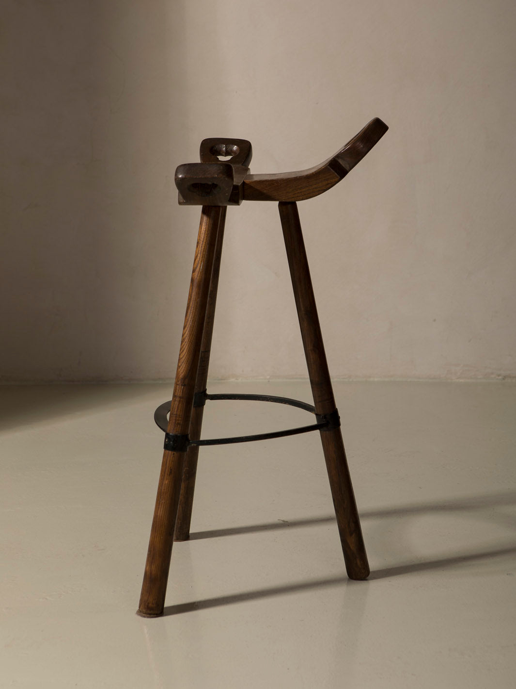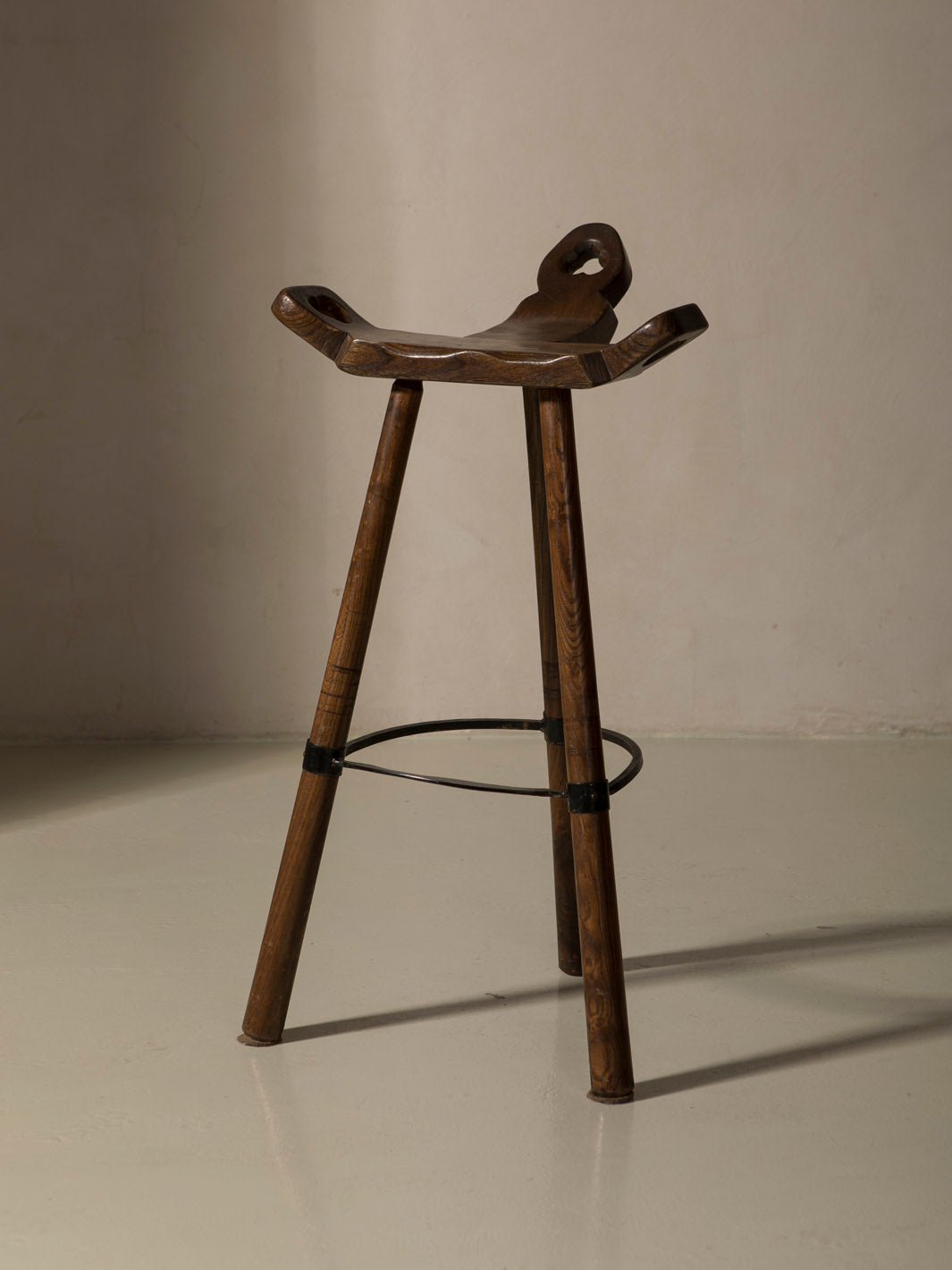 Pareja de taburetes alsacianos originales de los años 50 en madera de nogal y hierro forjado.