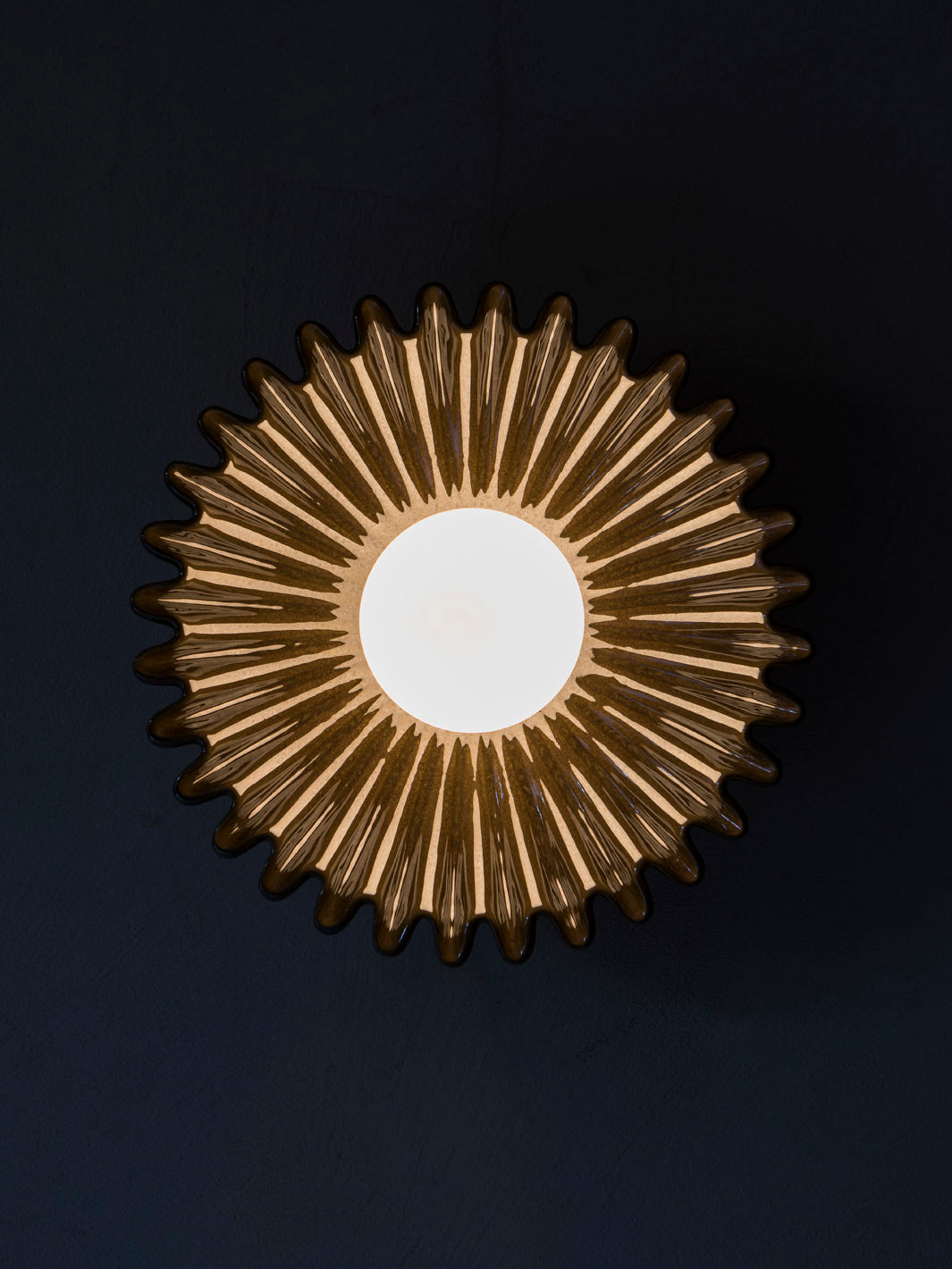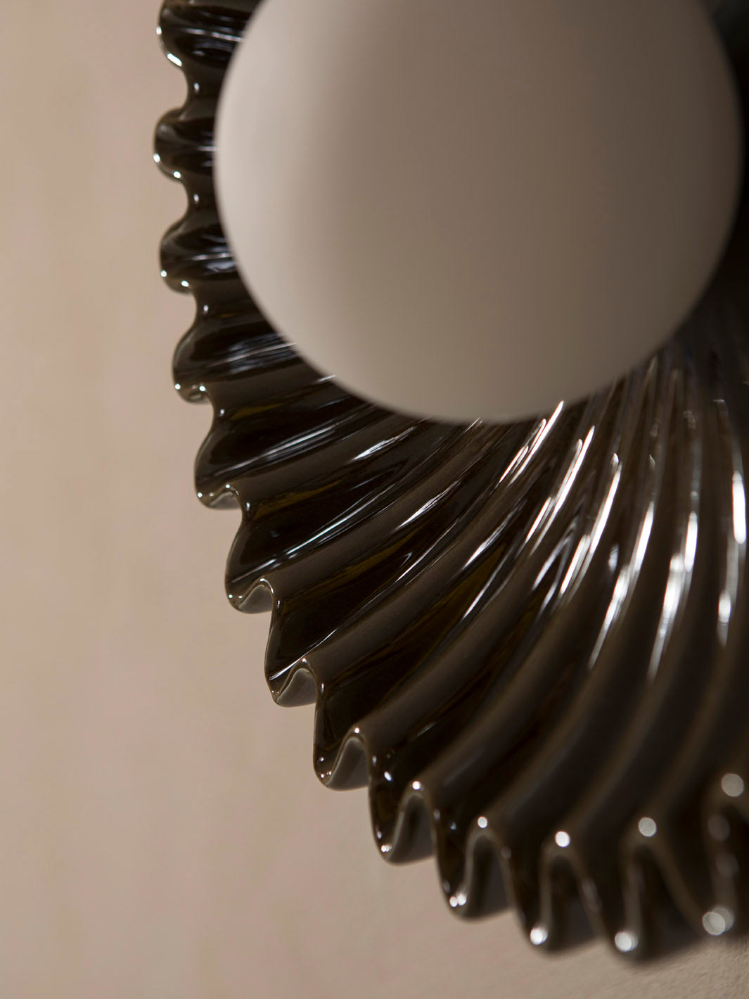 Lámpara de pared artesanal en cerámica Ostro del estudio de diseño Simone & Marcel. Es una pieza hecha de una carcasa detallada en forma de concha que anida el globo de vidrio como si de una perla se tratara. Una pieza funcional y escultural ya sea una sola o en pareja. Irradia una luz lechosa y cálida.