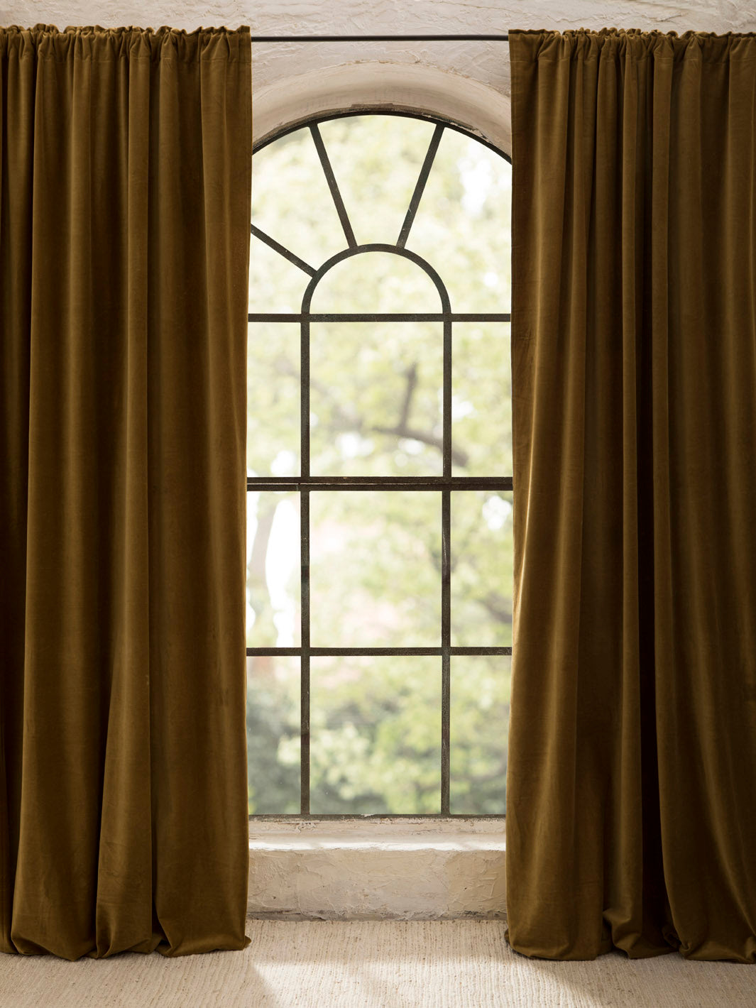 Ecru cotton velvet curtain with beige linen trim. The price includes a curtain drop and rings.