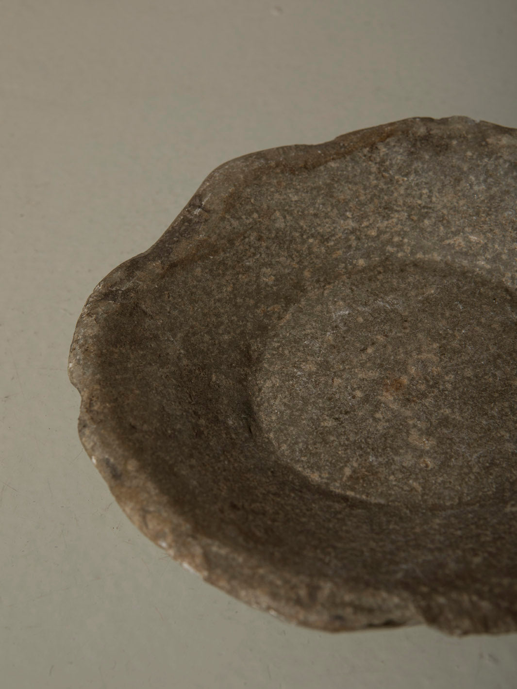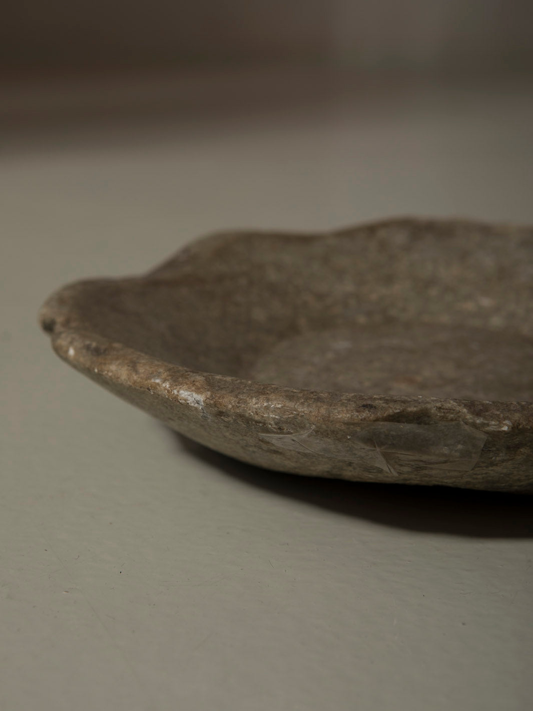 An antique offering plate from India, crafted from stone with a round shape and edges that show natural wear resulting from time and ritual use. Its surface has an earthy patina and mineral flecks that reinforce its authenticity and historical value. Traditionally used in spiritual ceremonies to present offerings, this object embodies the simplicity and aesthetic strength of Indian ceremonial art. Ideal as a decorative piece or as a collectible due to its unique character and connection to the sacred.