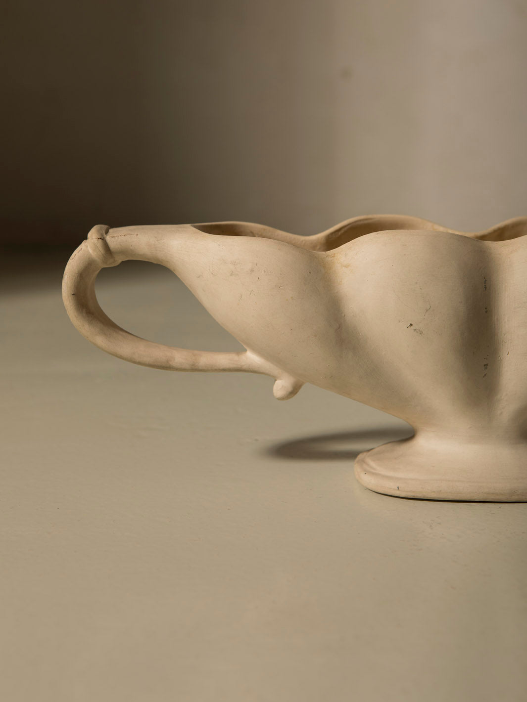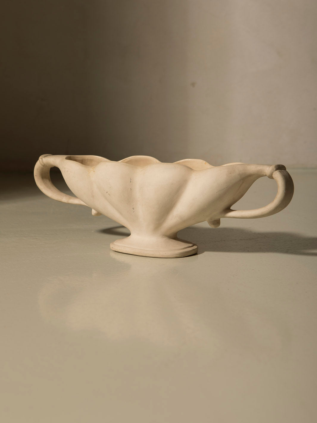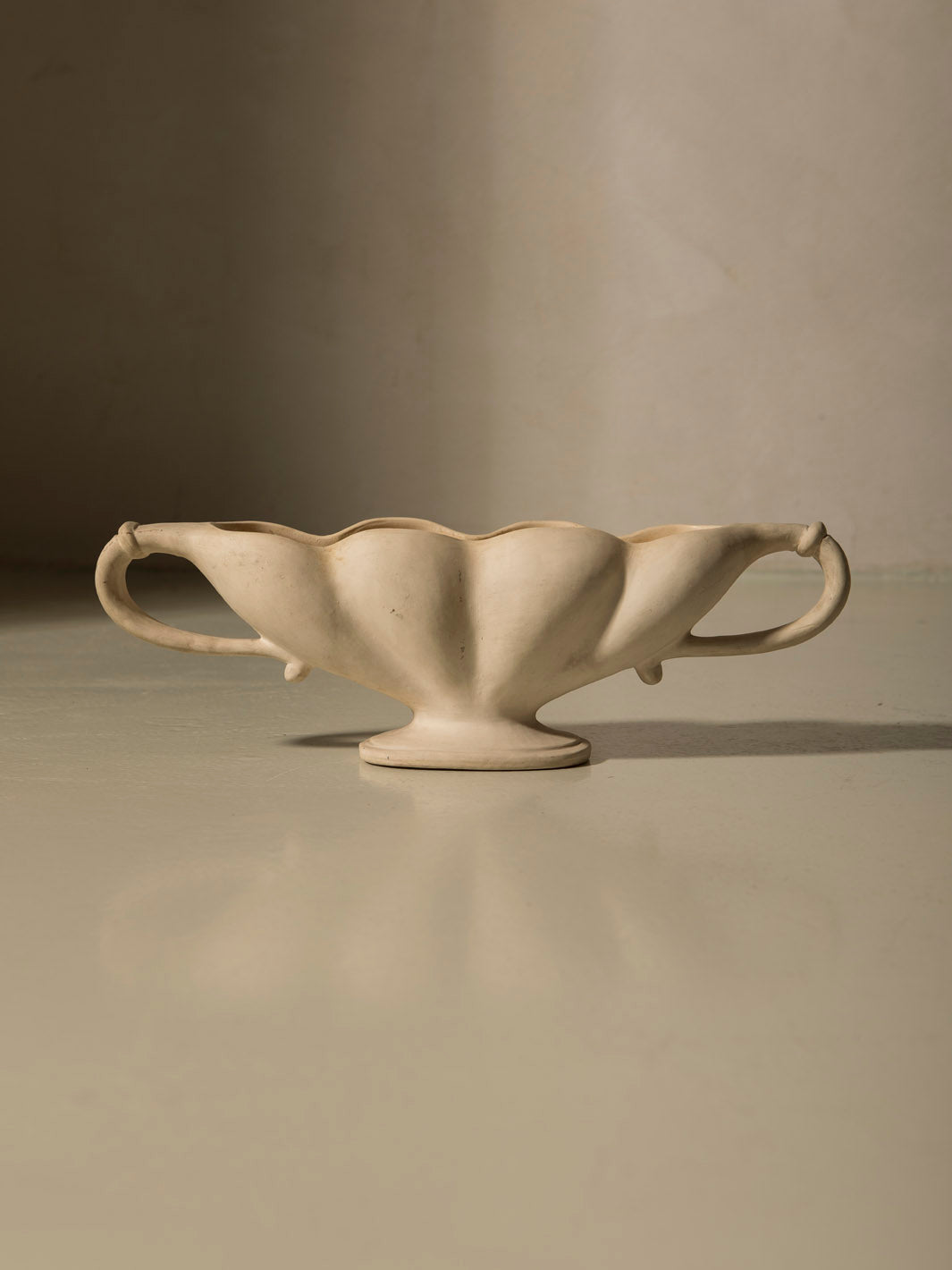 Vasija de cerámica blanca atribuida a los diseños florales de Constance Spry, realizada en la década de 1920. Cuerpo orgánico de líneas onduladas y asas extendidas, modelado en pasta cerámica con acabado mate. Base pedestal integrada y cavidad amplia, concebida para composiciones florales estructuradas, característica del trabajo temprano de Spry y de las piezas producidas para sus arreglos experimentales.