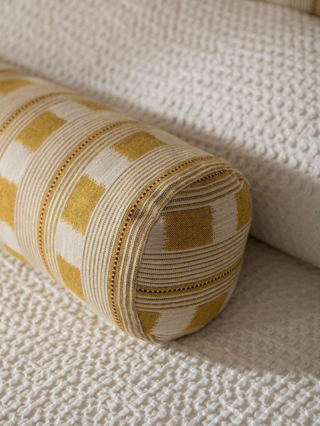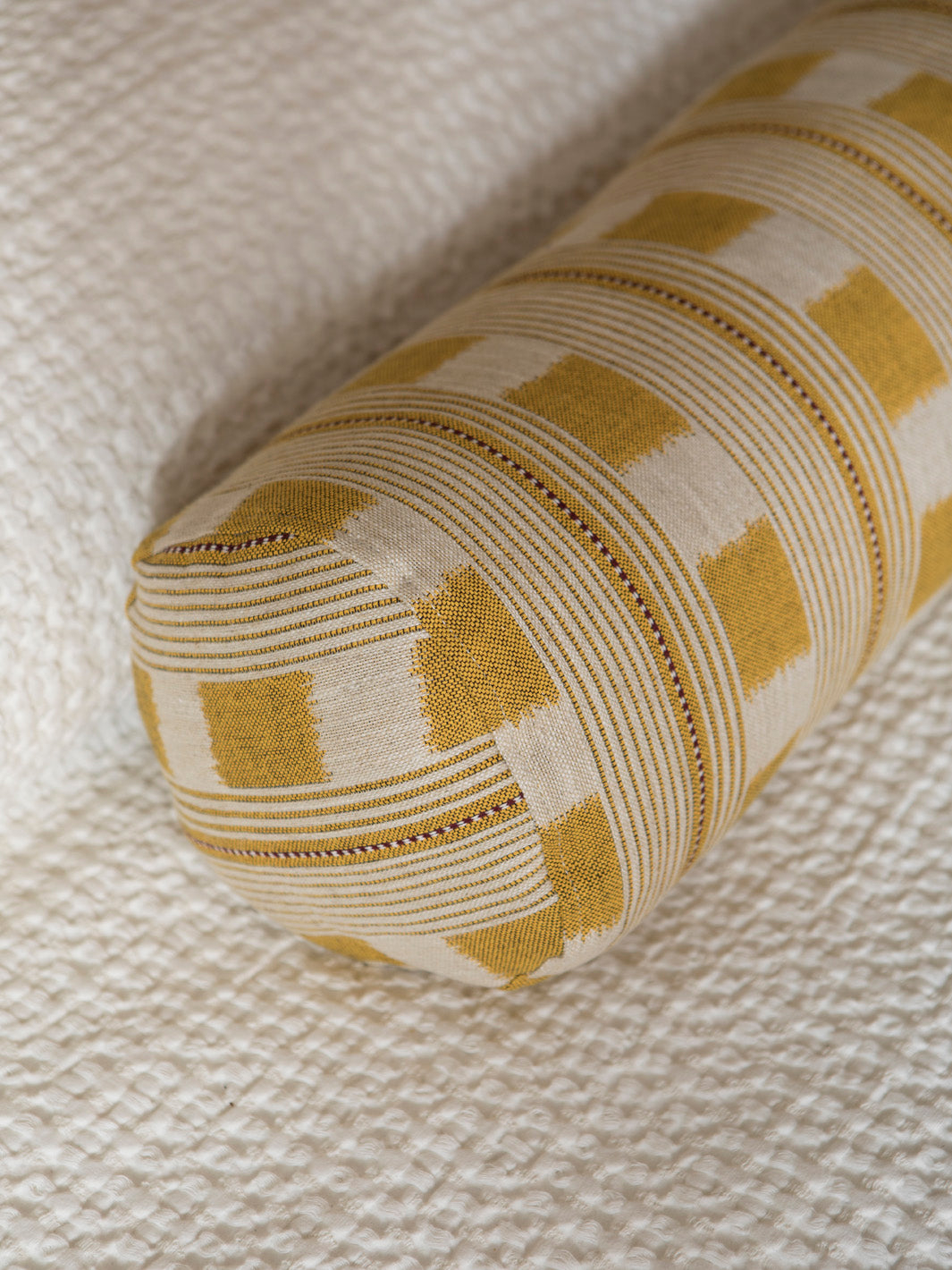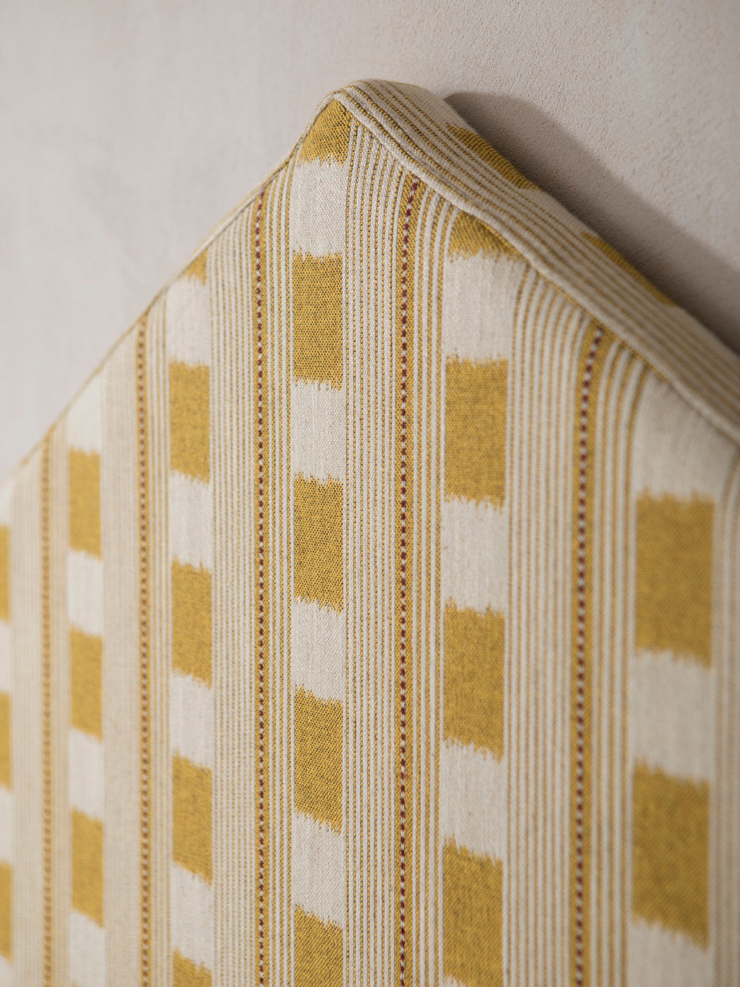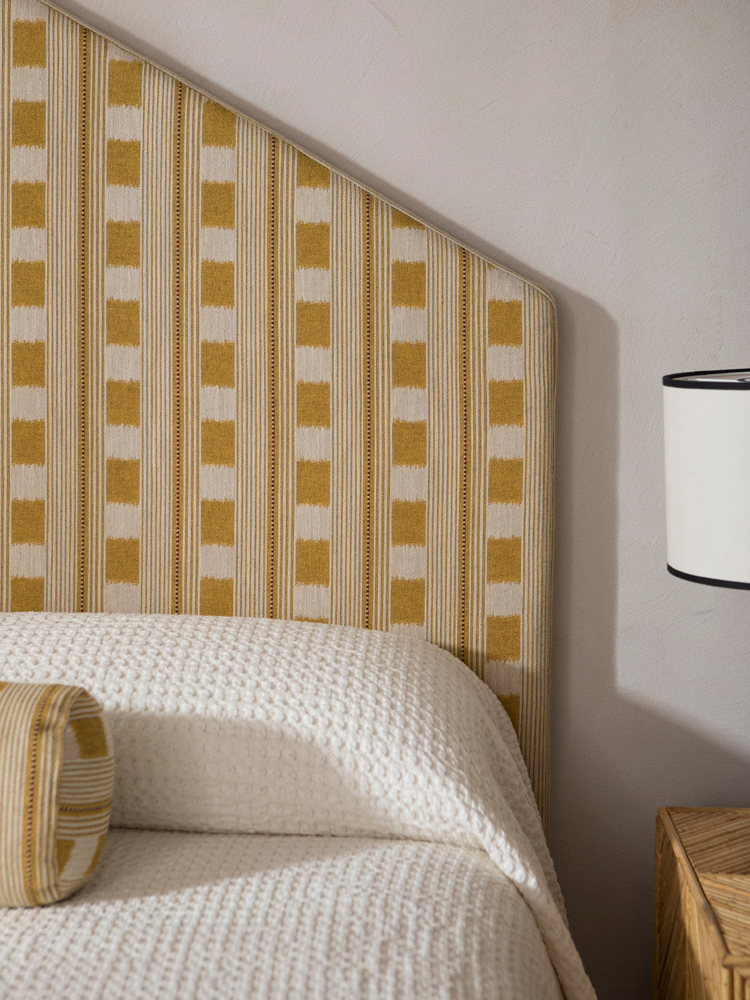 Upholstered pagoda-style headboard in fun colorful striped prints, with a washable and stain-resistant fabric. Includes a roll cushion. It's ready to hang on the wall using a simple anchoring system.