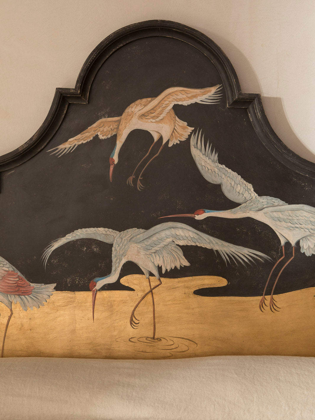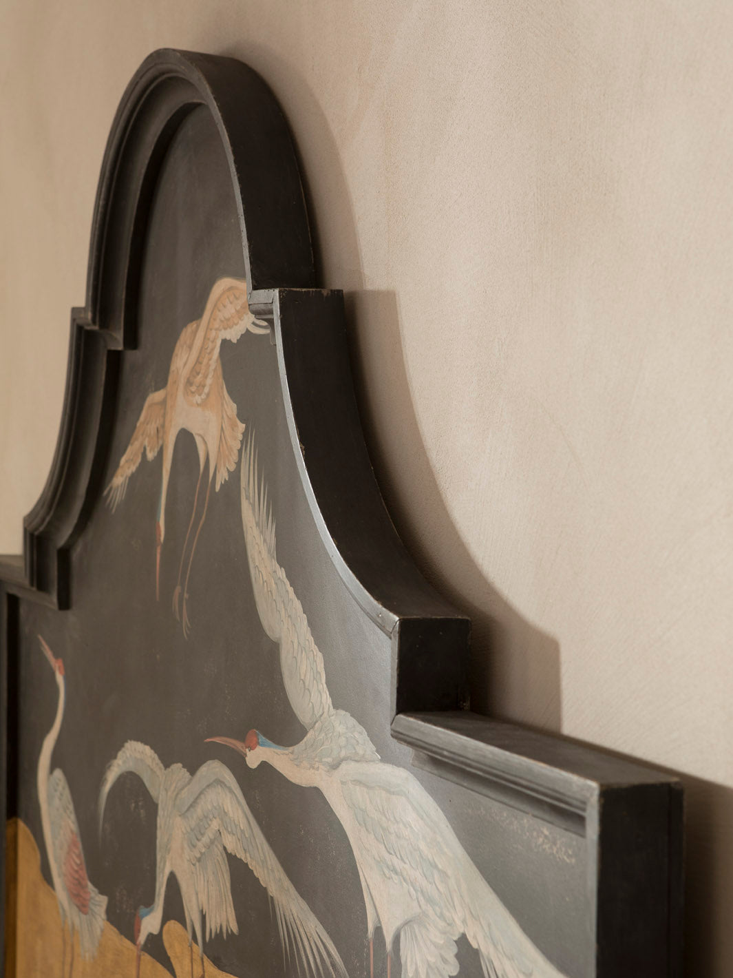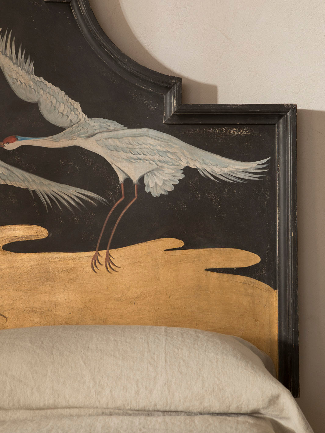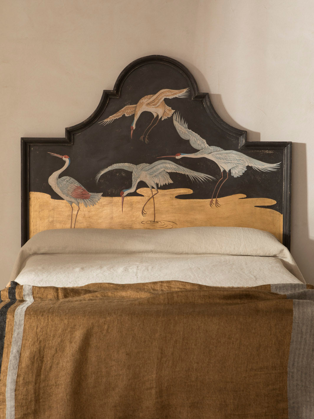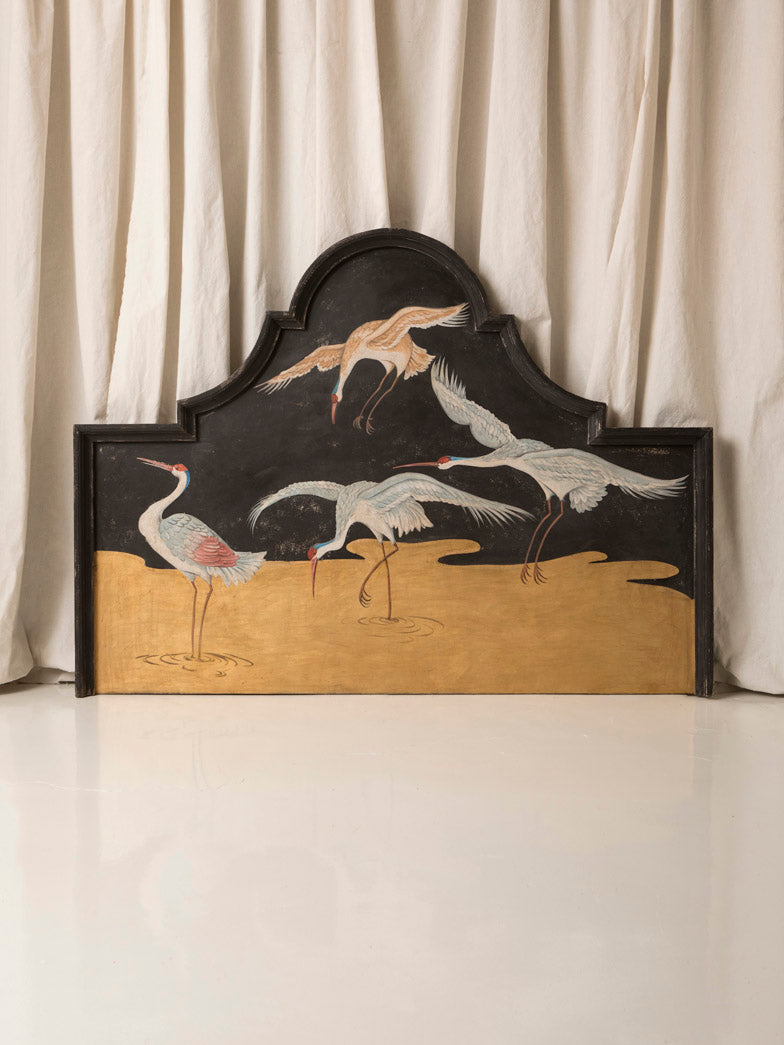 Original Florentine headboard, hand-carved in poplar wood and hand-painted with a delicate oriental heron theme.