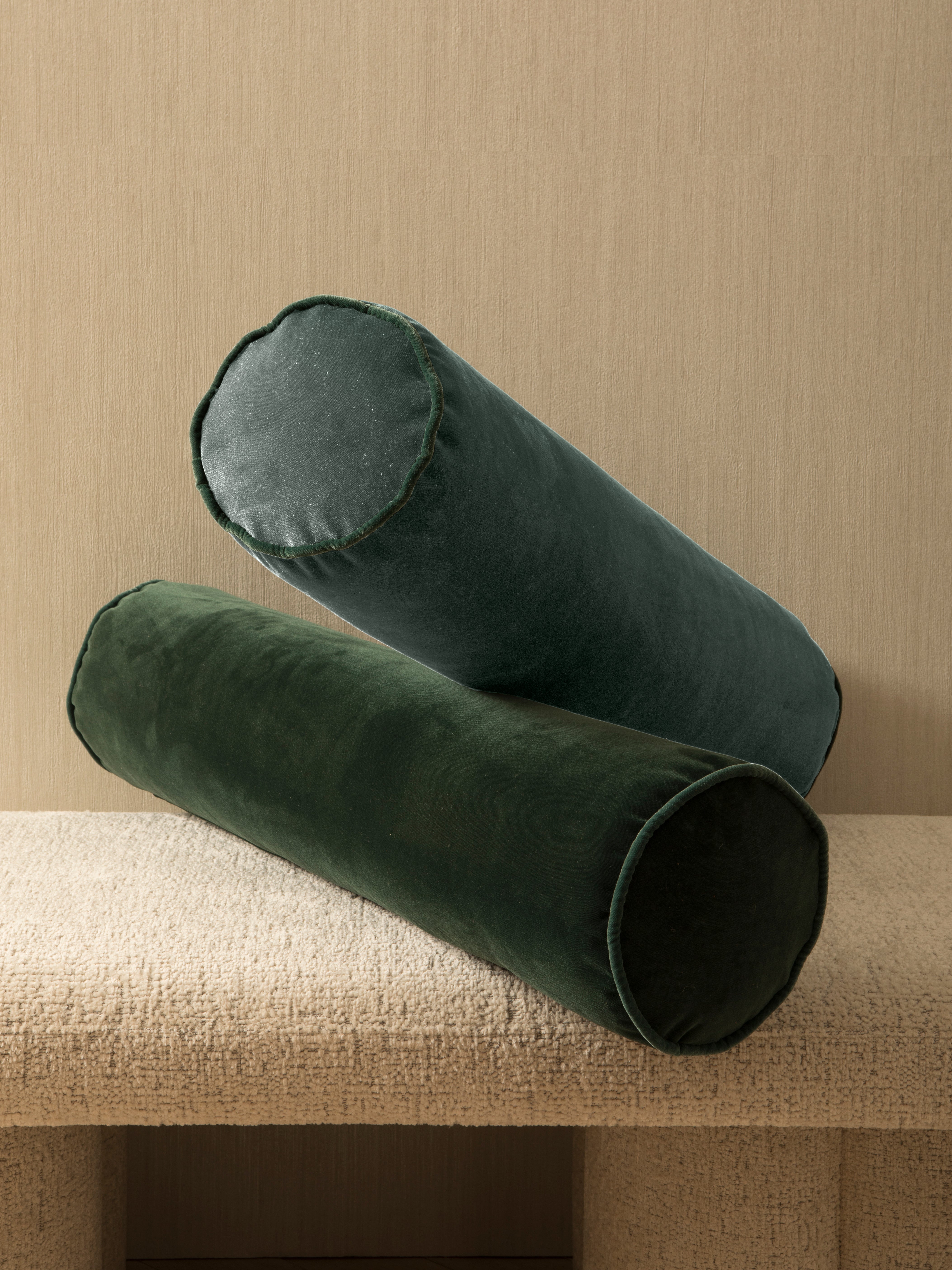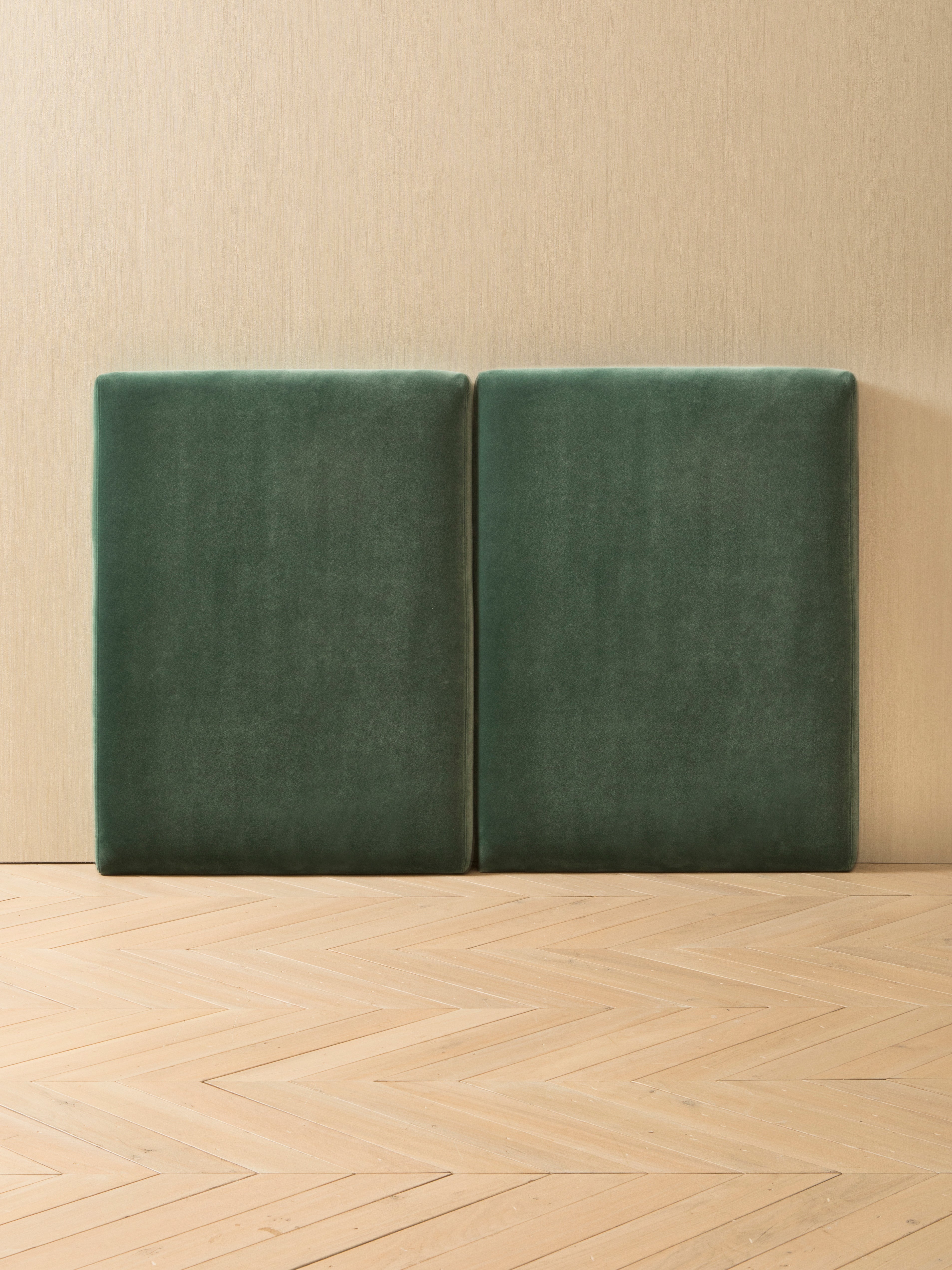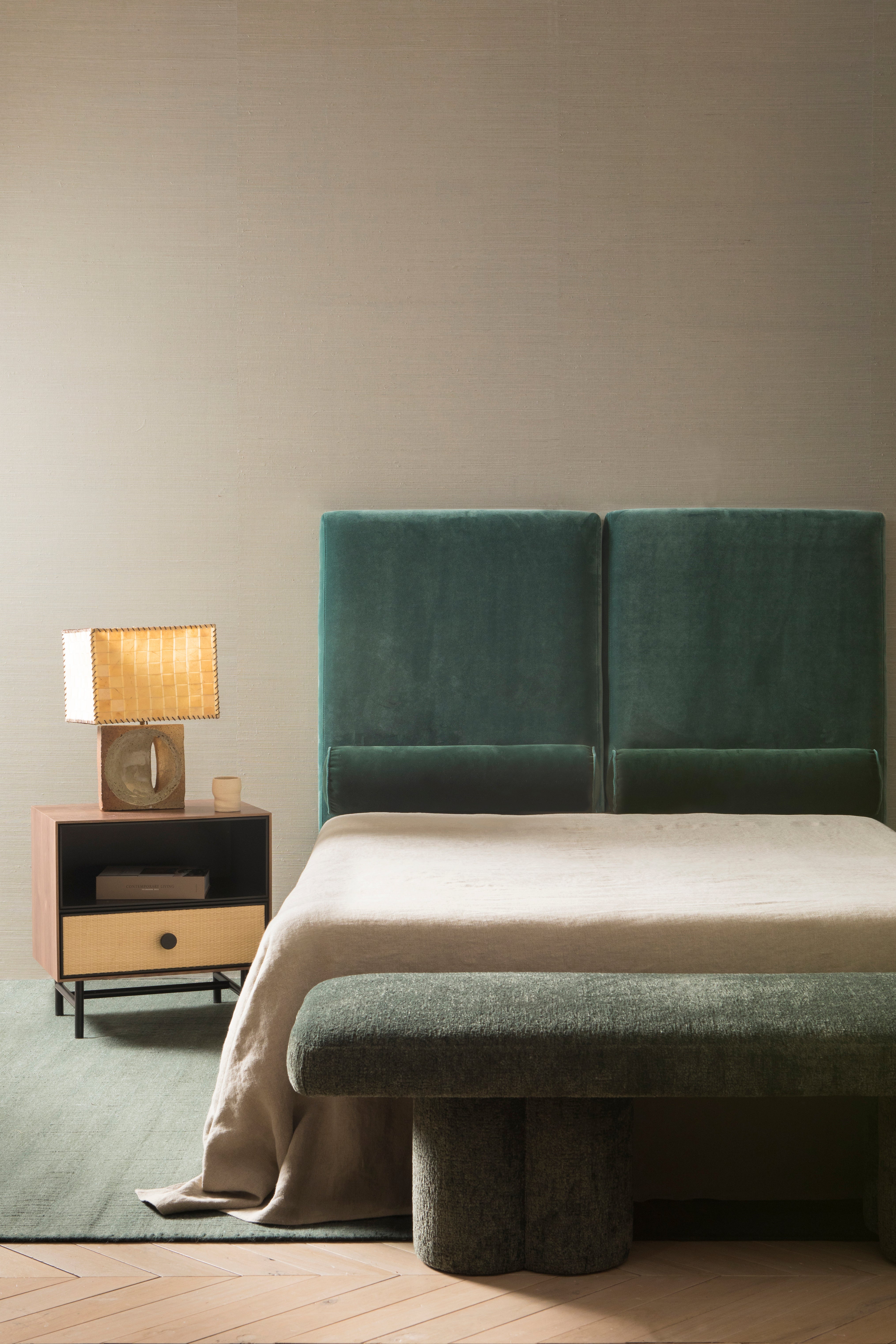 Its two-part structure allows you to play with subtle contrasts or create a serene continuity, choosing between the shades of Lagoon and Pine. The combination of both velvets reflects the fusion of depth and softness, while the monochromatic option emphasizes the purity of the form.