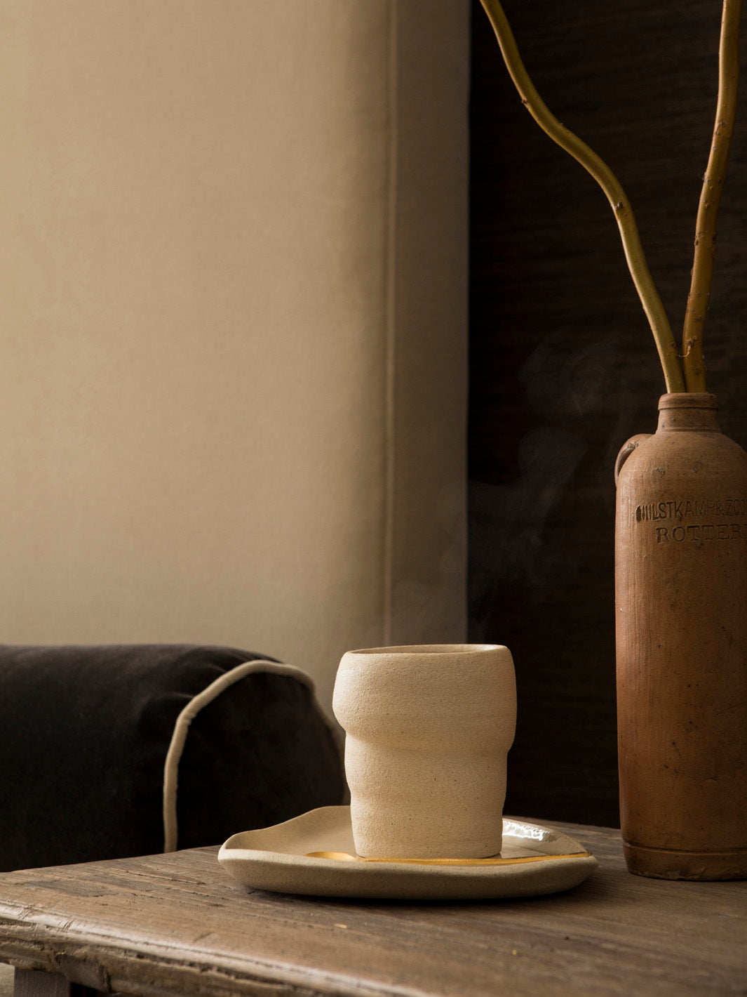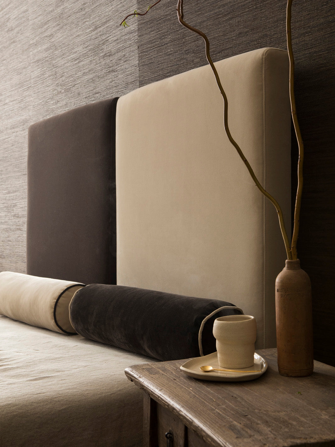 Its two-part structure allows you to play with subtle contrasts or create a serene continuity, choosing between the shades of Coffee (coffee brown) and Linen (beige). The combination of both velvets reflects the fusion of depth and softness, while the monochromatic option emphasizes the purity of the form.