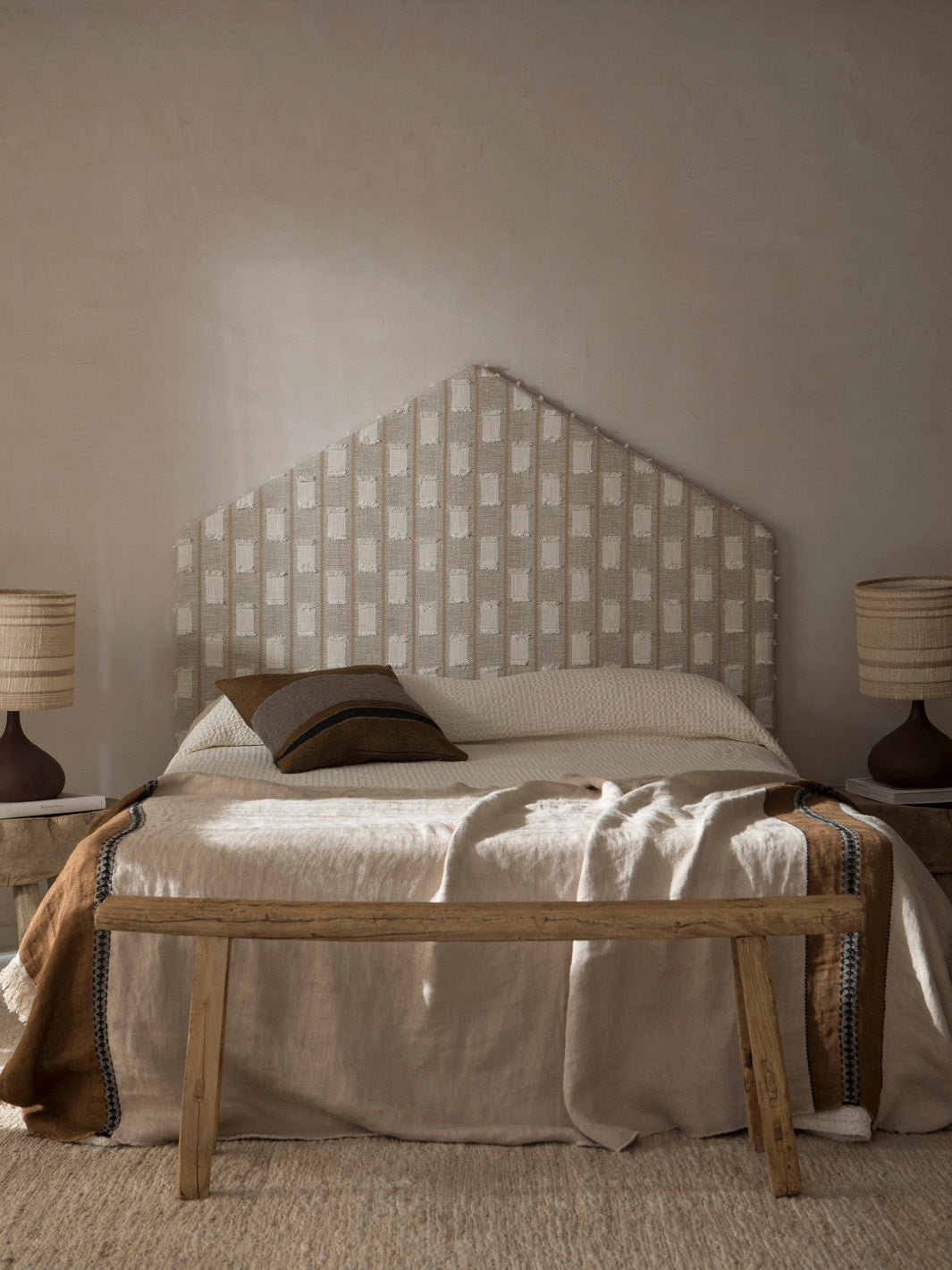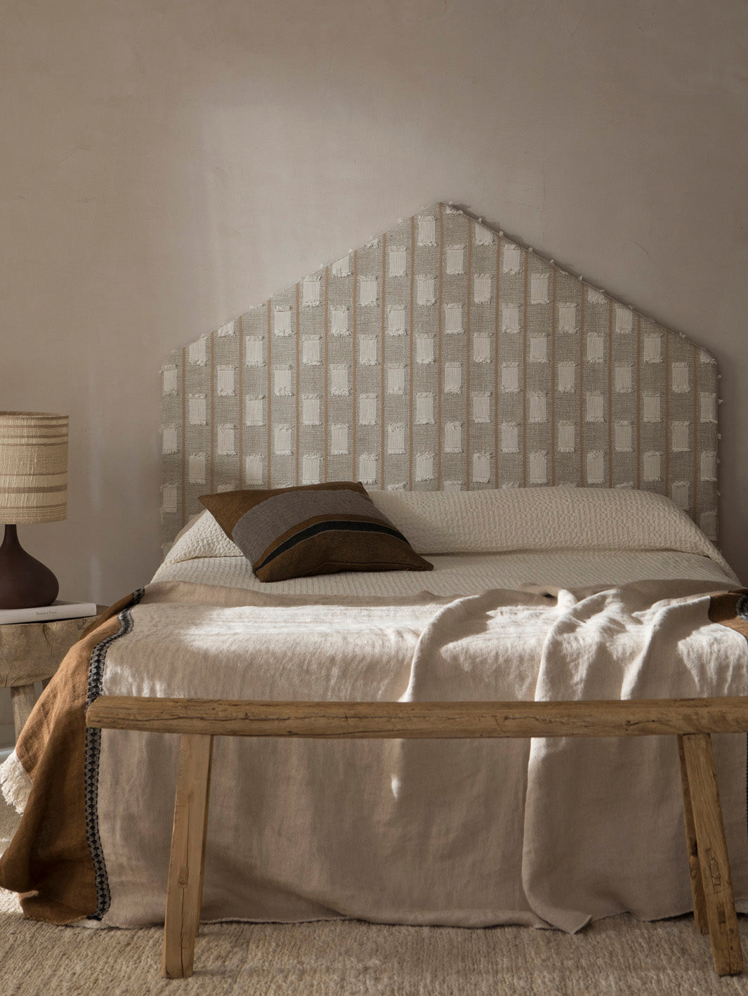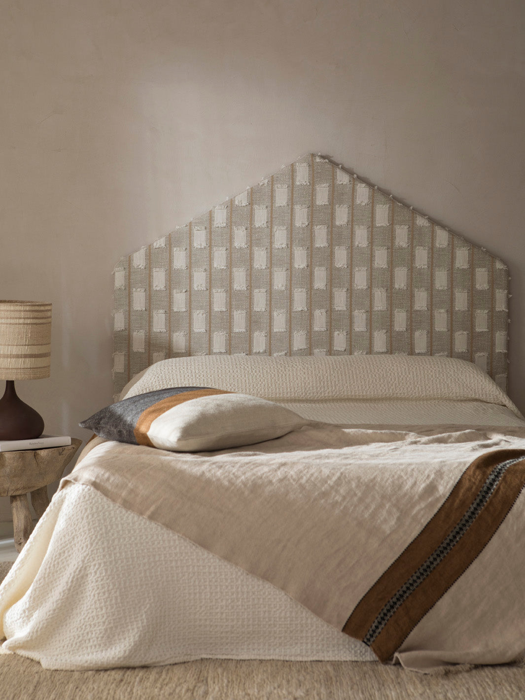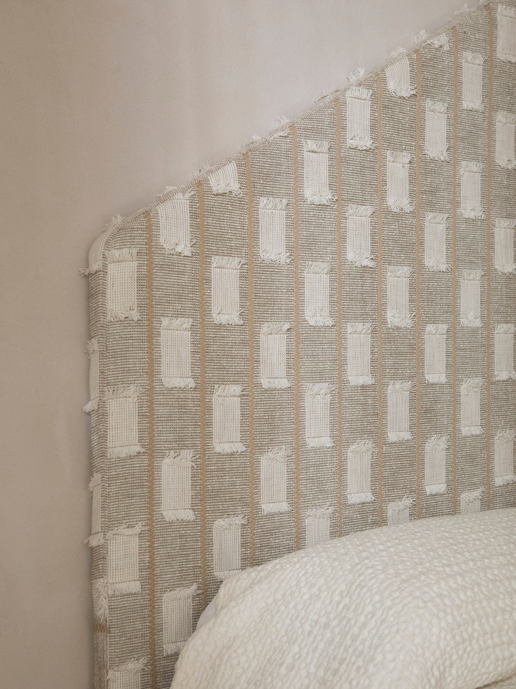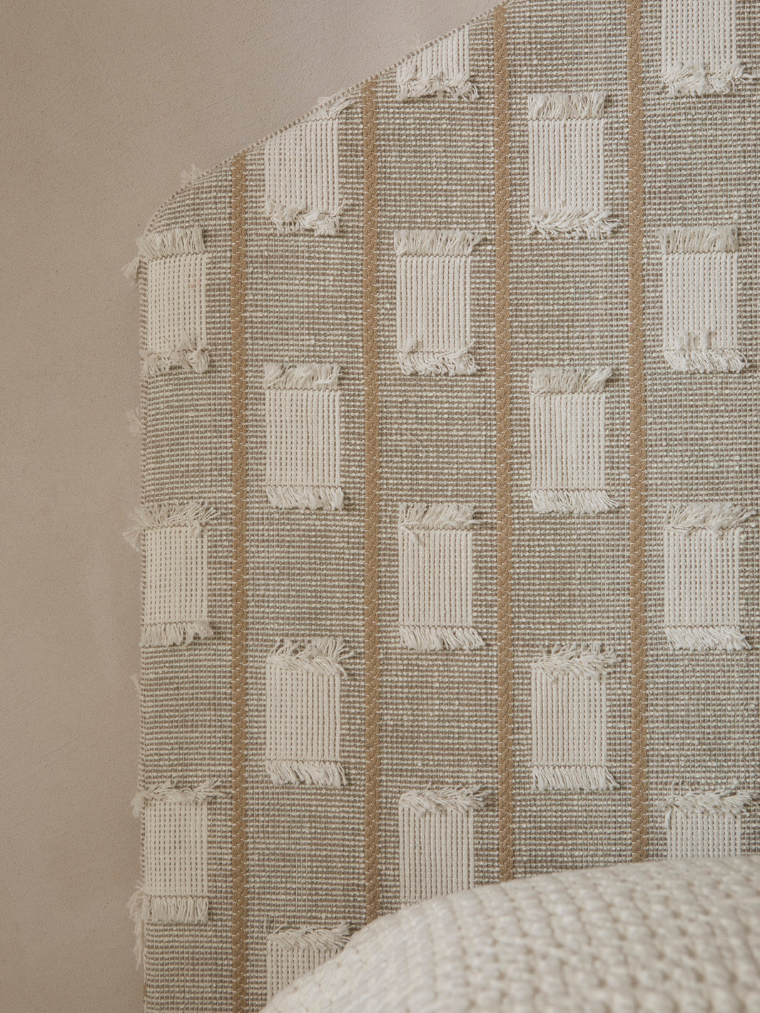 Pagoda headboard upholstered in unstructured cotton jacquard with cut threads. Ready to hang on the wall using a simple anchoring system.